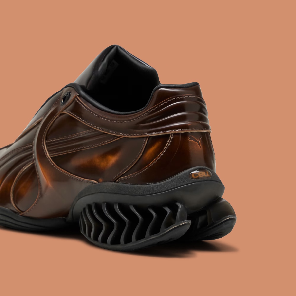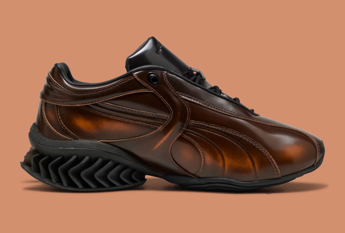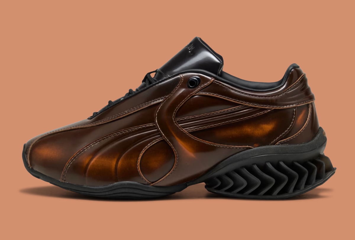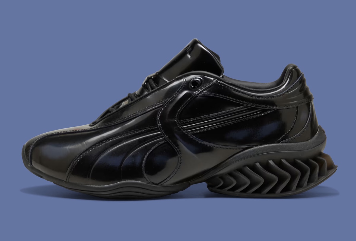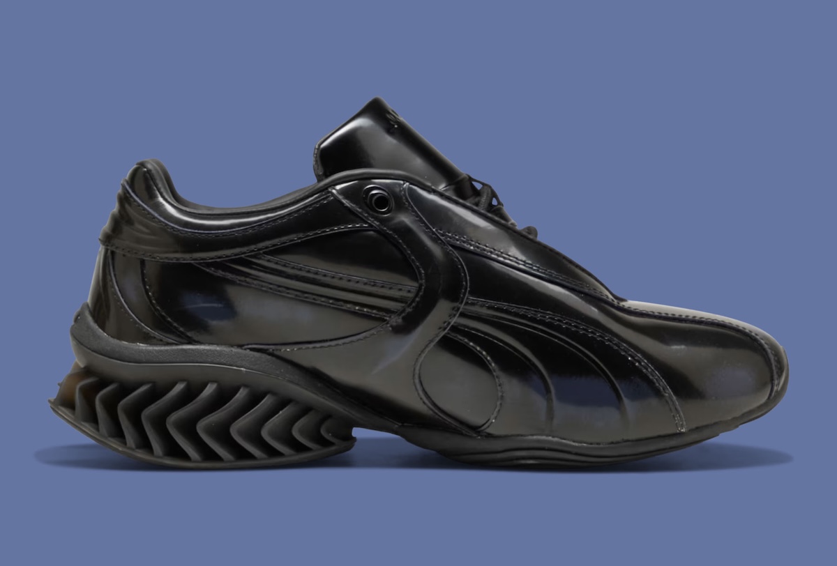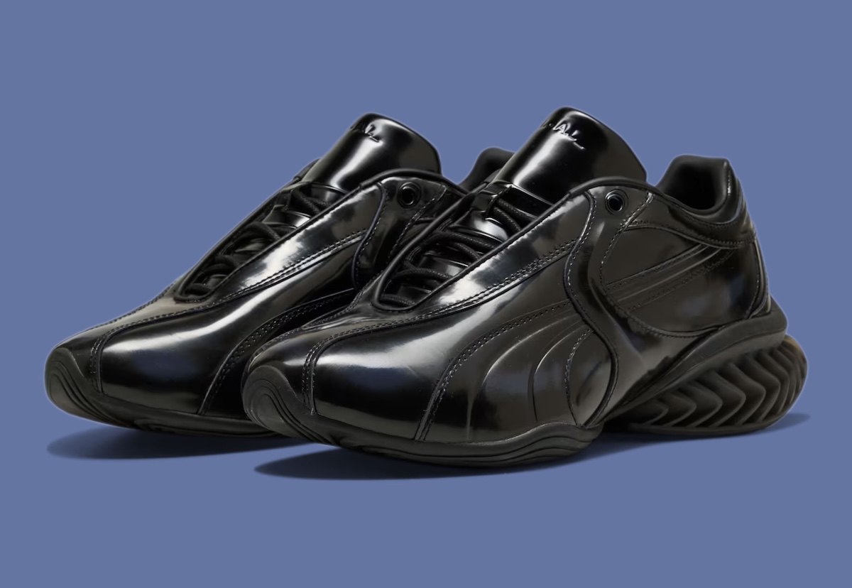 At the center of the project is the CELL Geo, a model grounded in PUMA’s 1990s cushioning system but reshaped with a more sculptural approach. The upper uses glossy patent leather designed to wear down gradually, revealing a hidden gradient beneath. That layered construction introduces a sense of evolution, where each pair develops a slightly different look with continued use.