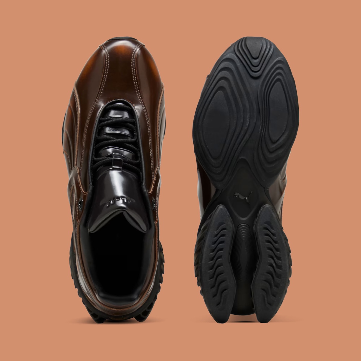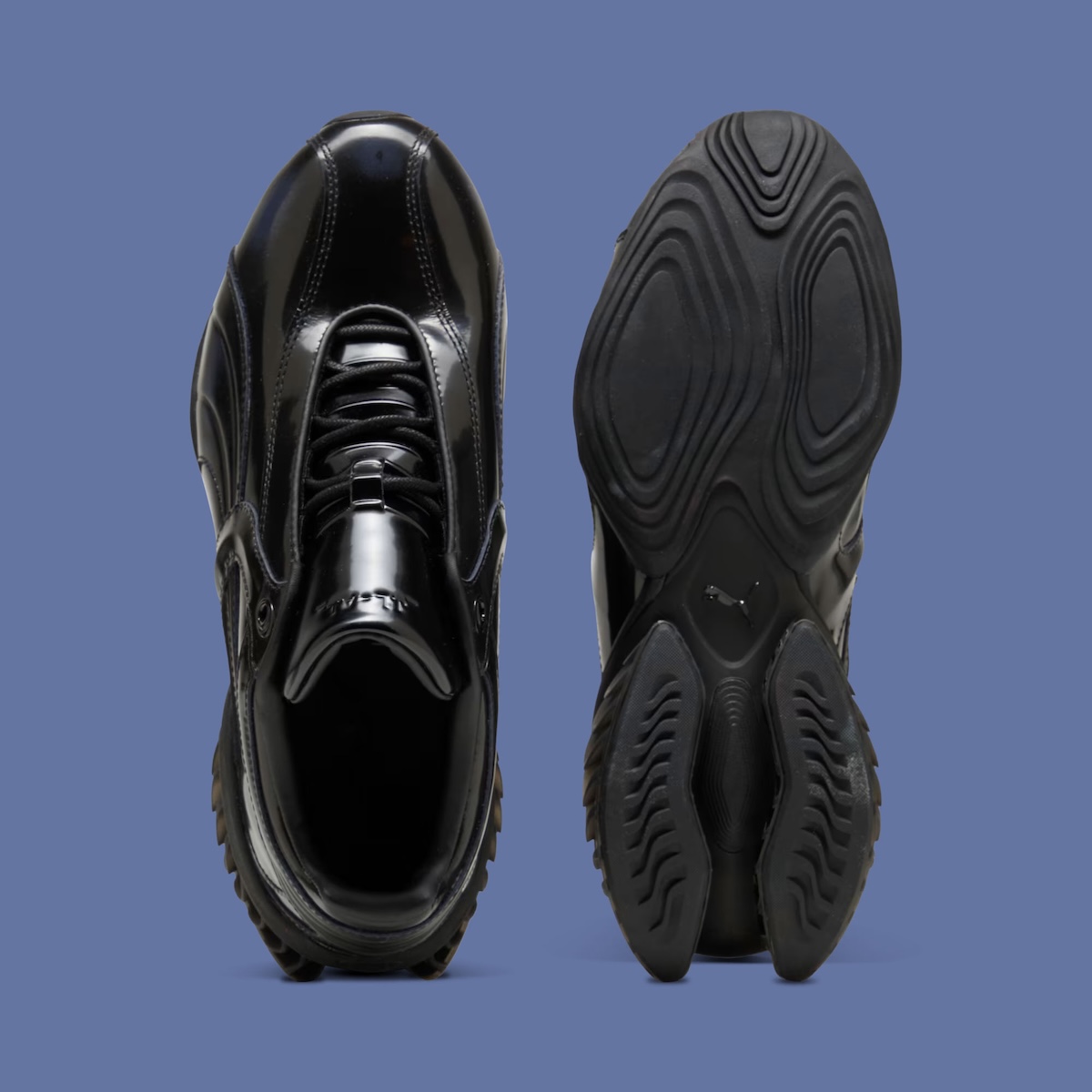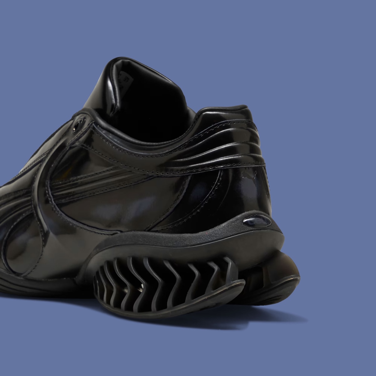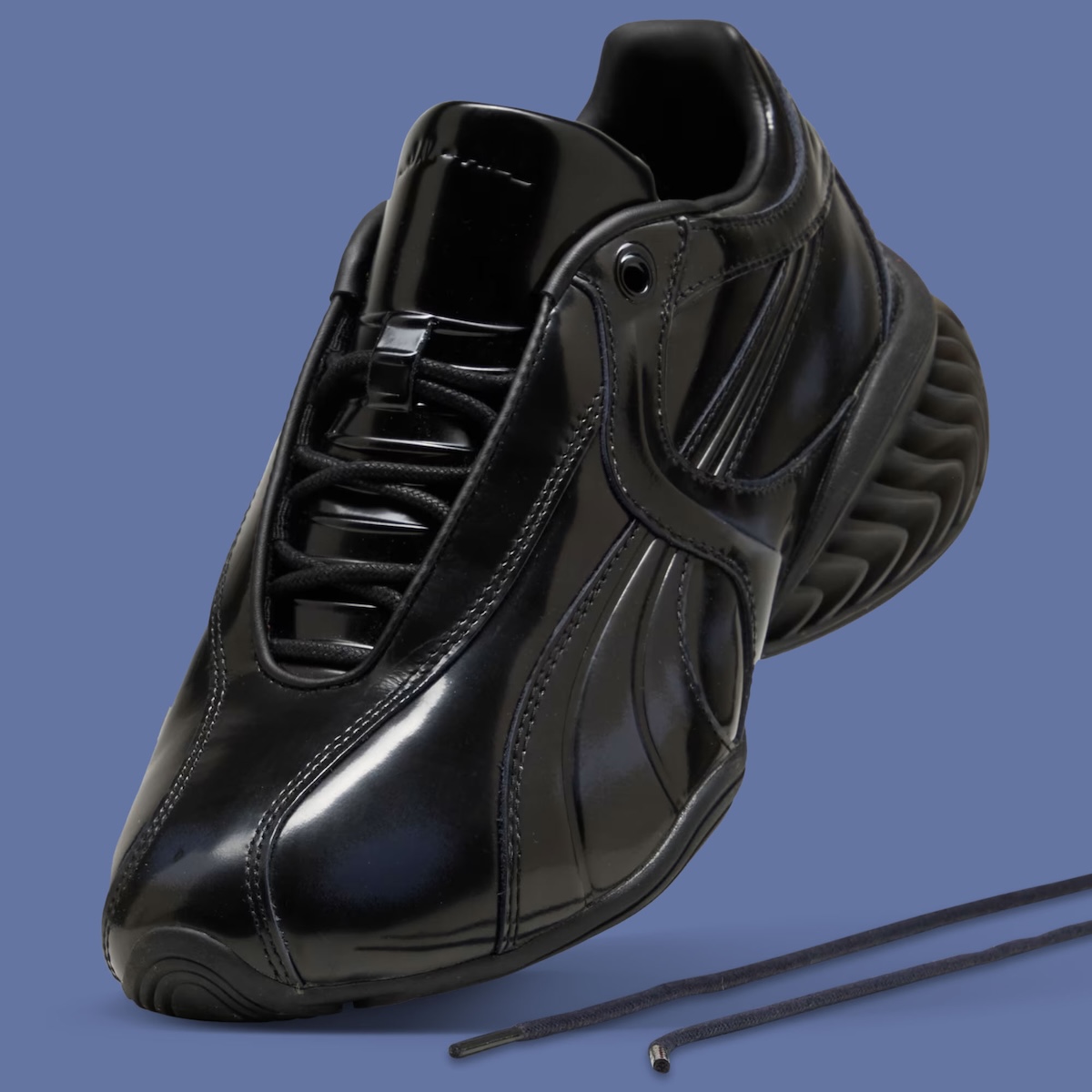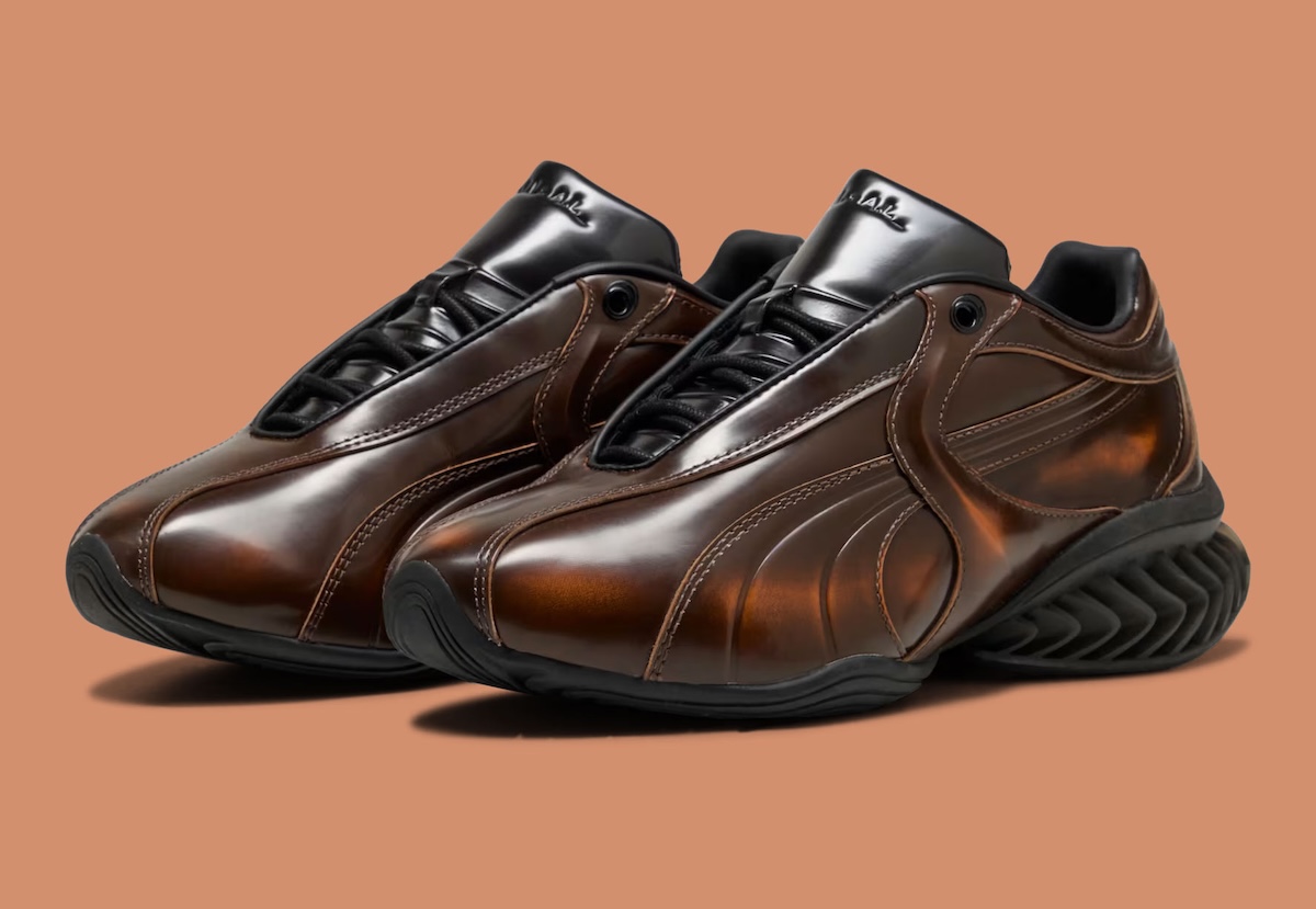 At the center of the project is the CELL Geo, a model grounded in PUMA’s 1990s cushioning system but reshaped with a more sculptural approach. The upper uses glossy patent leather designed to wear down gradually, revealing a hidden gradient beneath. That layered construction introduces a sense of evolution, where each pair develops a slightly different look with continued use.
