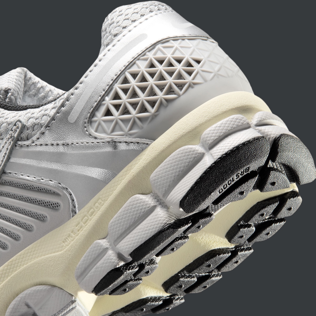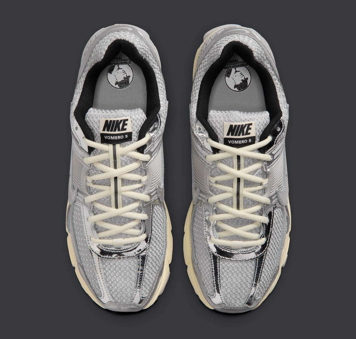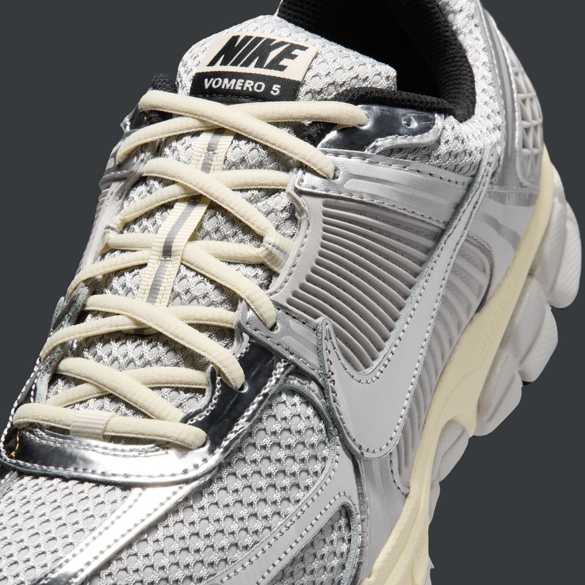 The Nike Zoom Vomero 5 “Grey Fog/Metallic Silver” keeps its classic layered feel with a Grey Fog mesh base that looks light and easy to wear. Metallic Silver panels add structure without feeling heavy, while Chrome hits on the Swoosh and front catch light in a way that feels natural, not overdone. It’s shiny, but still calm.