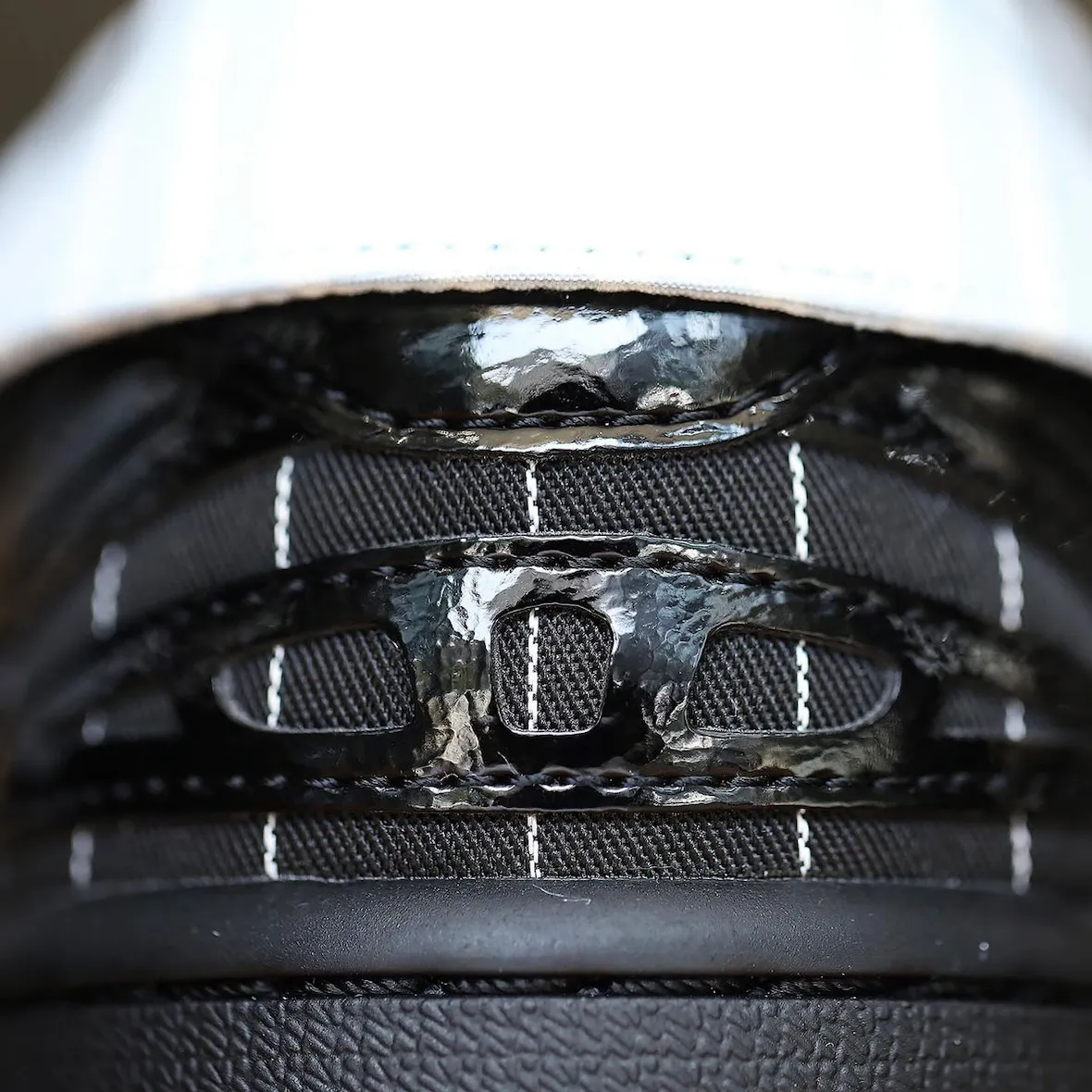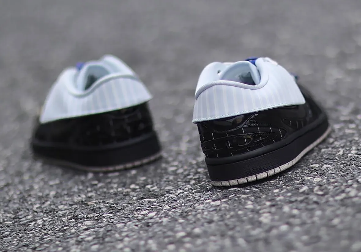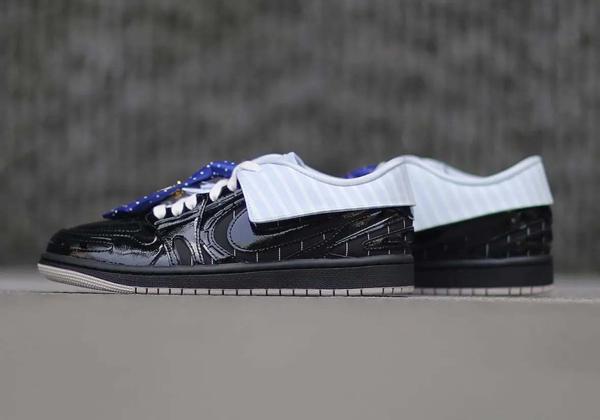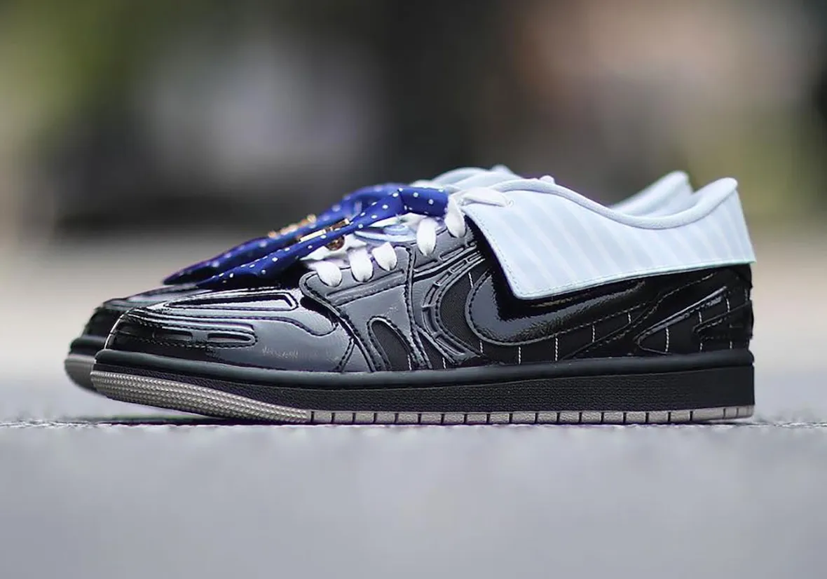 That theme continues across the upper. Pinstripe panels nod to suiting fabrics, while glossy black patent leather brings a polished finish. A subtle grey outsole balances the look, keeping the design grounded despite its playful concept.
