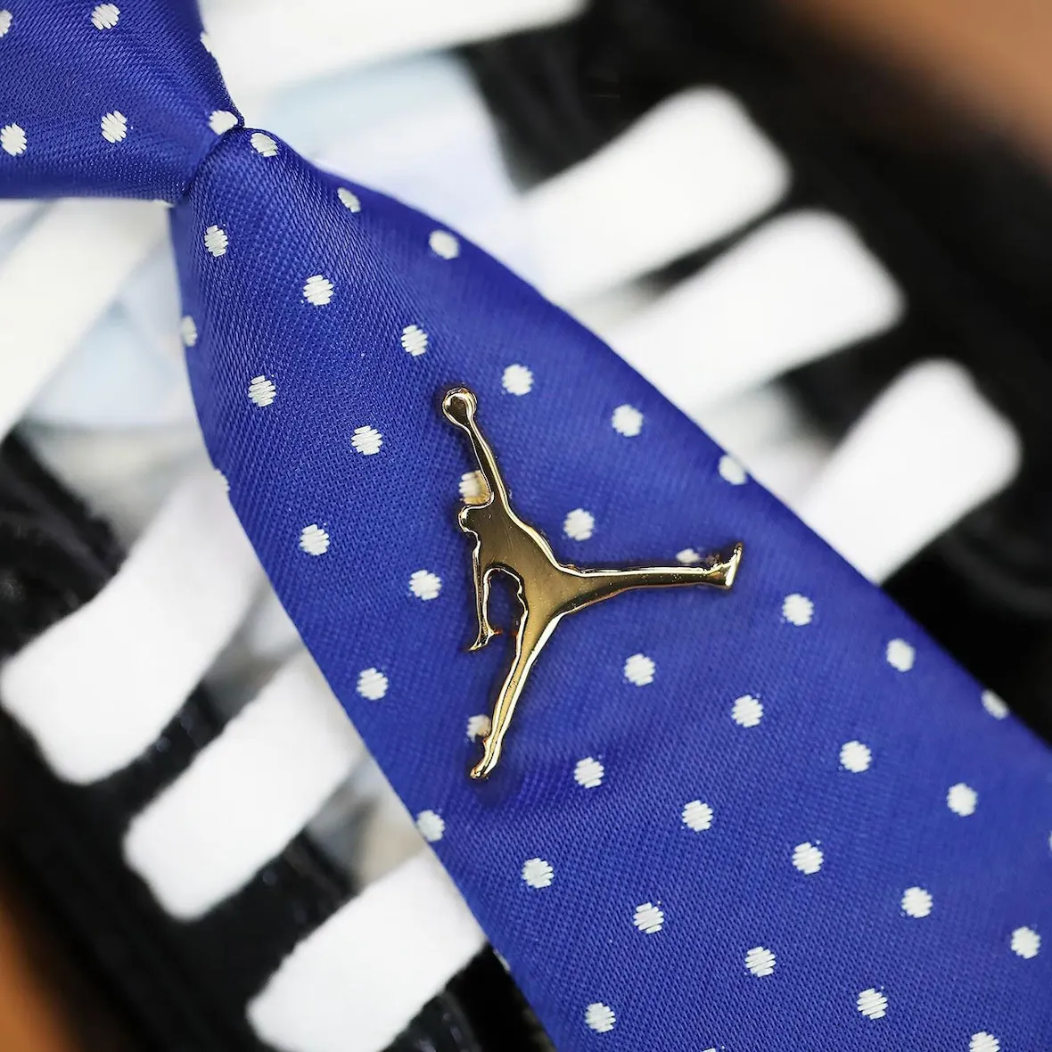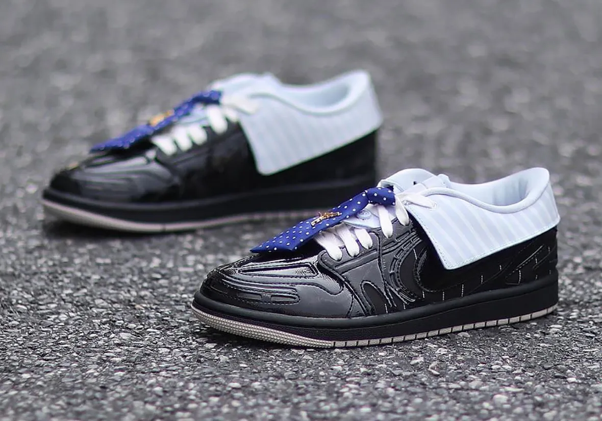 The standout detail is impossible to miss. The heel features extended paneling shaped like a shirt collar, complete with a button detail woven into the lacing system. A polka dot lace accessory mimics a tie, while a gold Jumpman brooch adds to the dressed-up look. It’s a bold execution that pushes the boundaries of what sneaker design can represent.