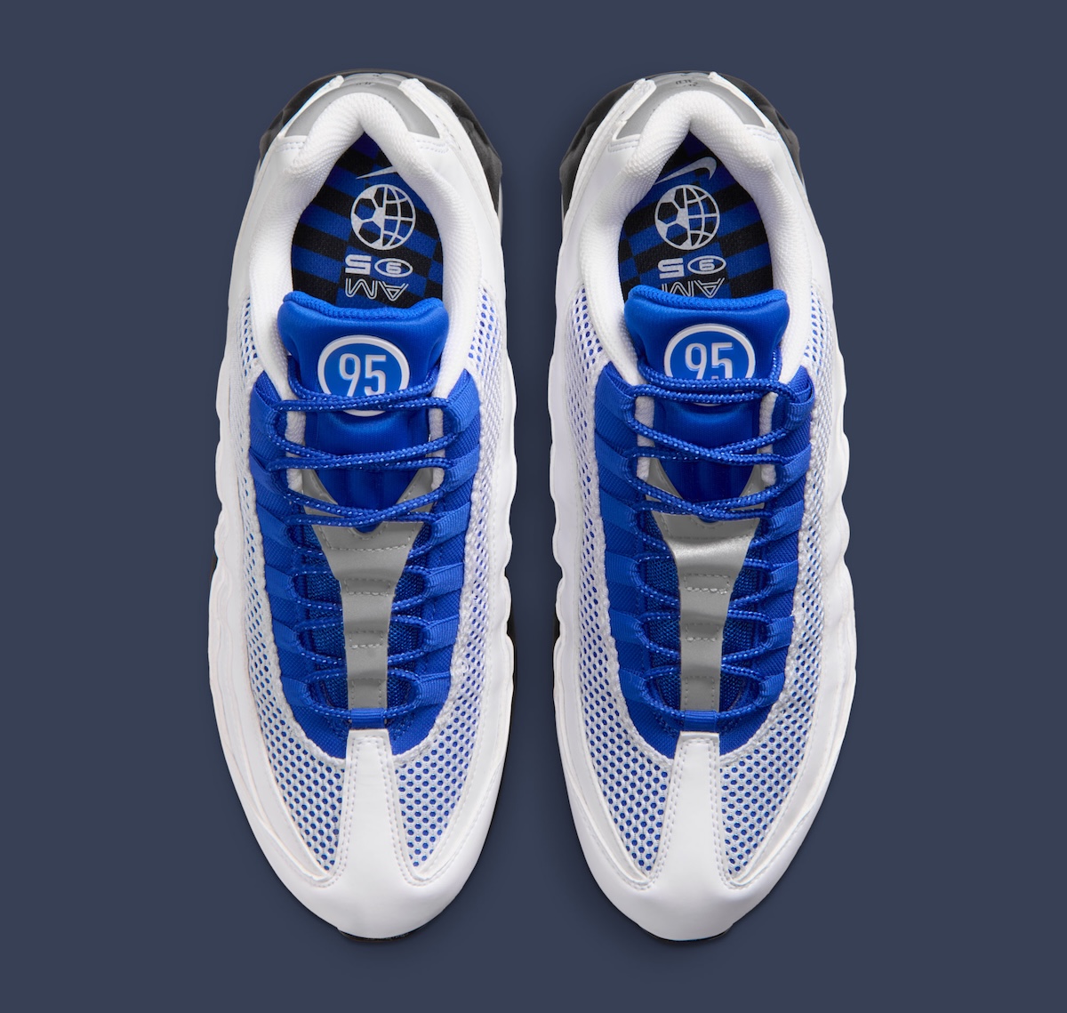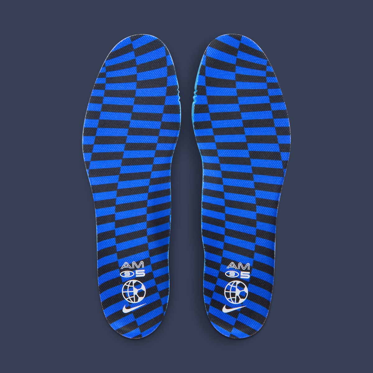 The smaller details do a lot for this release. Metallic Silver shows up on the lace loops and heel spine, which gives the design a clean early-2000s edge. The circular “95” badge on the tongue is the clearest Total 90 nod, and the checkerboard-style insoles push that football reference further.