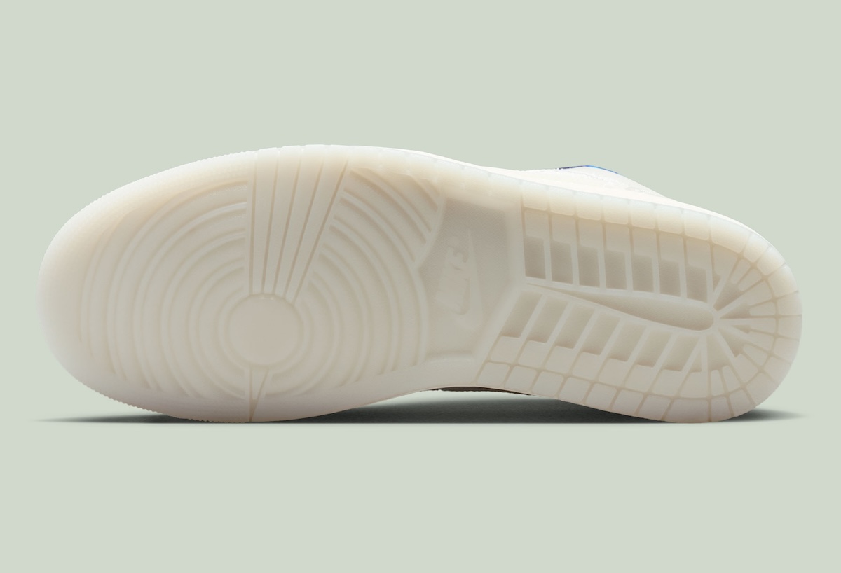 Colors eventually make their way to areas they should be. Blue, teal, navy, and white embrace the collar lining while painting the Wings logo on the heel. This splash of cooler tones gives this AJ1 some life without being overwhelming. Even more personality can be found with a mini Swoosh by the toe and exposed stitching details.