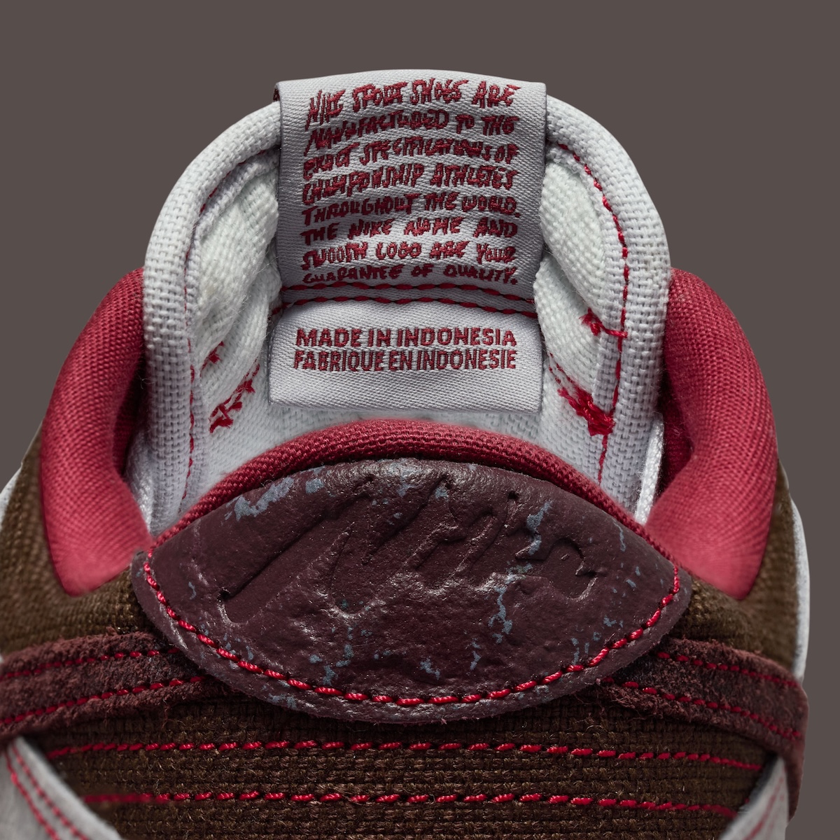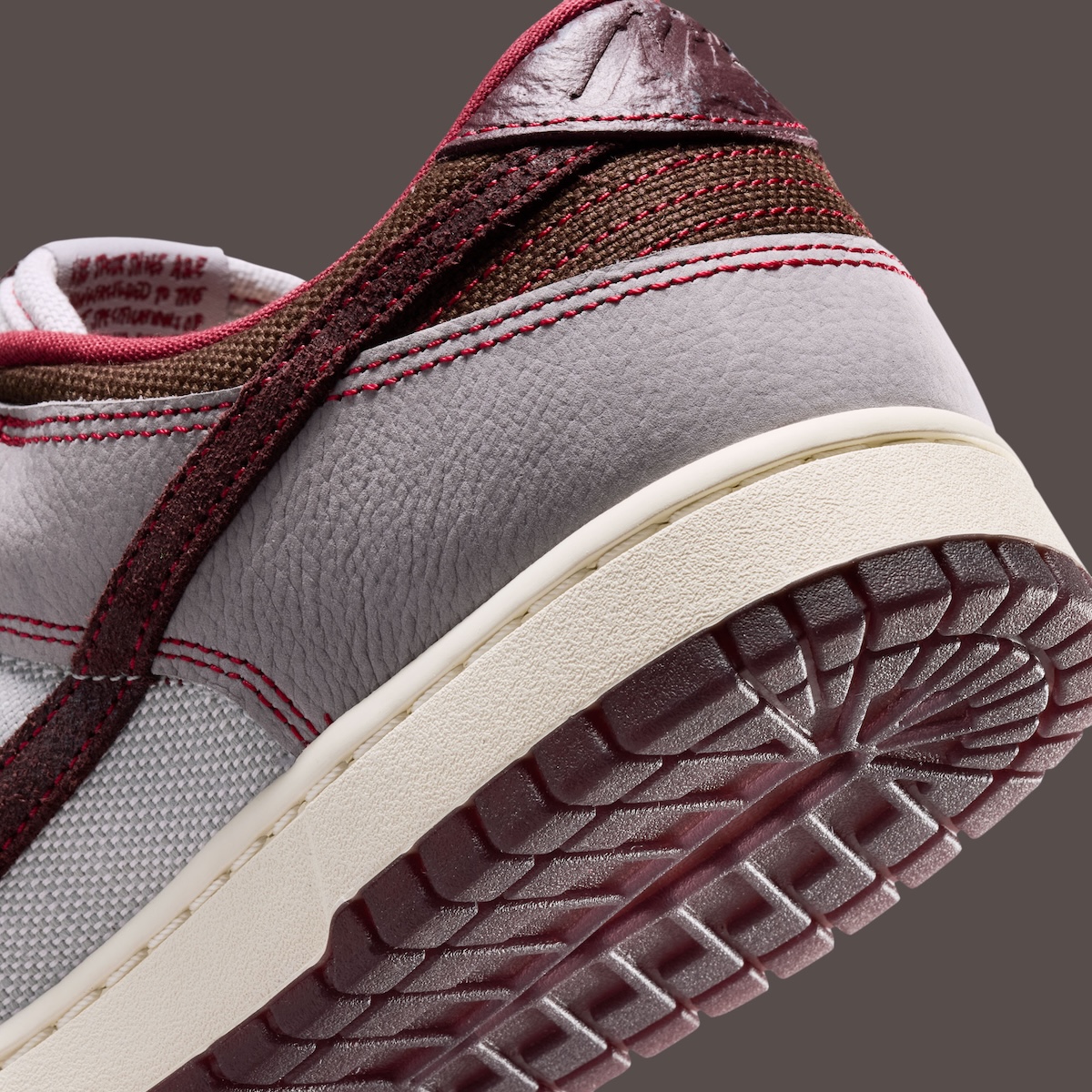 Light grey and off-white canvas can be found up top over the toe box, sides and tongue. That one change does a lot. The shoe feels less crisp than a usual Dunk and a little more lived-in. It has that slightly aged look without trying too hard to sell the point.