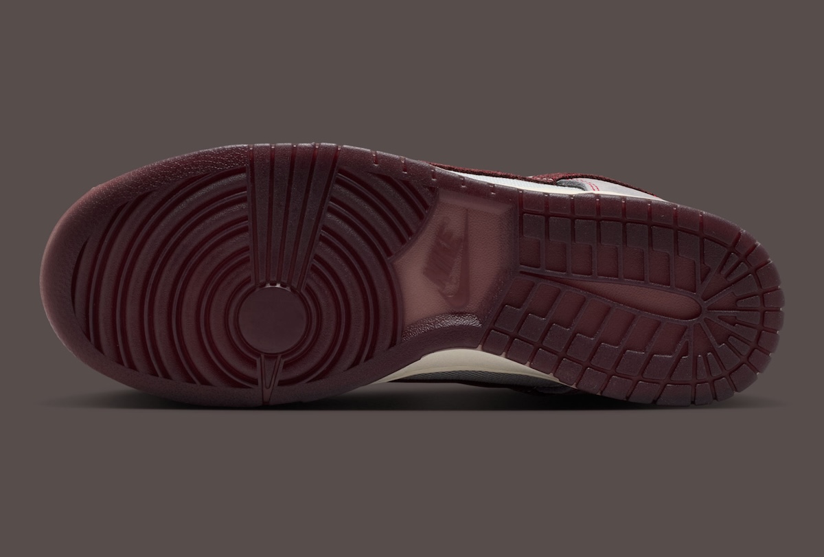 Pure Platinum and Wolf Grey overlays add the structure. Suede and tumbled leather break up the upper, while Team Red stitching outlines the panels in a way that feels sharp but not loud. The stronger contrast comes from the Burgundy Crush hits on the Swoosh, lining, heel tab, and outsole.