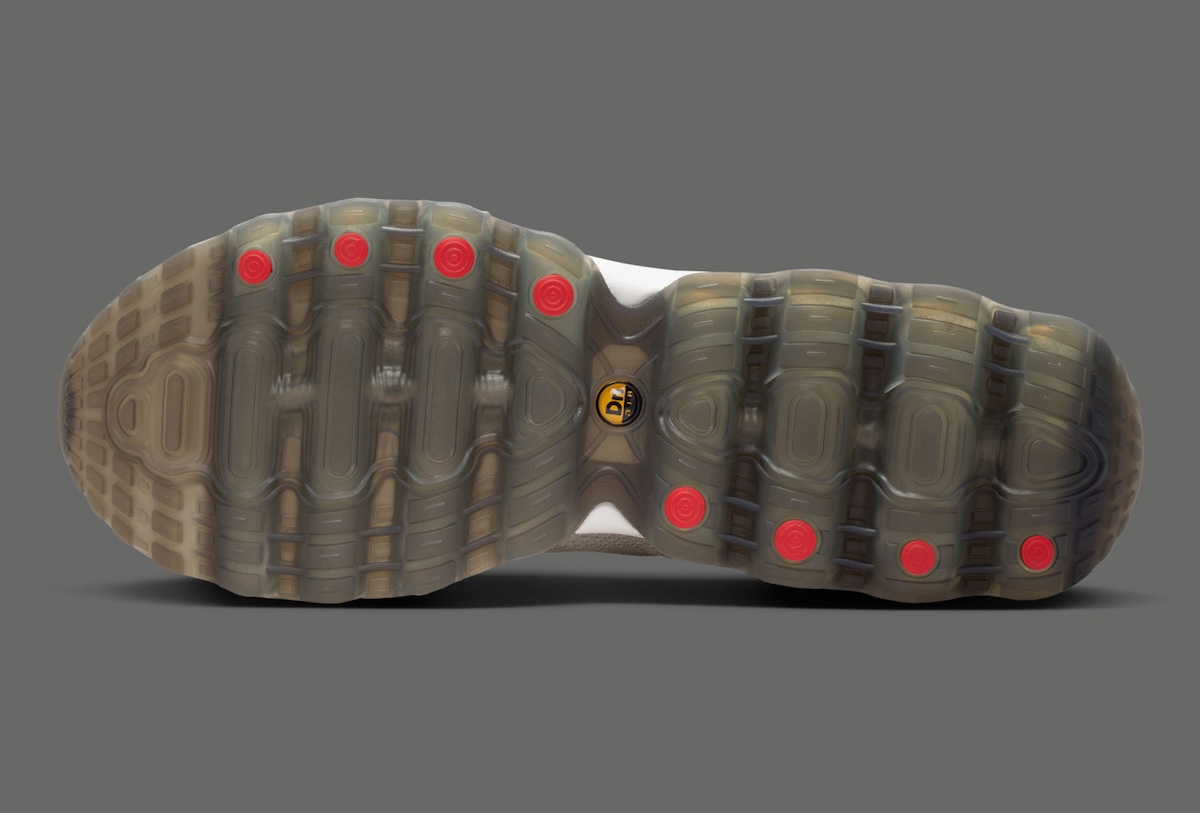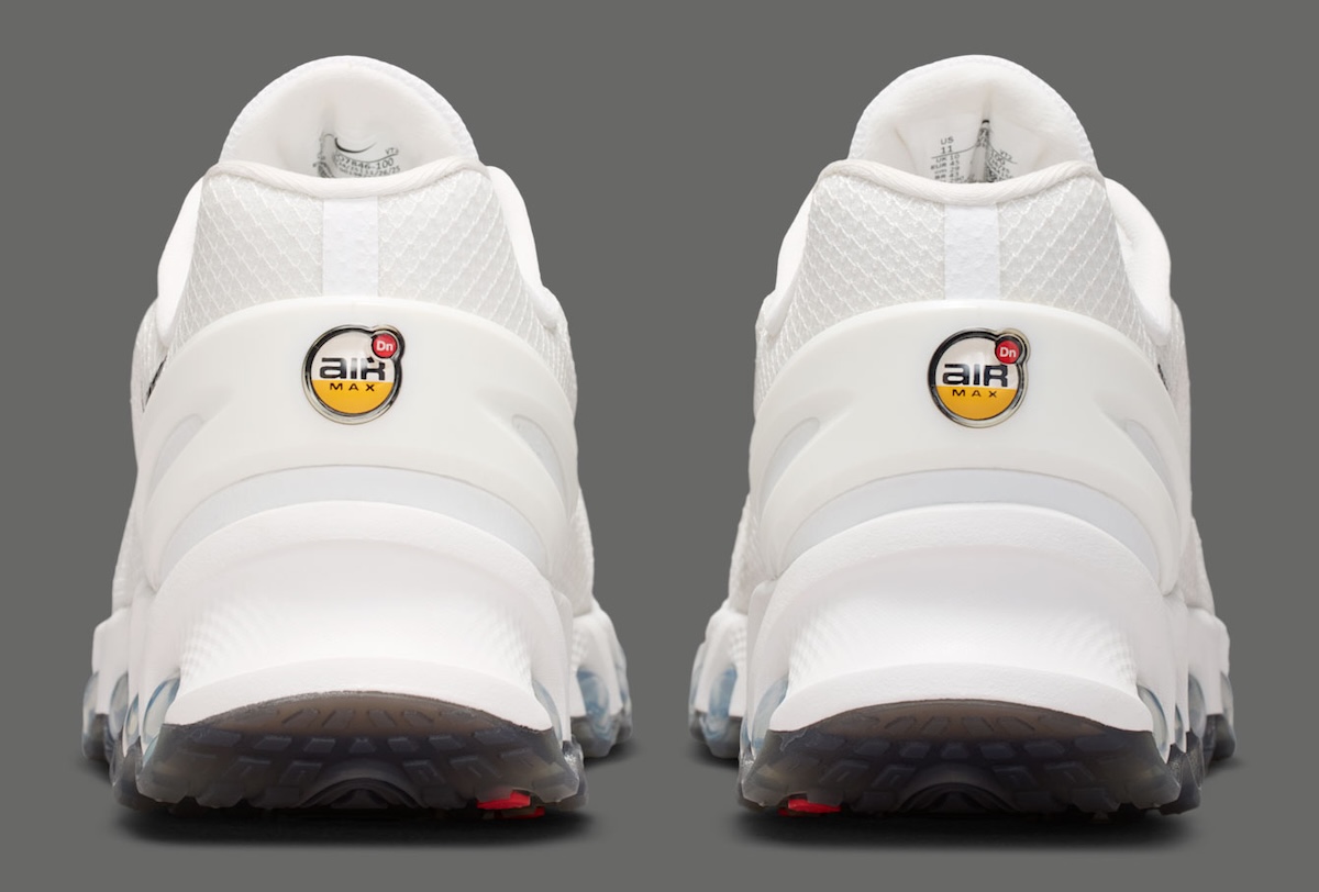 Underneath, the white midsole works with a full-length Dn Air setup featuring icy blue-tinted chambers and a smoky translucent outsole. Red traction pods add one more layer of contrast.