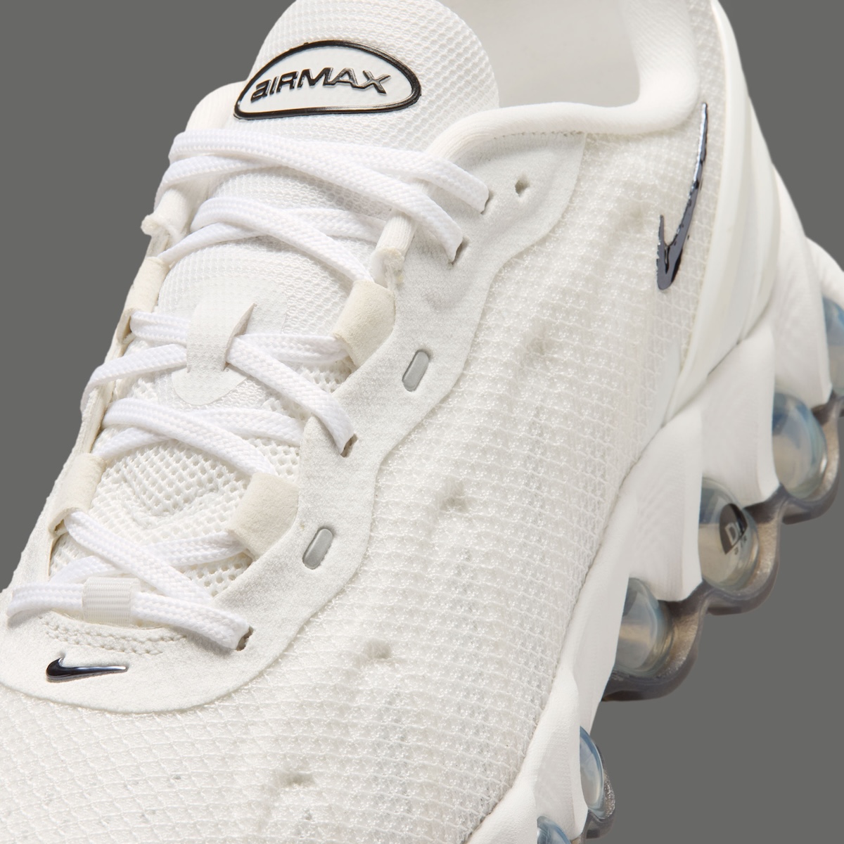 This Air Max Dn8 features a Summit White mesh upper finished with a textured grid pattern. The technical mesh upper appears lightweight while molded ridges resembling waves add dimension across the sides of the silhouette. A soft eyestay overlay also raises the profile subtly without distracting from the pared-back construction.