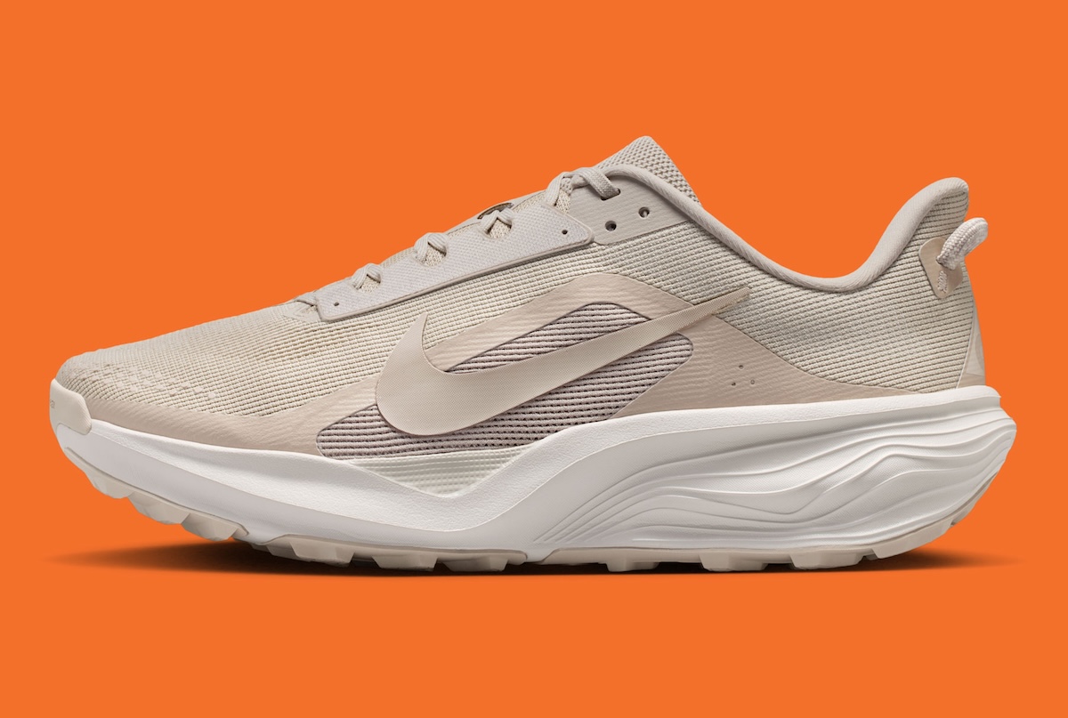 Across the upper, the palette stays understated and easy to wear. Cream covers most of the knit and mesh build, while Light Orewood Brown lands on the molded eyestays, side panels, and oversized Swoosh. That balance gives the trail shoe a refined look, but it still feels functional rather than dressed up.