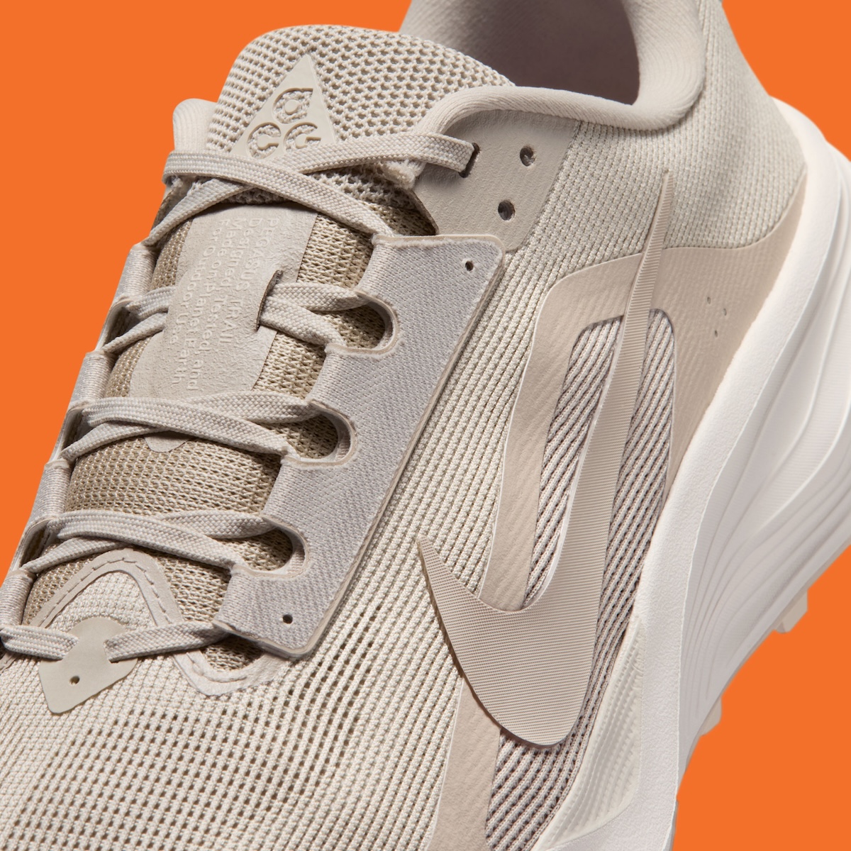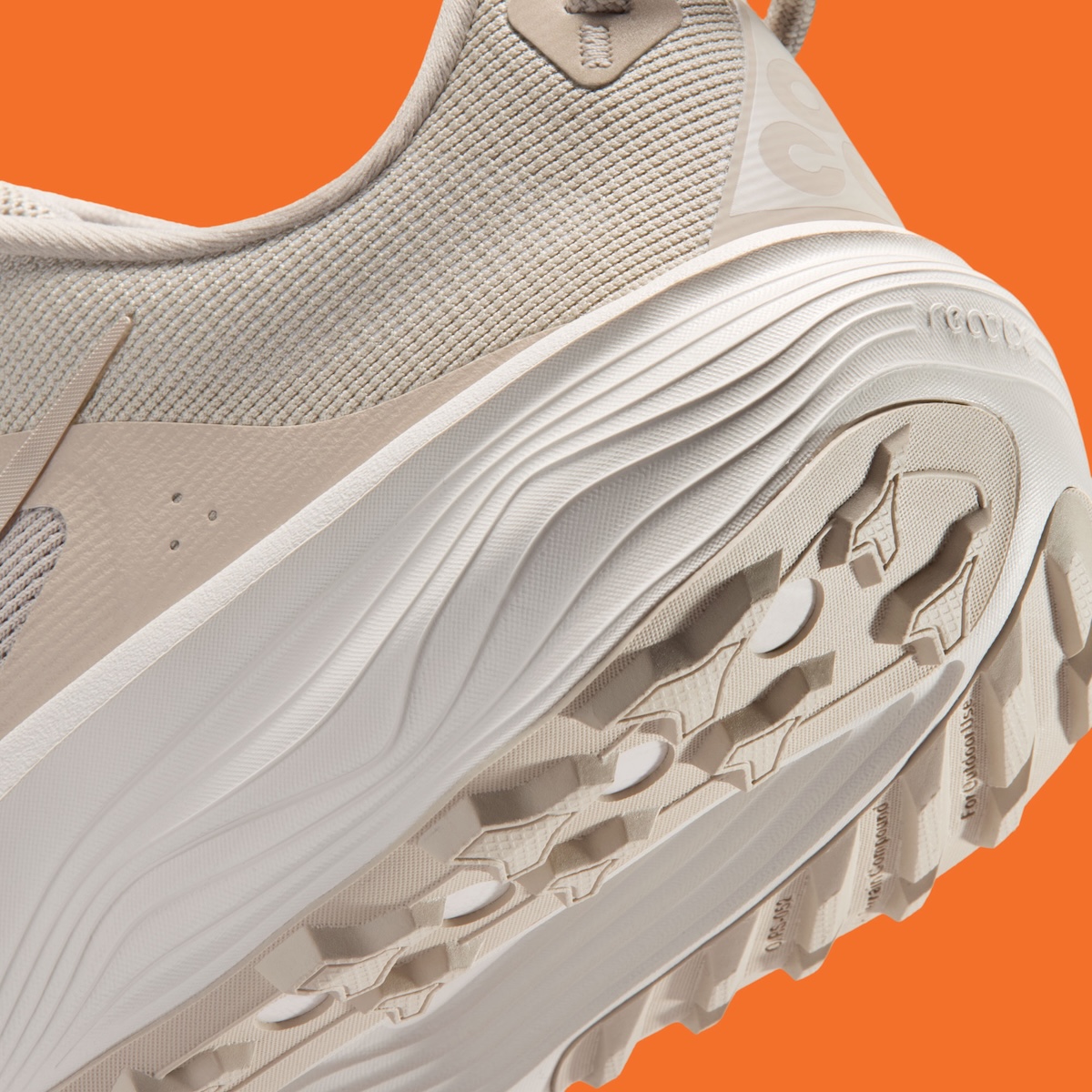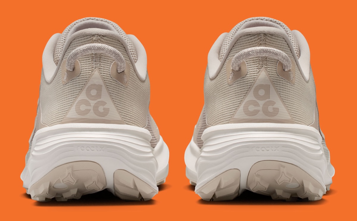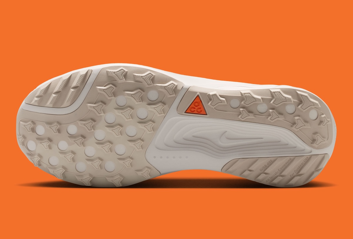 Underfoot, the model gets a thick white ReactX midsole with sculpted lines wrapping the heel. The outsole adds a light tan finish and aggressive traction pods, reinforcing the rugged purpose behind the design. Small hits of Safety Orange on the ACG branding and insole graphics break up the neutral layout without changing the shoe’s clean direction.