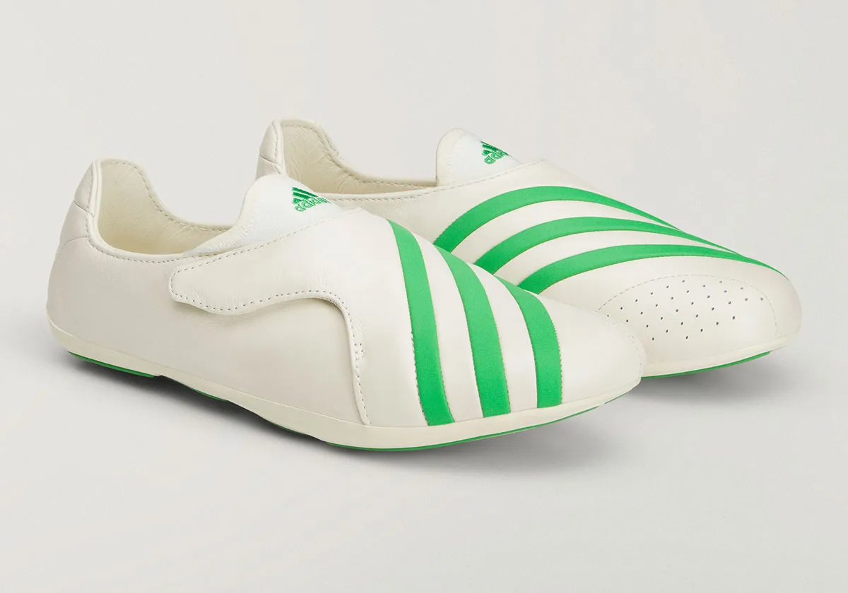 Elsewhere in Pharrell’s shared set, there’s confirmation of earnest new inductees into the Pharrell x adidas VIRGINIA oeuvre. One of the teased styles is the “Vario Flat Earther,” seemingly a take on soccer aesthetics, with its standout feature a combo strap/shroud where exaggerated Three Stripes branding takes over the toe. Closing out the sole-only images, a gum-soled style swaps between Y-shaped traction cutting and more traditional stripes, while maybe the most avant-garde style brackets streaks of green rubber with a pocked exterior on the midsoles.