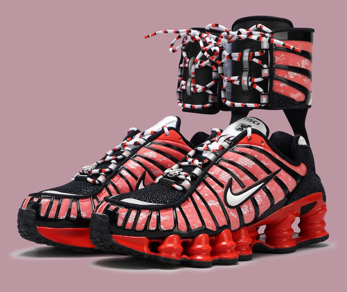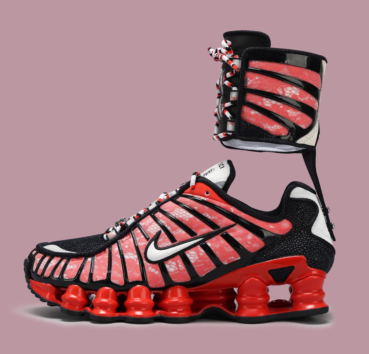 The loudest pair arrives in black, red, and white, using a reptile-like textured base with black overlays and bright red Shox columns. Multicolored rope laces push that version even further, giving it the strongest visual punch of the group.