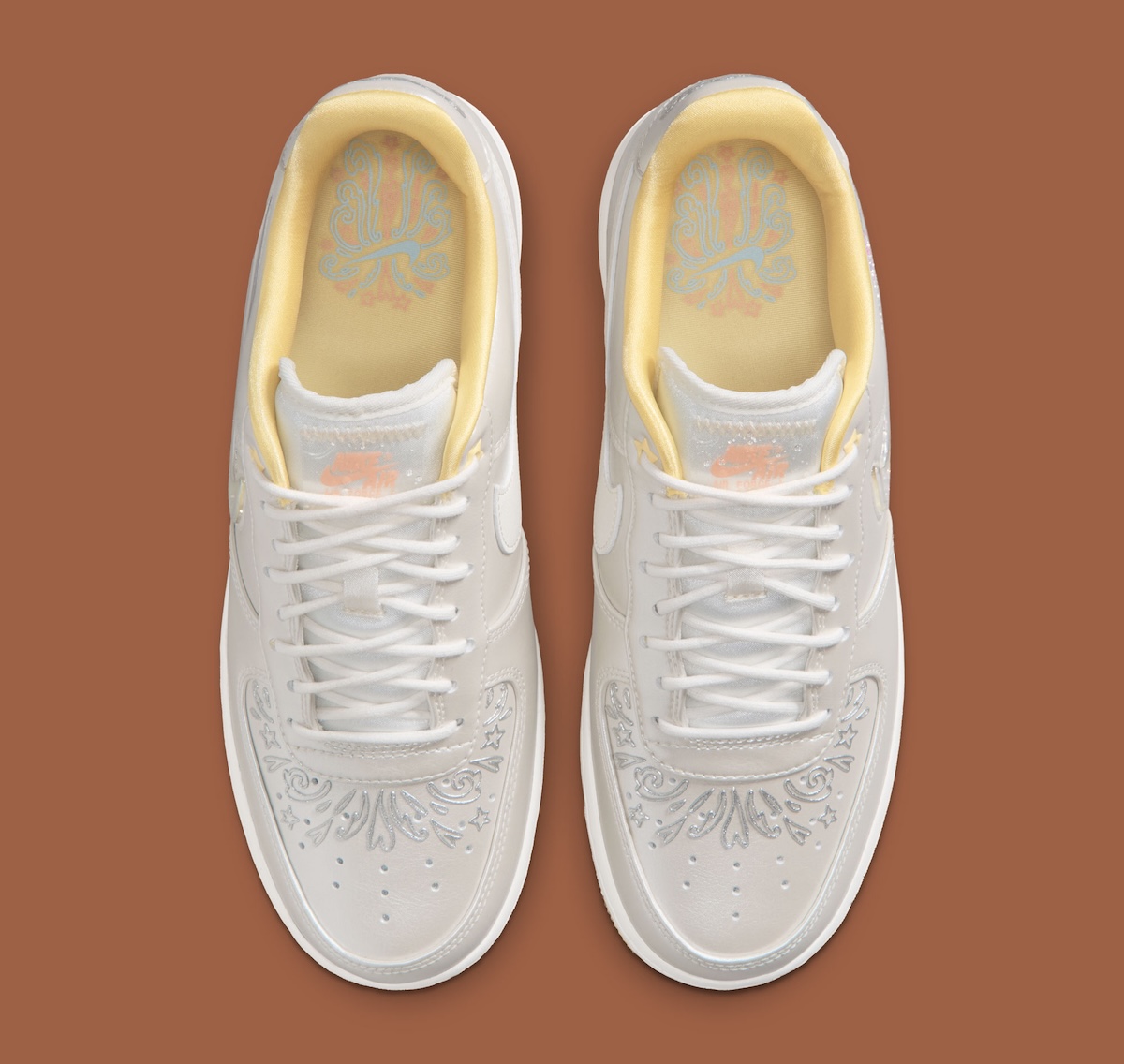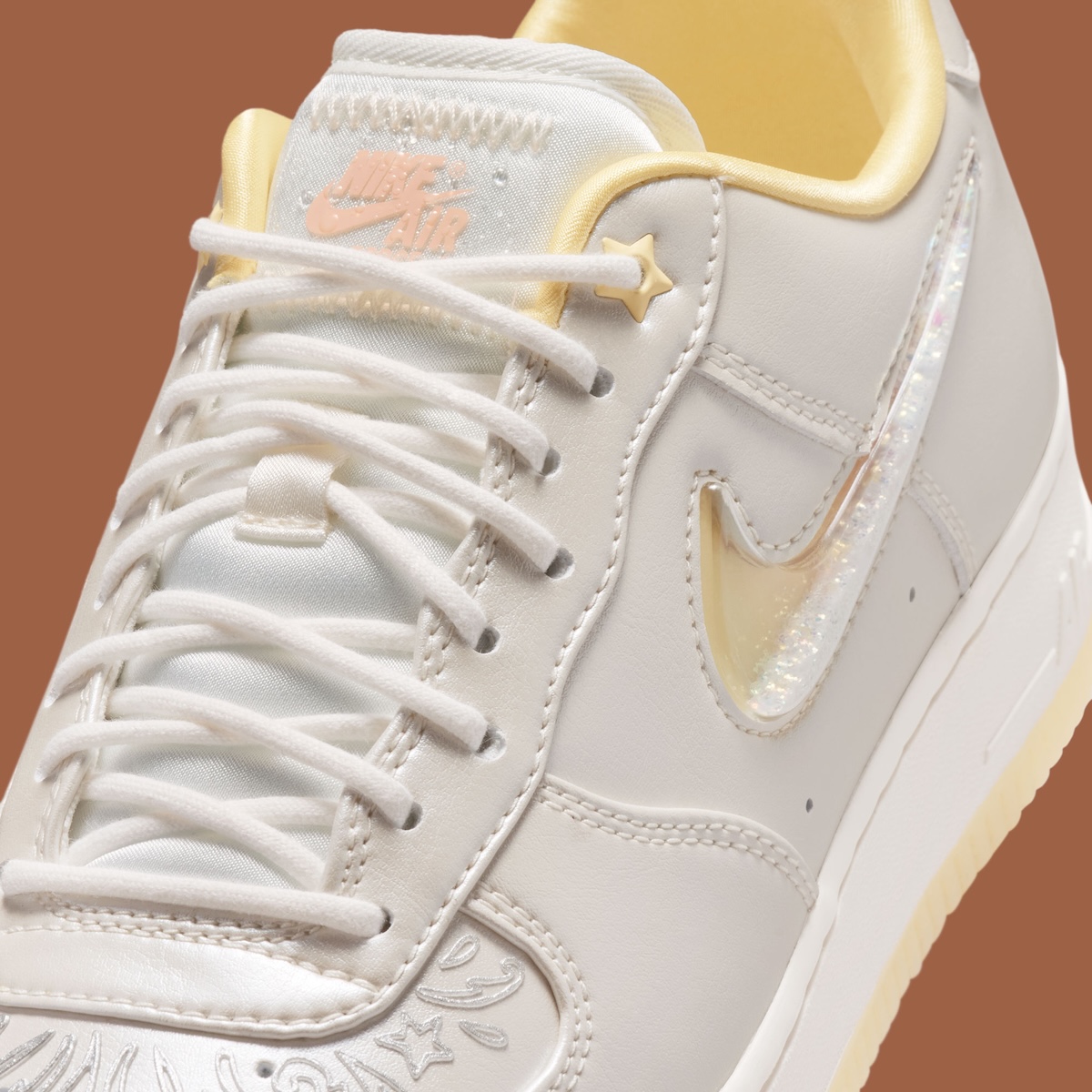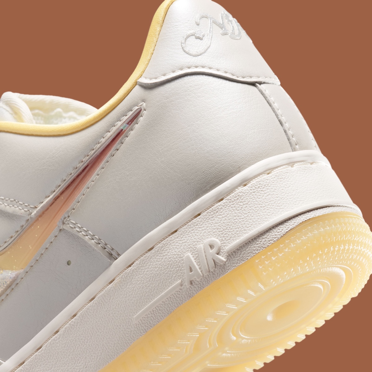 The thing that really changes things up is the Swoosh. Nike places a jewel logo with a glitter inside on the medial side and the Mist Orange and Soft Yellow underneath shines through creating a warm aura you can see on the sides. Speaking of which, both colors pop up on the lining, lace detail, and outsole to complete the look in the cleanest way possible.