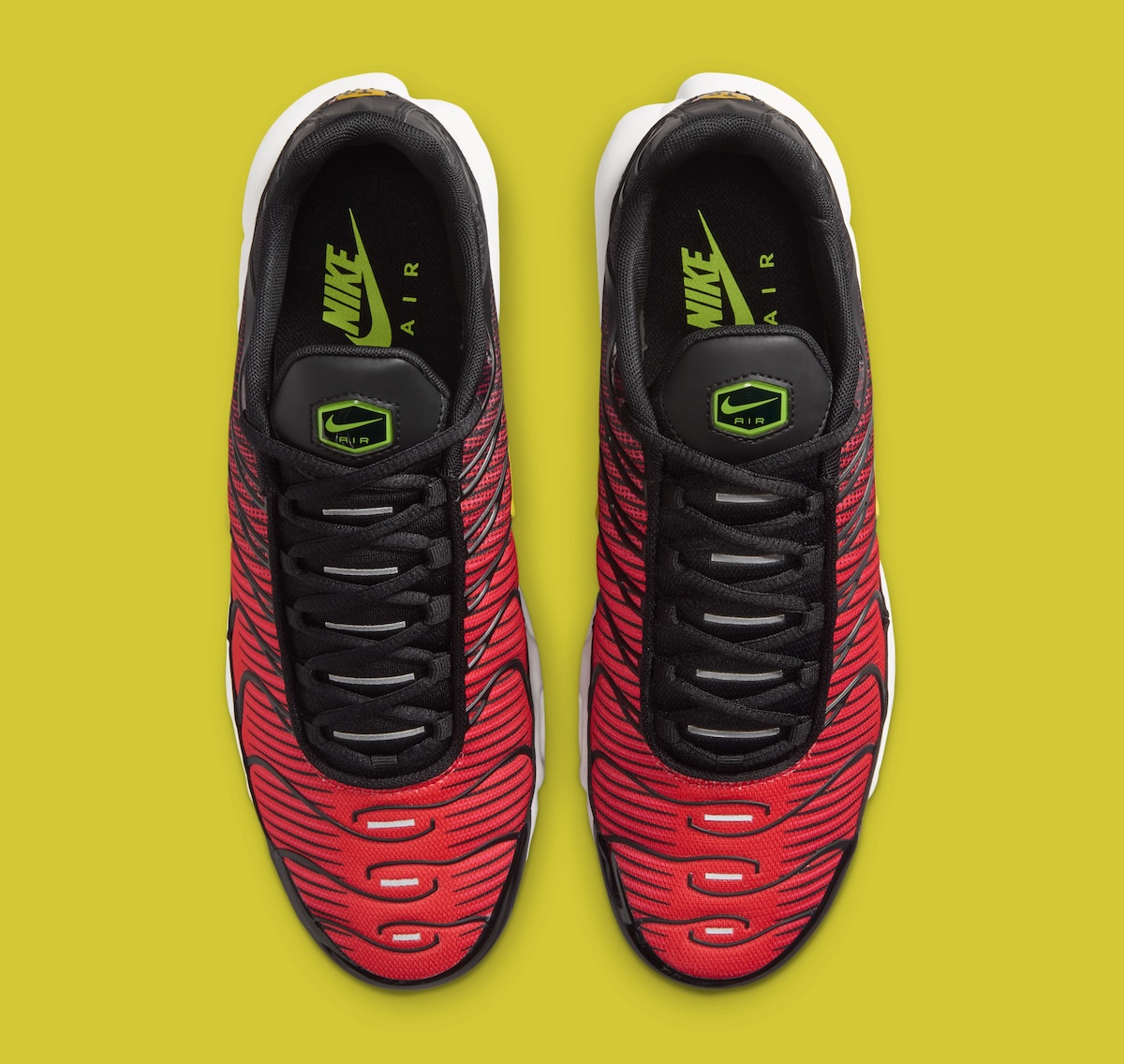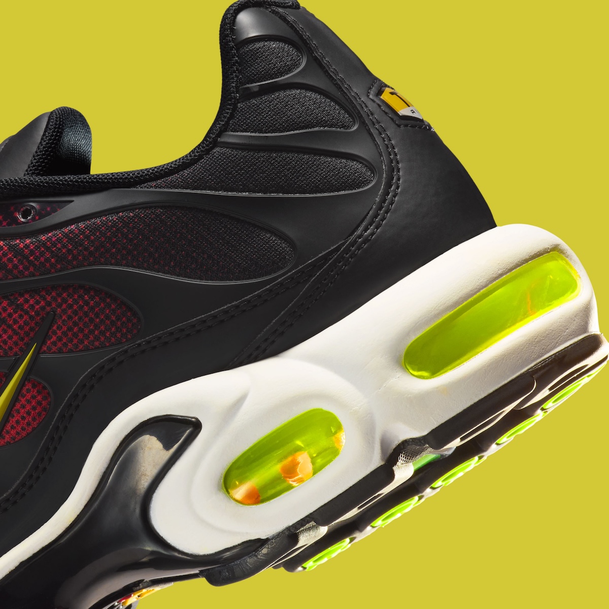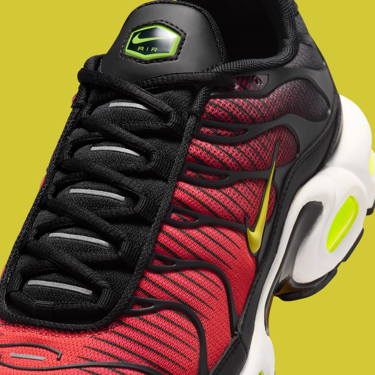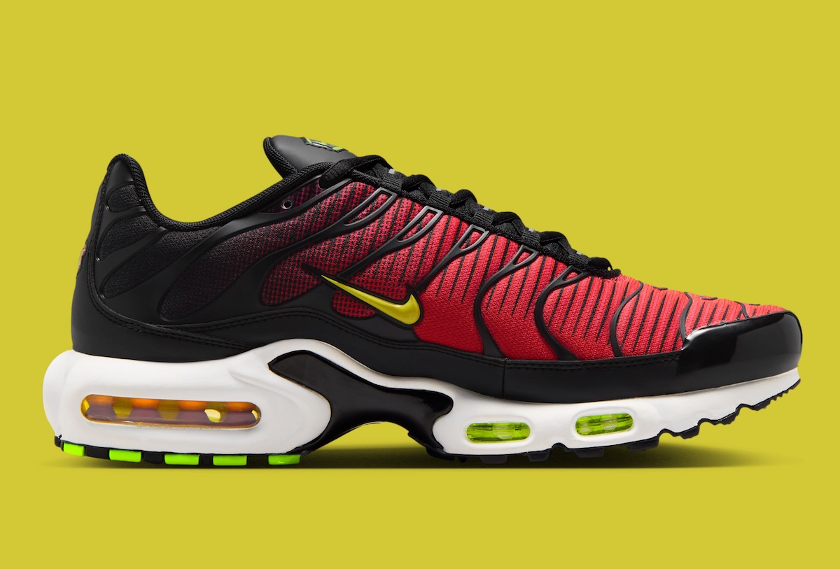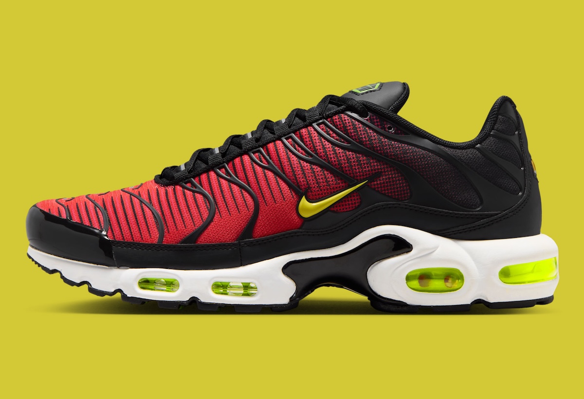 Heat and contrast come together in a way that feels right at home on one of Nike’s boldest runners. This latest Nike Air Max Plus “Black/Light Crimson” leans into the silhouette’s aggressive shape with a fiery upper, neon hits, and the kind of tuned Air styling that has kept the model relevant for years.