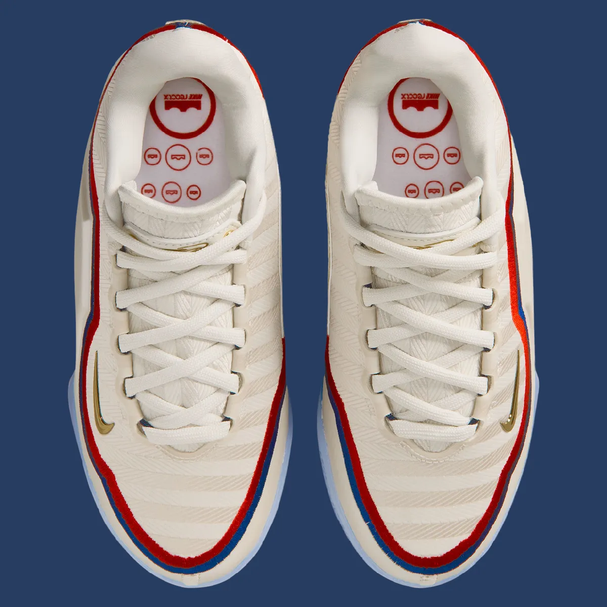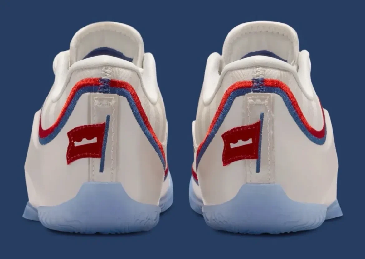 Visually, the sneaker keeps things direct with a patriotic red, white, and blue palette. A crown-and-flag logo on the heel ties back to LeBron’s status as both a national figure and a defining athlete of his era. Subtle gold accents, including a mini Swoosh and tongue detailing, nod to the Olympic stage and podium finishes without overpowering the theme.
