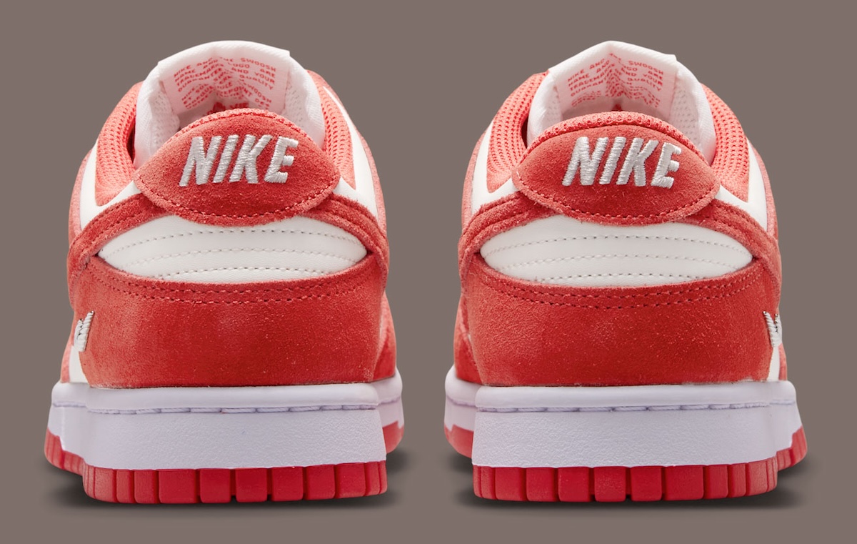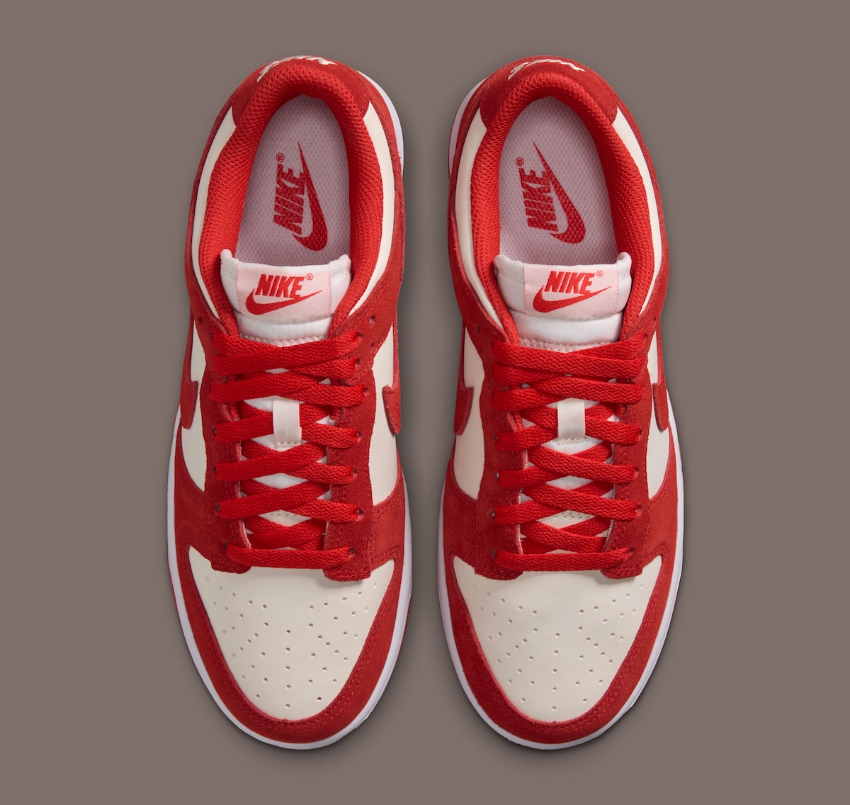 The base comes dressed in Sail leather, which gives the shoe a soft and slightly vintage look right away. Around it, Light Crimson suede takes over the overlays, Swoosh, and heel, bringing a brighter energy without making the pair feel too busy. It is a simple setup, but the suede gives it a little more life than a standard leather Dunk.