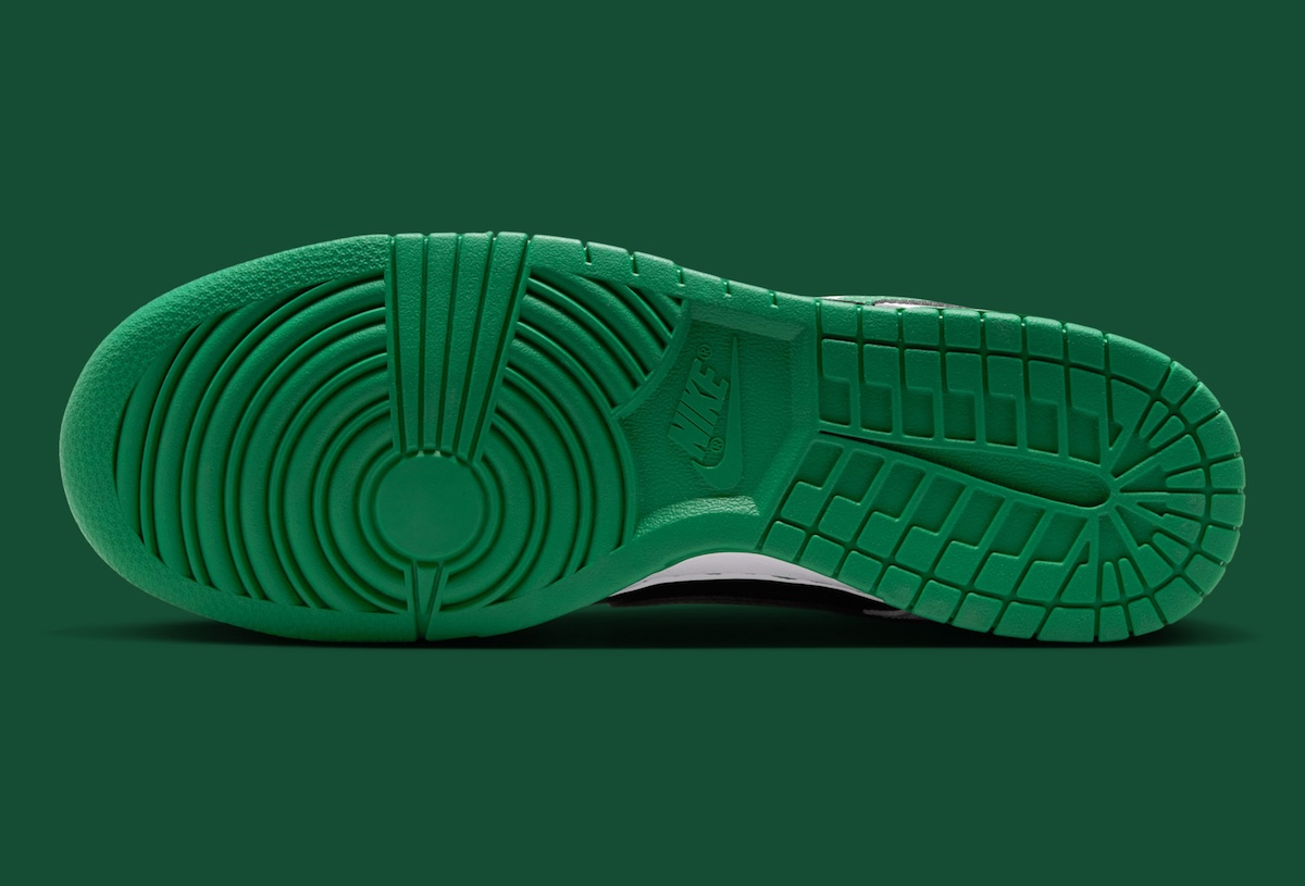 Pulling from the same blocking recently spotted on the “Black/University Red” colorway, this Dunk is nicely balanced and casual ready. Black leather is utilized on the shoe’s base, spanning the perforated toe, side panels and collar. Clover green is used on overlays, Swoosh, lining, laces and outsole. White then cuts through the upper at the heel overlay, back tab, tongue tag, and midsole, keeping the design crisp instead of too dark.
