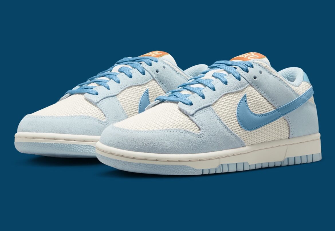 A Sail open-knit mesh covers the base, stretching across the toe box, side panels, and heel for a look that feels noticeably more open than a standard Dunk. That woven foundation is paired with soft Hydrogen Blue suede overlays, giving the shoe a washed, easygoing finish without losing structure. The result feels seasonal, but still grounded in the Dunk’s classic low-cut format.