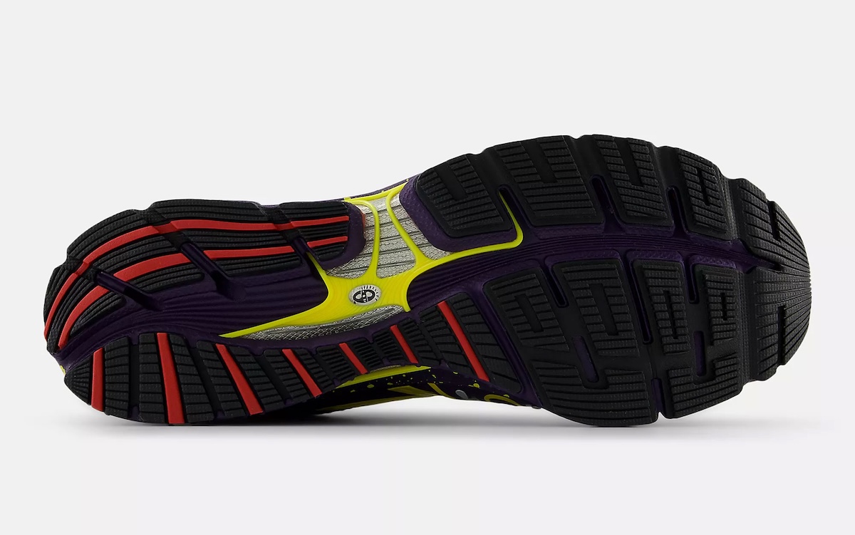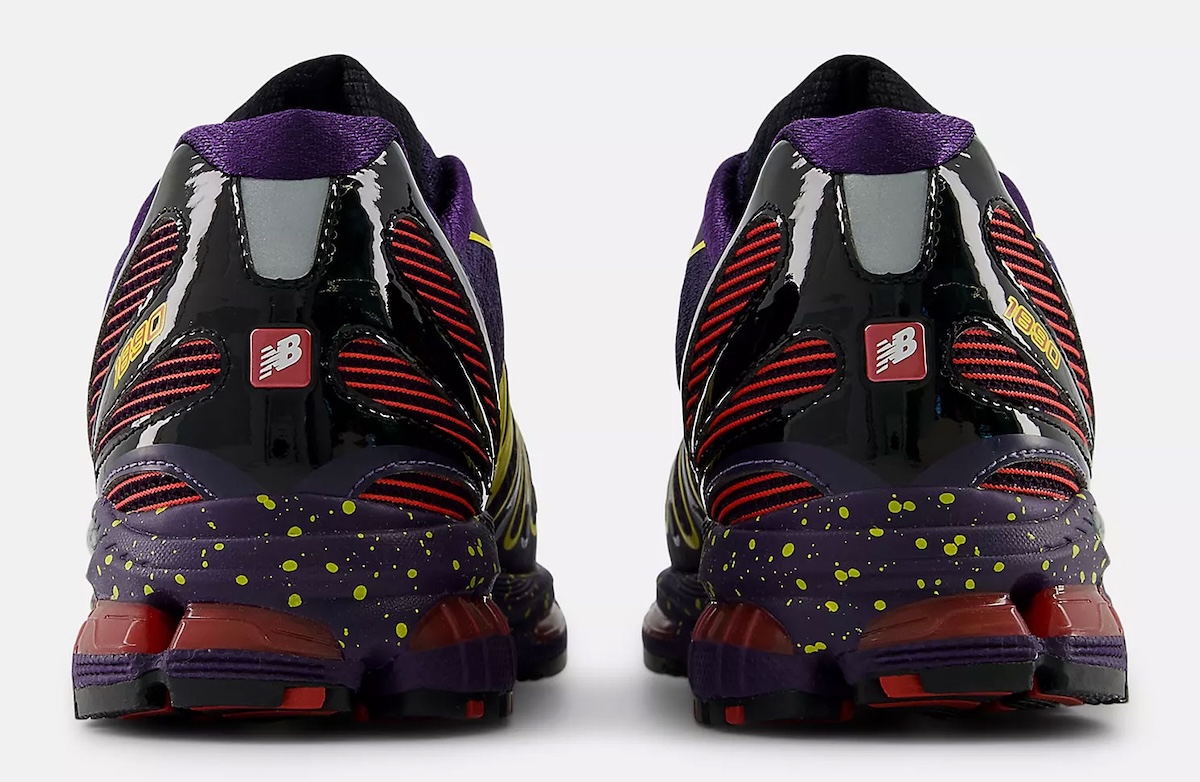 Moving around to the heel of the foot, things turn more sinister. A black glossy heel shell envelops the entire rear while diagonal red striped accents are layered throughout to help break up the darker color palette. Below, the mottled midsole continues the aggressive theme with pops of purple foam contrasted by neon yellow paint splashes and exposed ABZORB modules showcasing a translucent hue of red-orange.