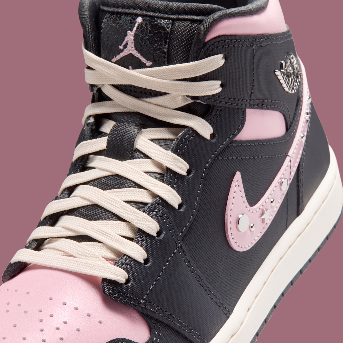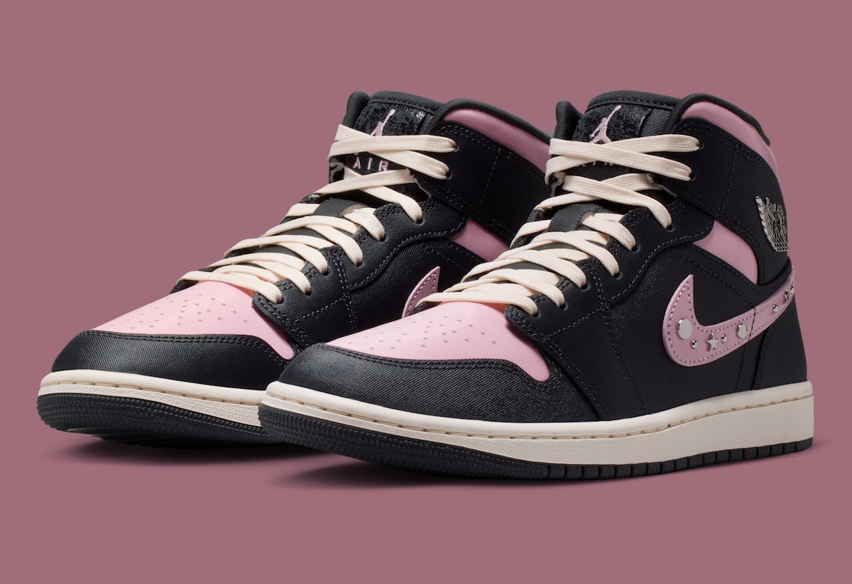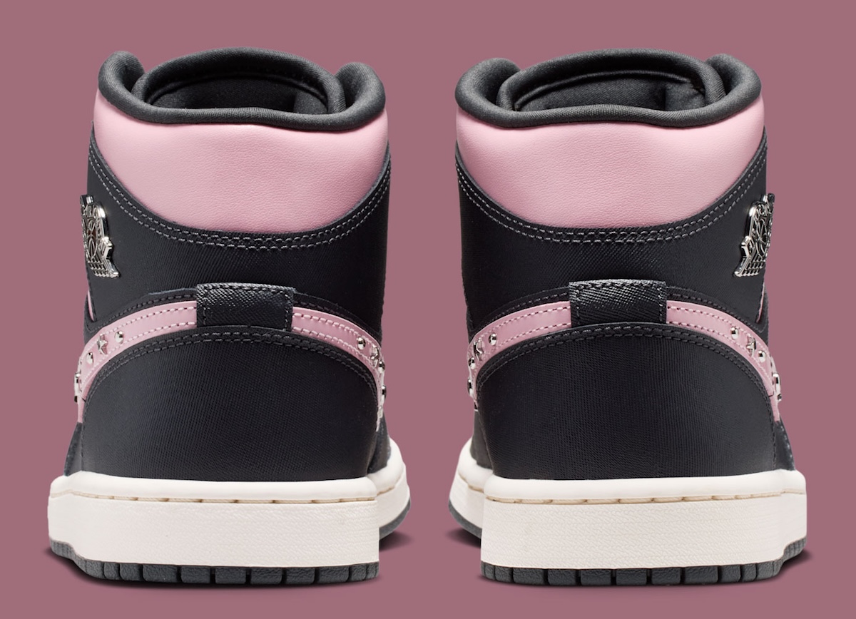 The details are what separate this Air Jordan 1 Mid from a more standard release. Along the Swoosh, Jordan Brand adds Metallic Silver hardware, including round studs and small star accents that bring a jewelry-like touch to the sidewalls. Up top, the cracked texture on the tongue label gives the design a little more depth, while the dark outsole keeps the pair grounded with the classic Air Jordan 1 tread pattern underneath.