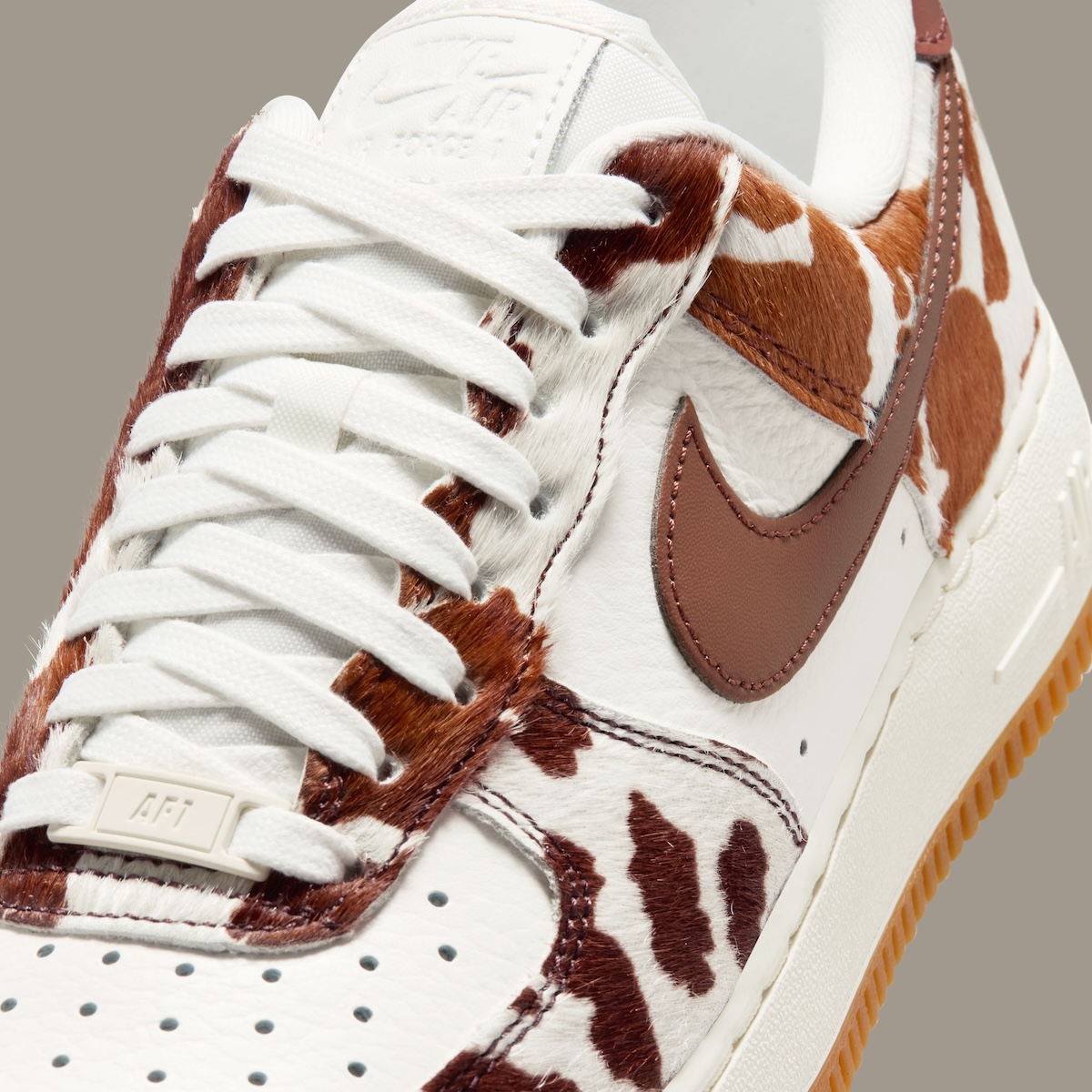 The Field Brown/Gum Medium Brown-Sail colorway goes in a different direction and feels a little more relaxed. Sail leather sets the base, while the brown-and-white cow print overlays give the shoe a warmer, more natural look. Field Brown hits on the Swoosh and heel tab tie everything together without feeling too heavy. White laces lighten things up, and the sail midsole with gum outsole adds that easy vintage touch.