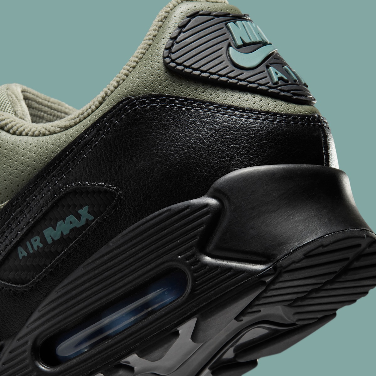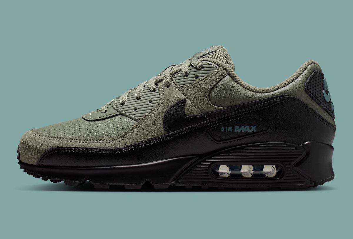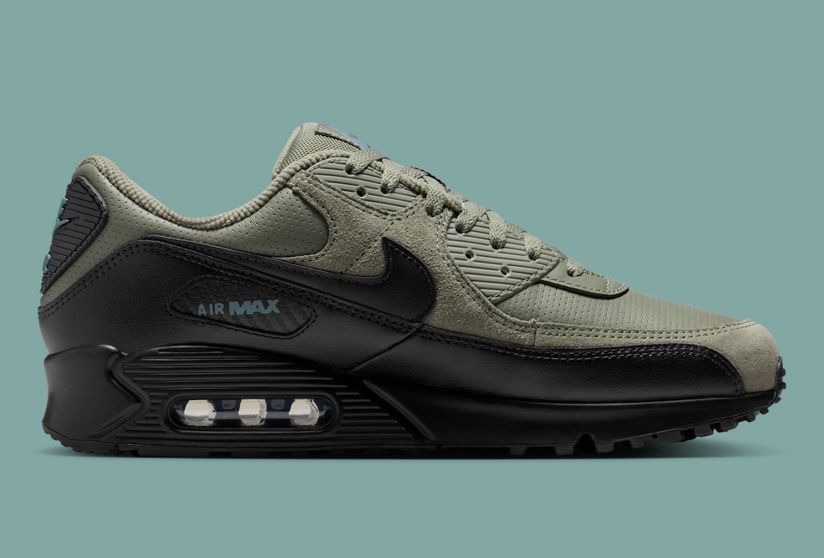 Nike is giving the Air Max 90 another Racing-themed update, this time in a sharp “Silver Sage” colorway that mixes muted tones with darker performance-inspired details. The upper looks clean and balanced in the images, pairing soft Silver Sage across the perforated leather base, tongue, eyestays, collar, and suede overlays. Black takes over the mudguard, Swoosh, heel overlay, and midsole, creating strong contrast and giving the classic runner a more aggressive edge than a typical release.