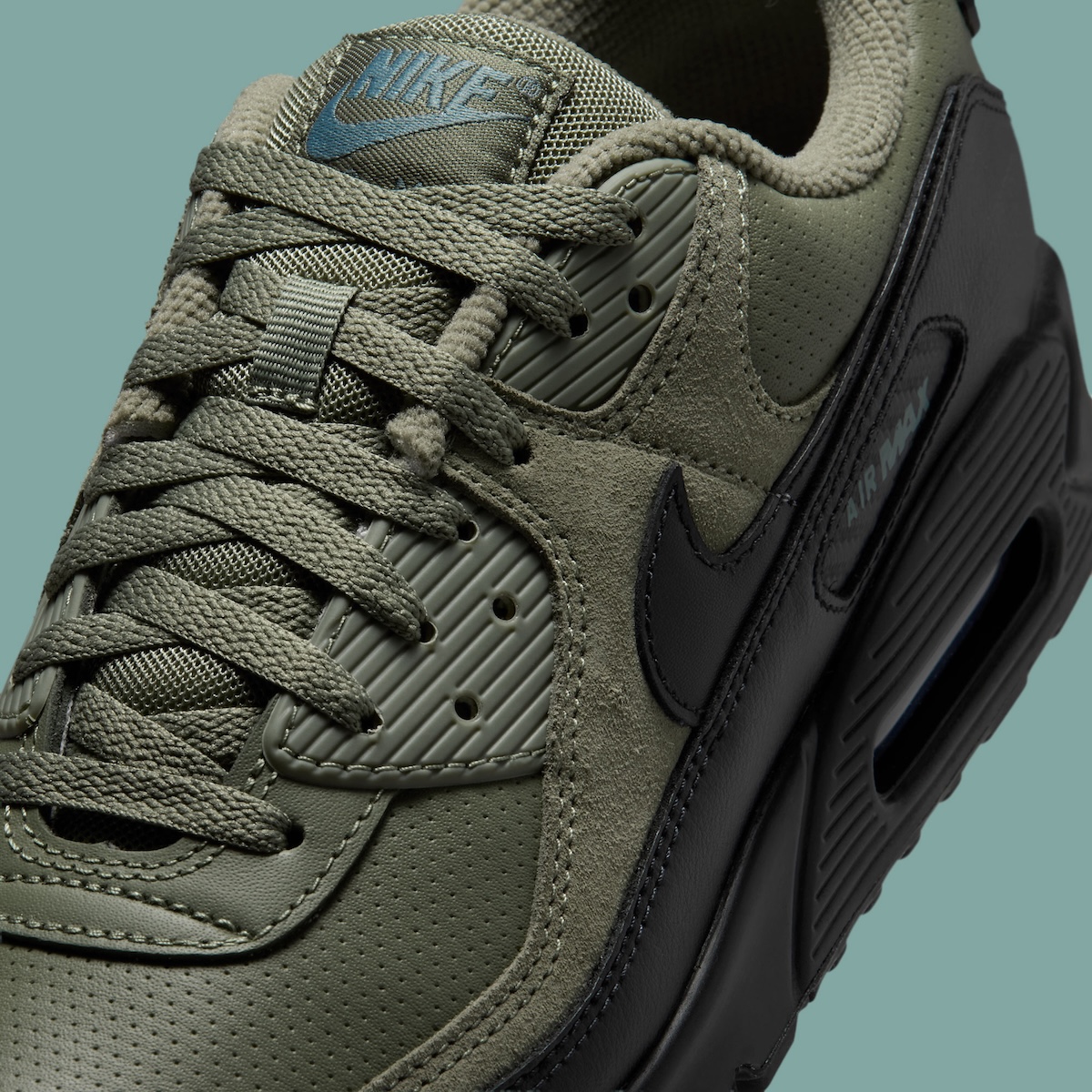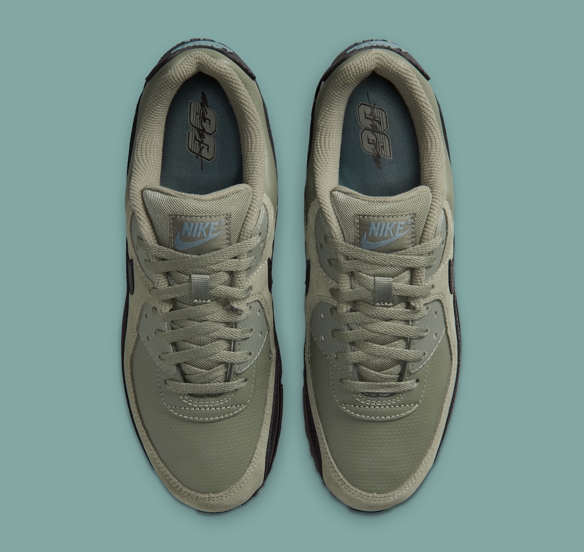 The design also sticks with details that help separate this pair from a standard inline colorway. Carbon fiber-style texture appears inside the mudguard window near the Air Max branding, adding to the Racing identity without overdoing it. Mineral Slate accents show up on the tongue logo, heel branding, side Air Max hit, and insoles, where the “90” graphic gives the shoe a subtle special-edition touch. Based on overhead photos and zoomed in shots of the footwear, material combinations appear to be smooth leather, perforated panels and suede textures. The layering of materials provides this silhouette with more depth rather than just your traditional two-toned construction.
