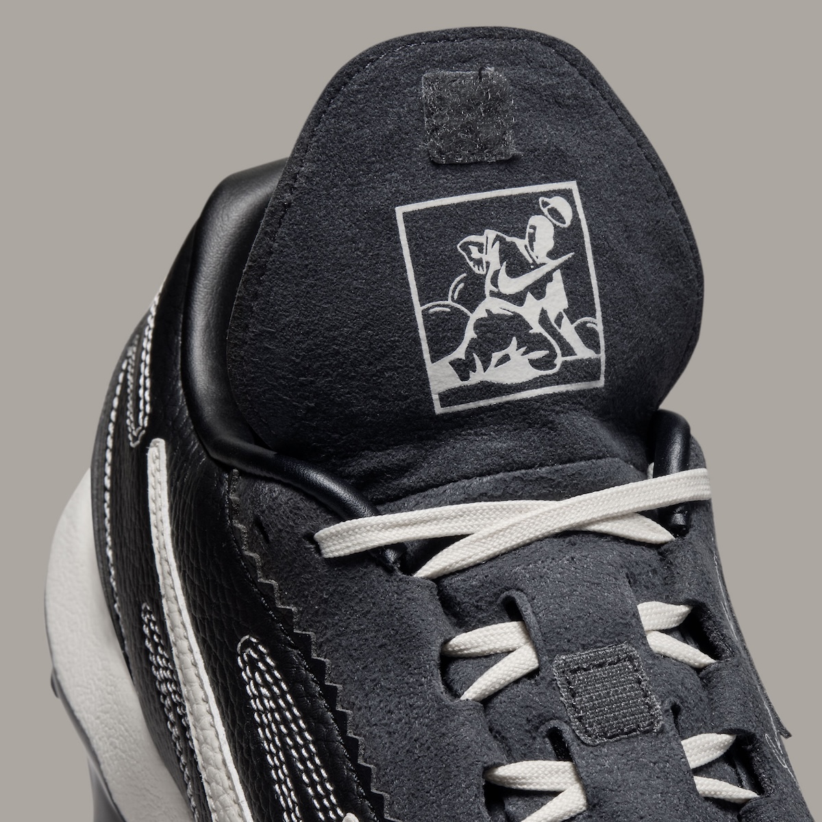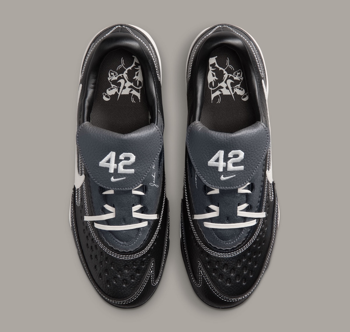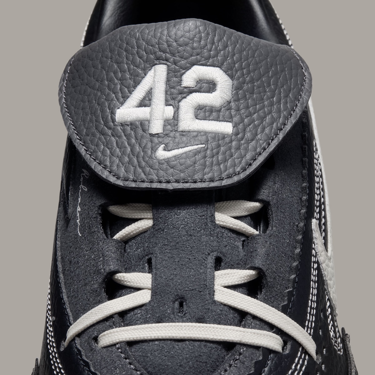 Black leather wraps around the entire upper, steering away from an obvious blue-and-white color scheme most associated with Dodgers gear. White Swooshes cut a crisp contrast across the sides and the baseball glove-inspired lacing detail feels perfect on the diamond. Nike also embroidered Robinson’s signature number, 42, on the fold-over tongue for an even greater tribute to the legend himself.