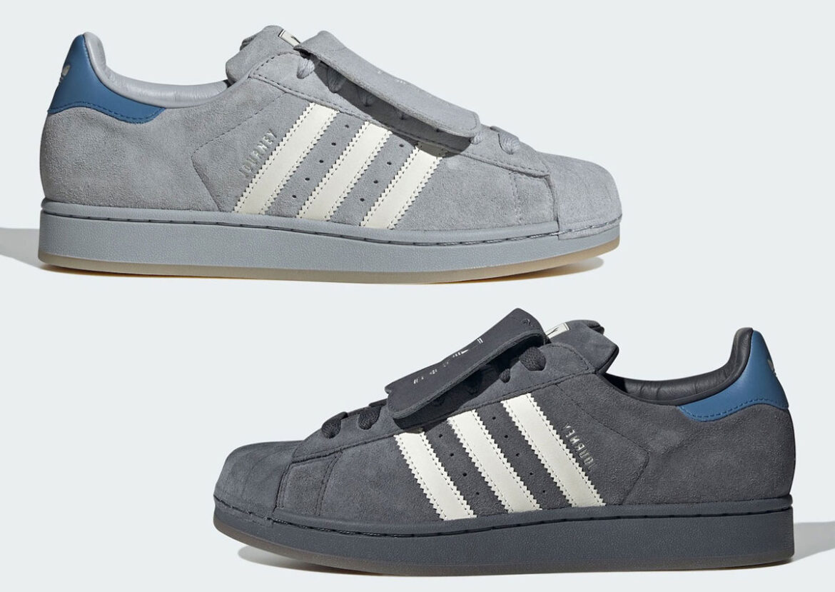 The atmos x Daiki Tsuneta x adidas Superstar Pointless Journey Pack includes two grey-based makeups, one in DGH Solid Grey and the other in Clear Onix. Both pairs stay within the same muted lane. White Three Stripes branding breaks up the upper nicely, while the blue heel tab adds just enough color to keep things interesting.