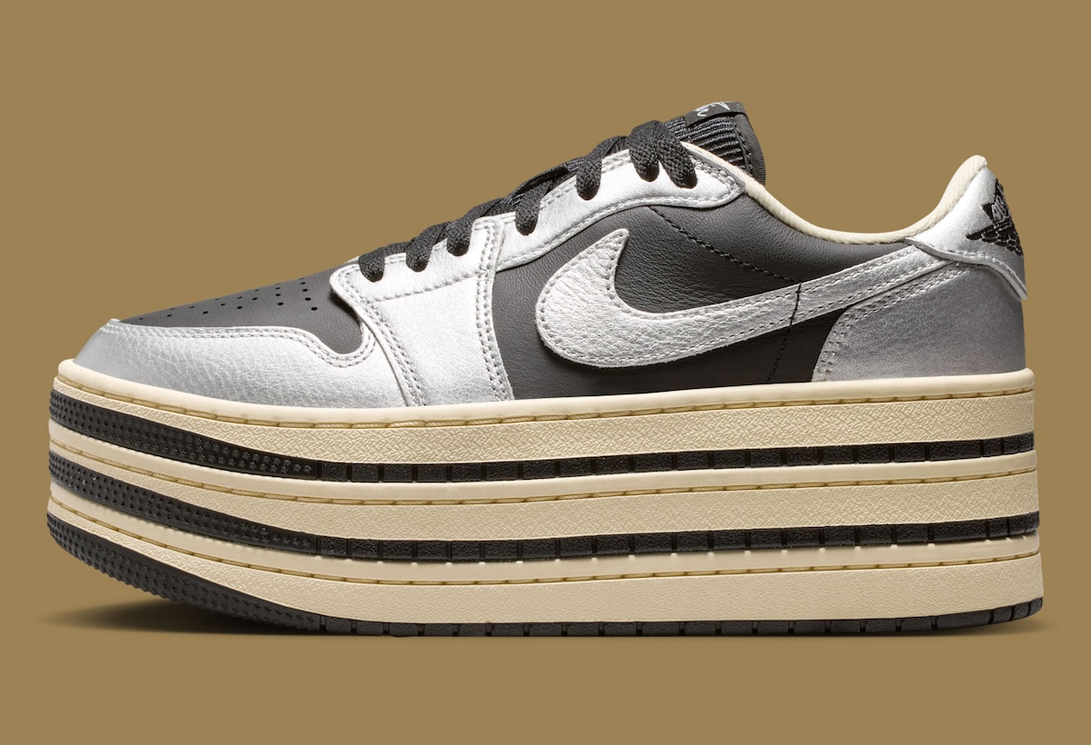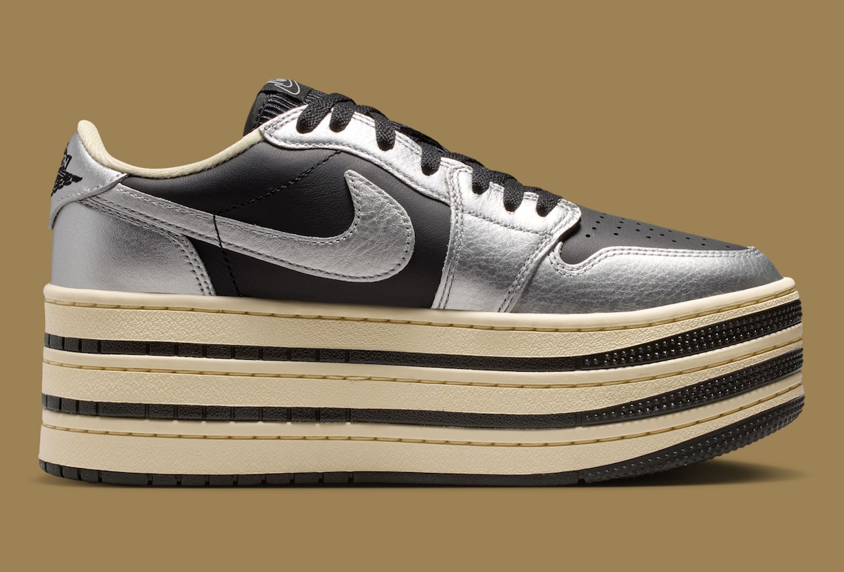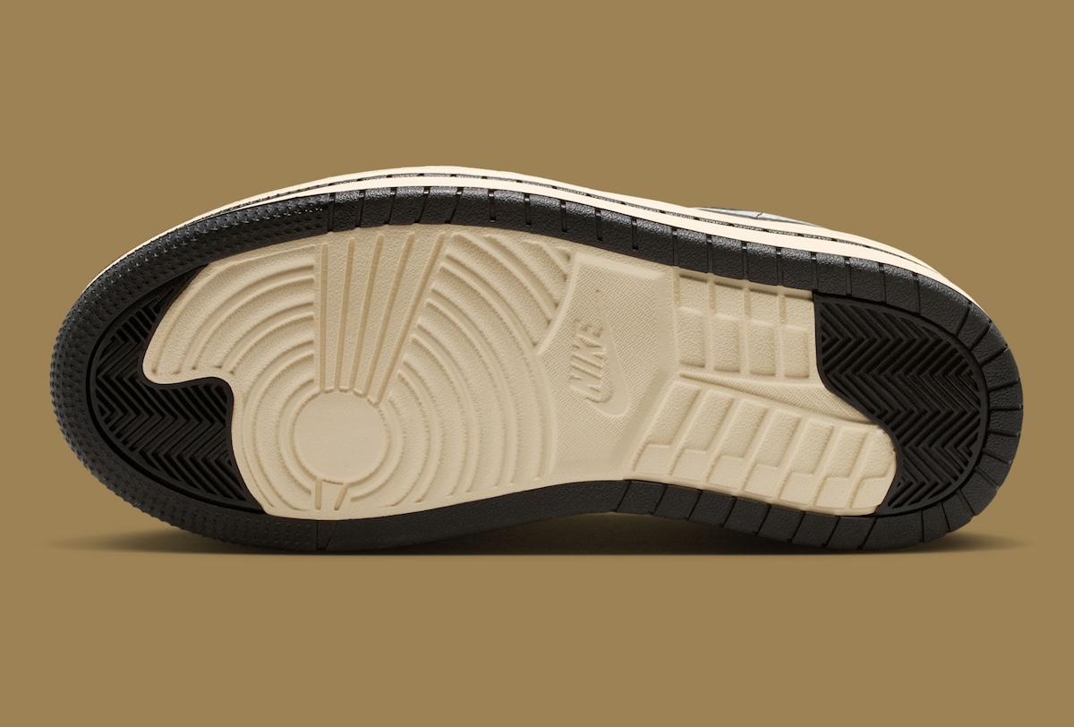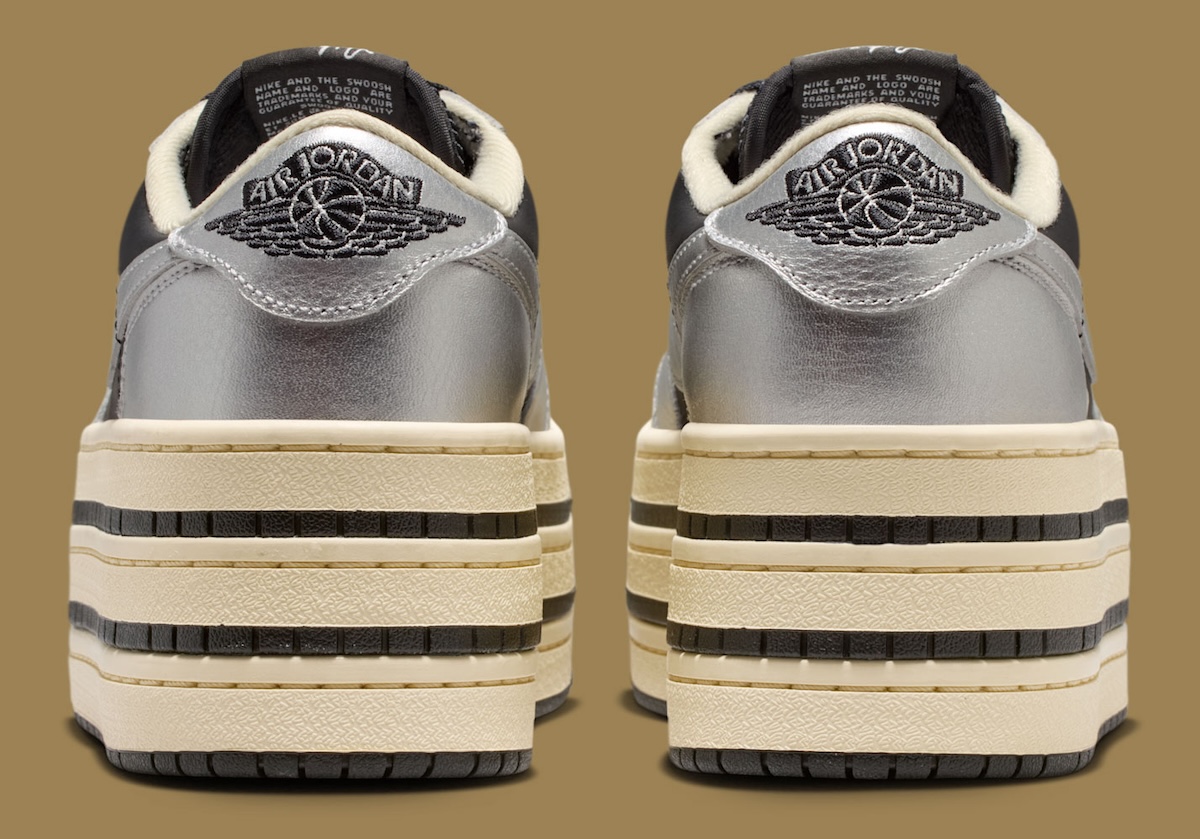 The oversized Triple Stack sole is what really changes the entire feel of the sneaker. Jordan Brand swaps out the traditional AJ1 setup for a thick layered Muslin midsole with black striping placed between each section. That stacked construction gives the shoe a much more dramatic profile, while the slightly aged Muslin tone softens the metallic upper and adds a subtle vintage touch.