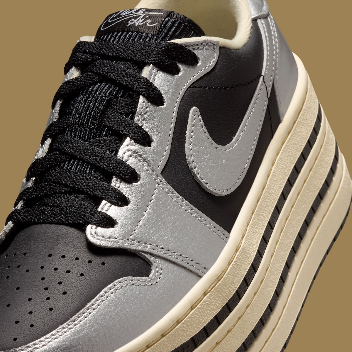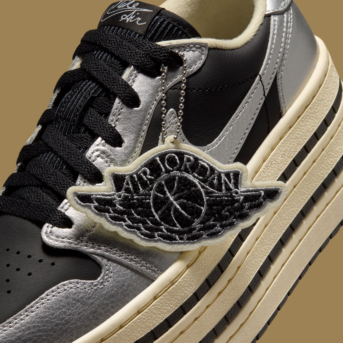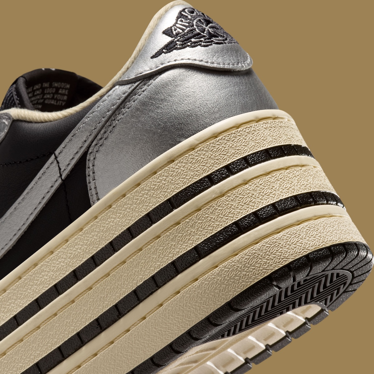 The oversized Triple Stack sole is what really changes the entire feel of the sneaker. Jordan Brand swaps out the traditional AJ1 setup for a thick layered Muslin midsole with black striping placed between each section. That stacked construction gives the shoe a much more dramatic profile, while the slightly aged Muslin tone softens the metallic upper and adds a subtle vintage touch.