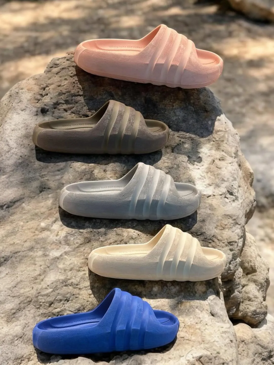 Five monochrome colorways make up the release, including peach pink, blue, grey, cream, and brown. Each pair keeps the same sculpted design language, with layered ridges across the strap and a rougher texture around the foam build that gives the model its stone-like character. The softer earth-toned pairs feel especially tied to the concept, but the brighter shades help push the pack into more playful summer territory.