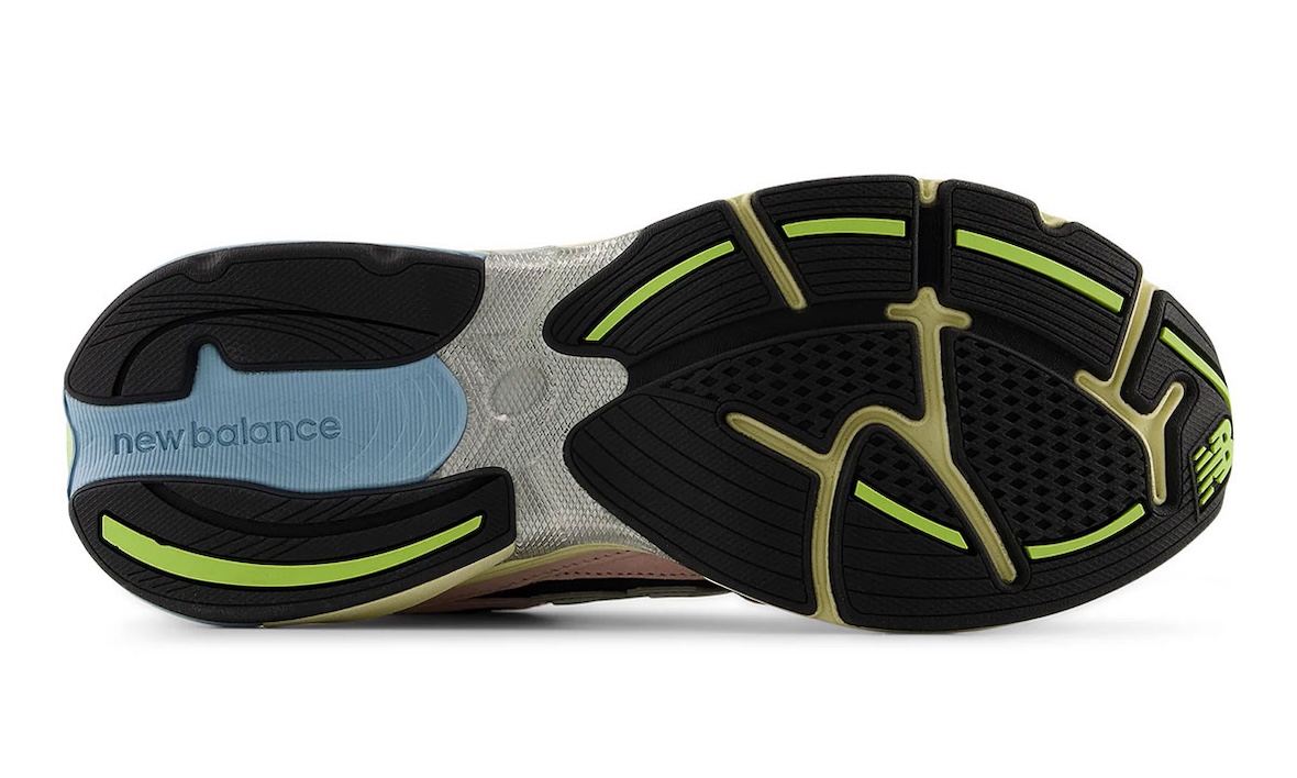 That’s where the color play starts to pick up steam. The creamy yellow overlay provides a faded effect without feeling phony or contrived here. Translucent green heel pods pop up at the rear and the light blue around the heel prevents this shoe from diving headfirst into the familiar pink-and-black territory. Black rubber appears on the foot underfoot on the outsole. You also see splashes of lime and another hit of blue, so all the colors introduced are used throughout the shoe. Simple. It all works together without trying too hard.