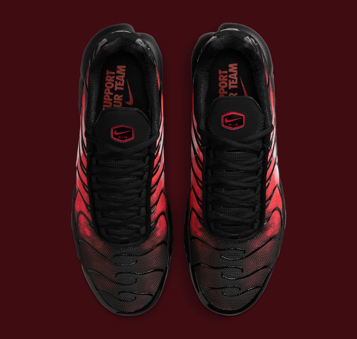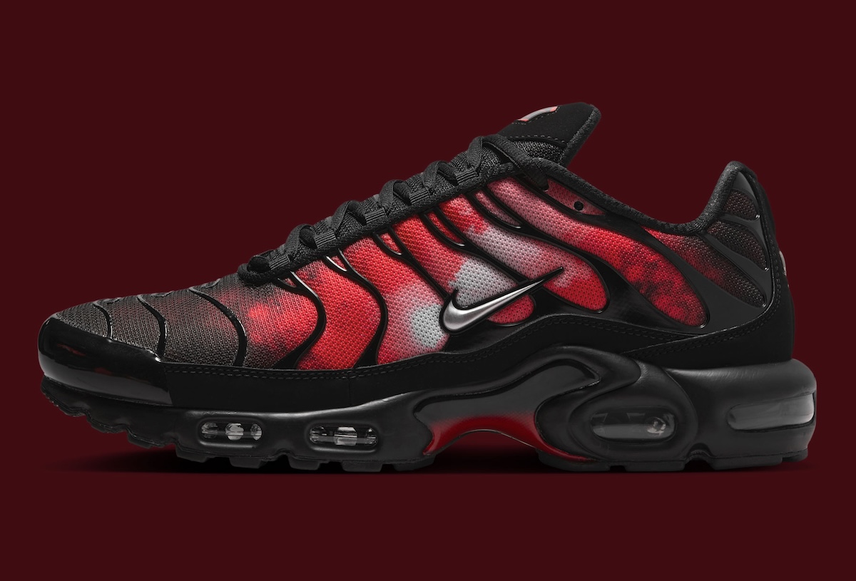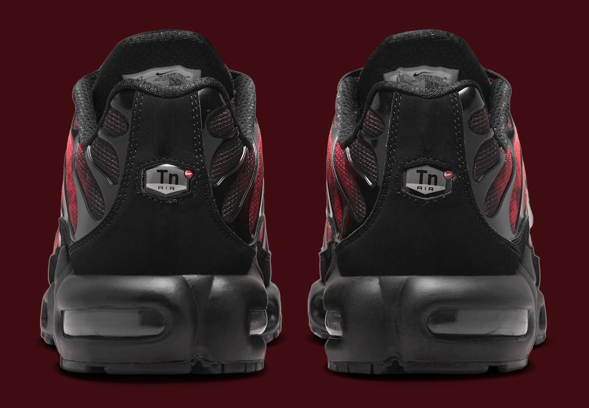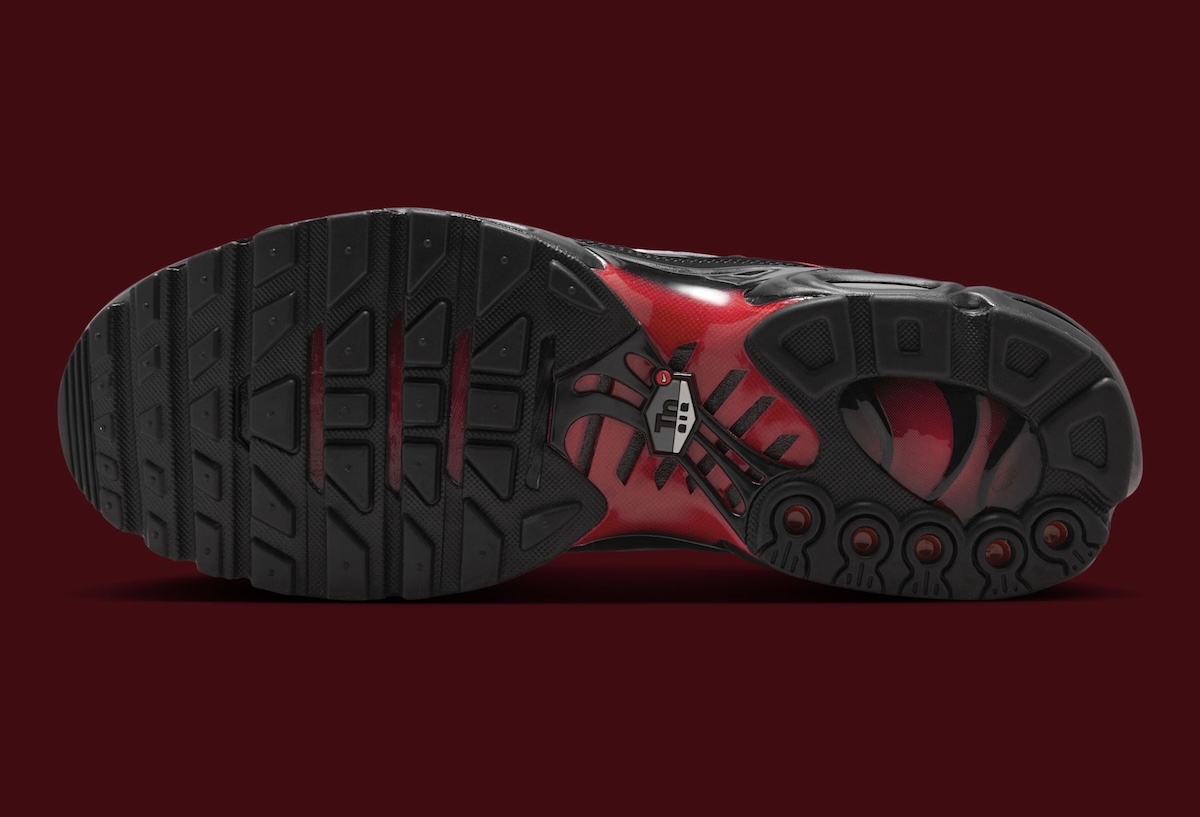 While black dominates the upper, you can’t help but notice the red graphic that flames its way out from the sides. Metallic Silver Swooshes break up the heat nicely, while the black cage and matching midsole keep that unmistakable TN look in place. Nike also worked in a few smaller touches, including “support your team” stamped on the insoles and metal lace tips finished with red arrow details.