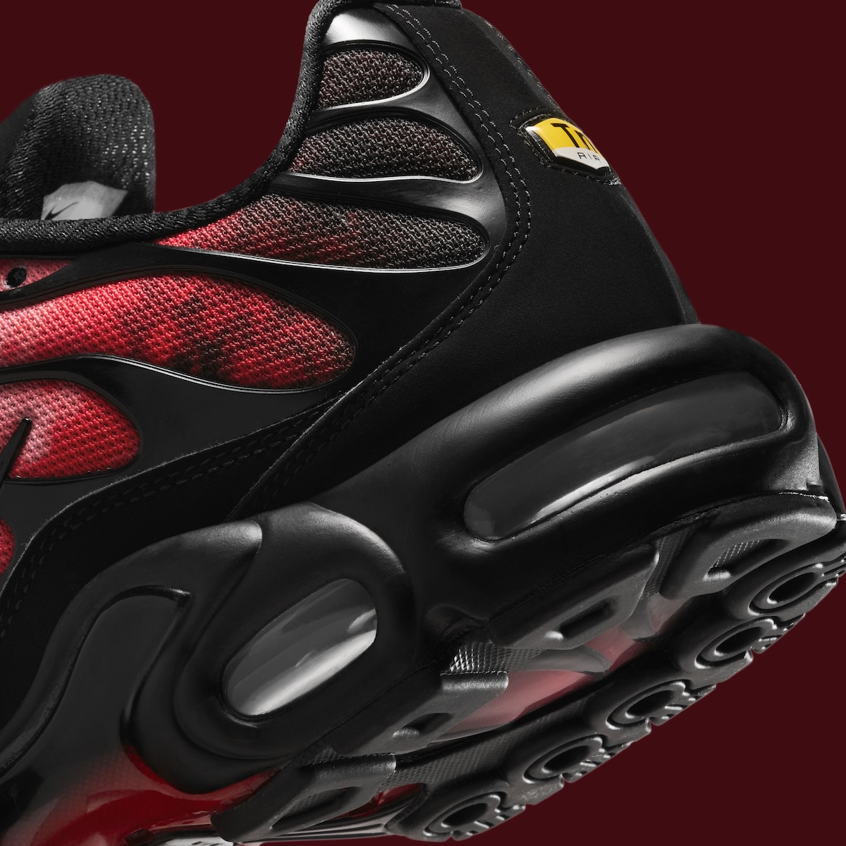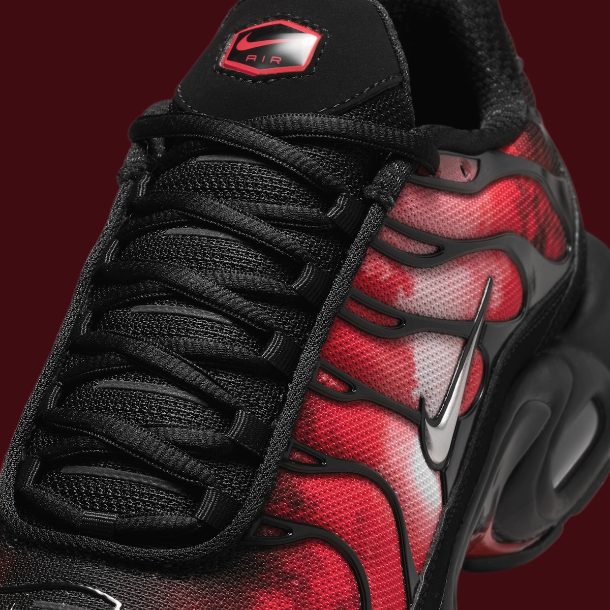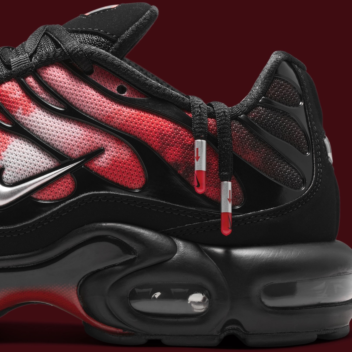 While black dominates the upper, you can’t help but notice the red graphic that flames its way out from the sides. Metallic Silver Swooshes break up the heat nicely, while the black cage and matching midsole keep that unmistakable TN look in place. Nike also worked in a few smaller touches, including “support your team” stamped on the insoles and metal lace tips finished with red arrow details.