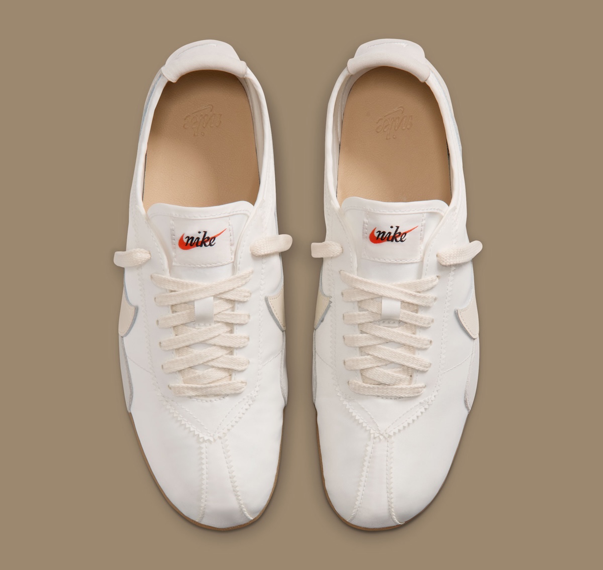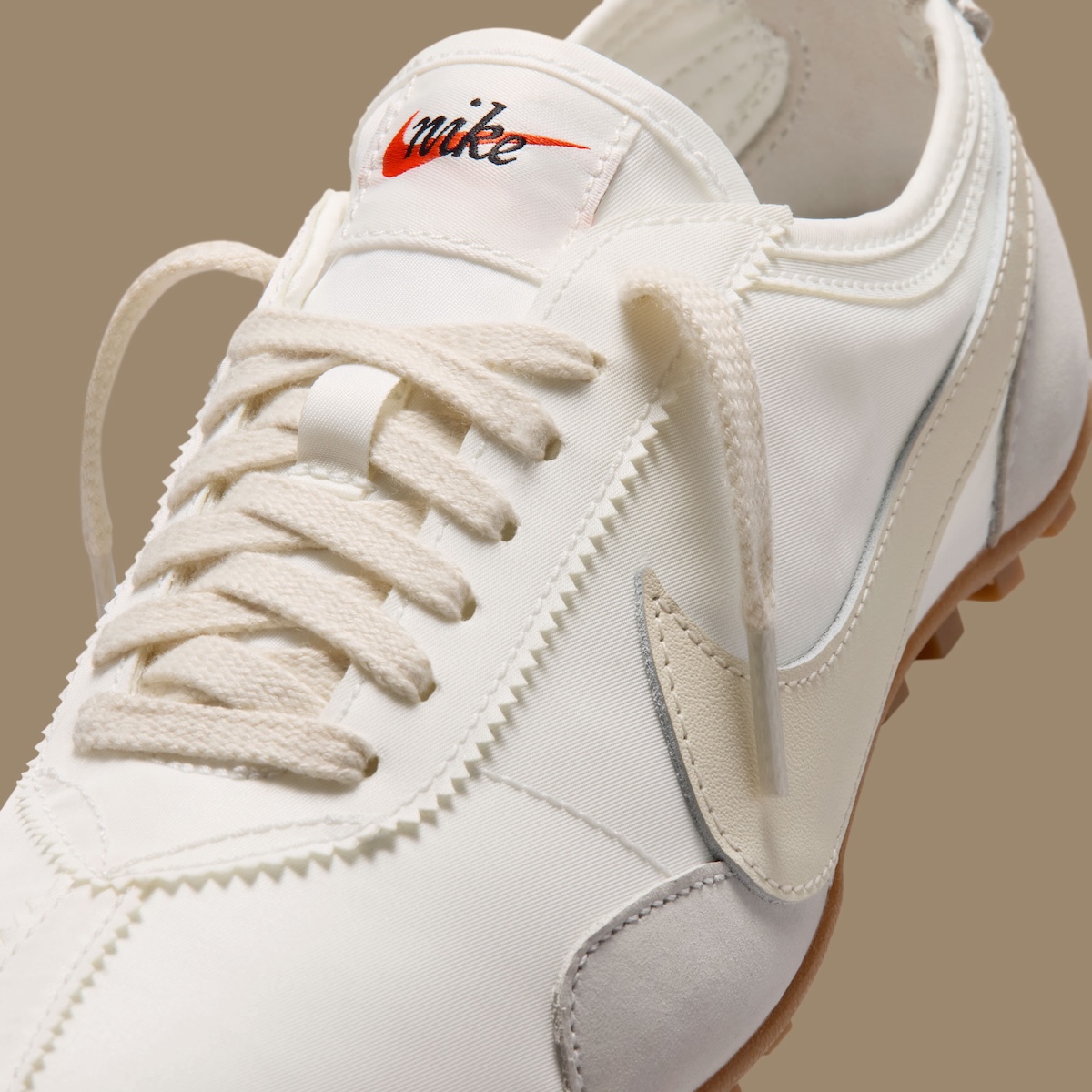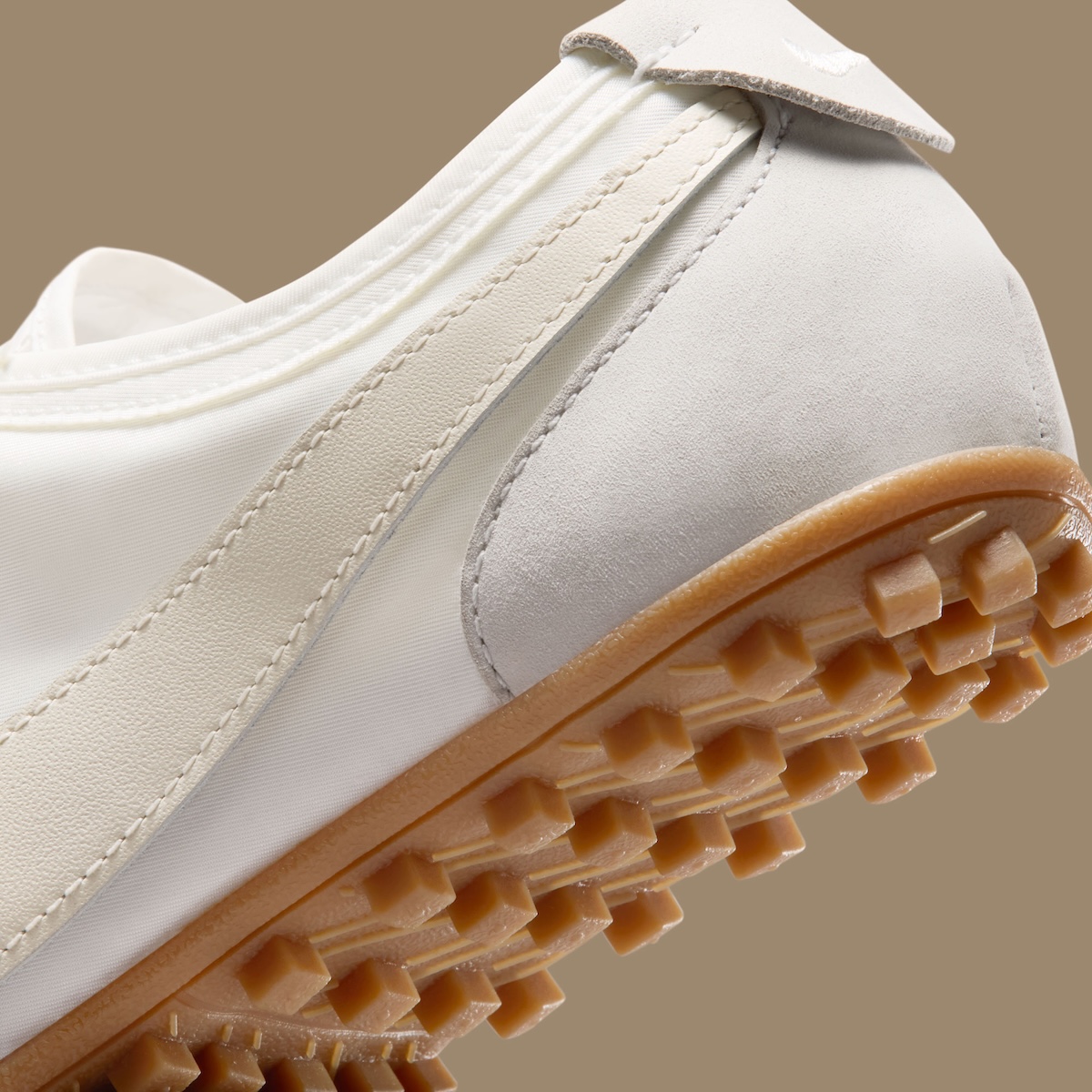 Triangle-cut paneling around the toe and heel adds sharp detail to the upper without taking away from the clean layout. Light grey semi-circle stabilizers appear along the front side panels and heel, adding subtle contrast against the white leather base. Creamy off-white hits on the Swoosh and laces help soften the overall palette, giving the sneaker an aged finish that works well with the gum outsole.