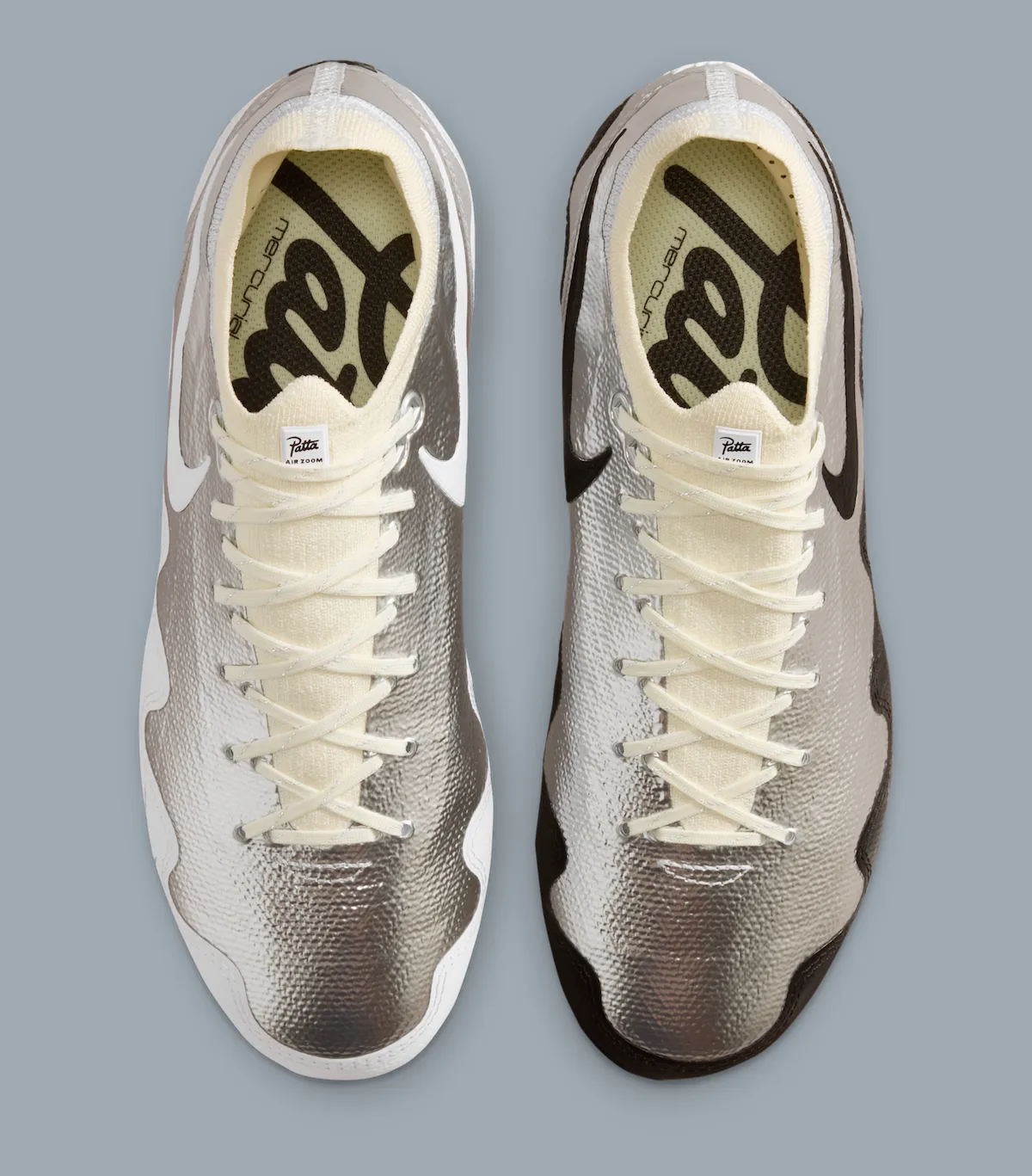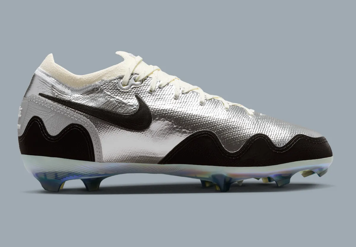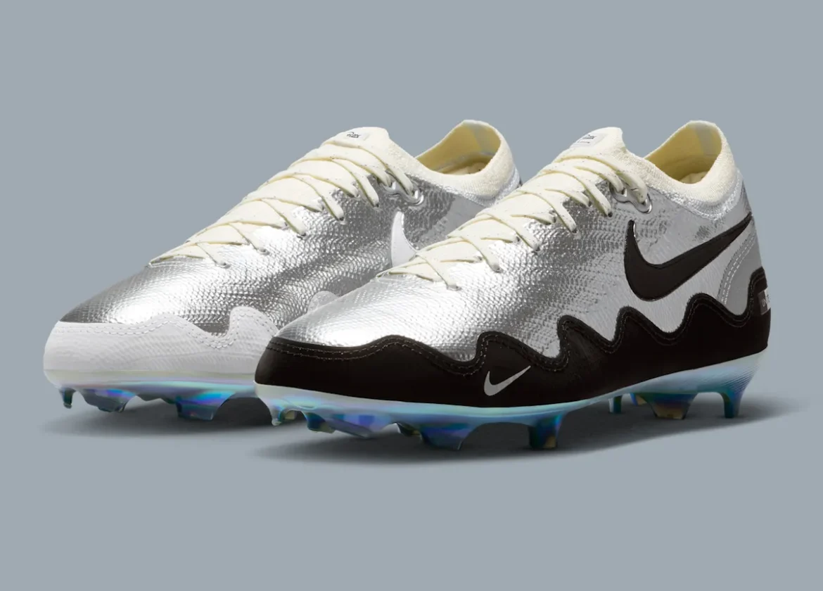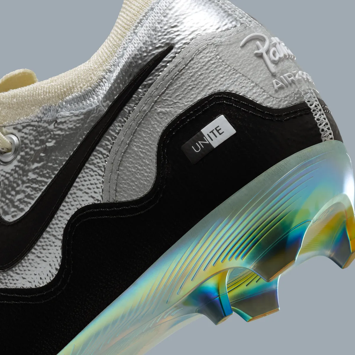 A shimmering chrome upper covers the shell, while black and white wave overlays split the design from left to right. That blocking directly pulls from Patta’s Nike Air Max 1 Waves collabs, combining the “White” and “Black” pairs into one football boot. Cream laces soften the metallic finish, and the iridescent soleplate adds another standout detail that pushes the entire design further on pitch.