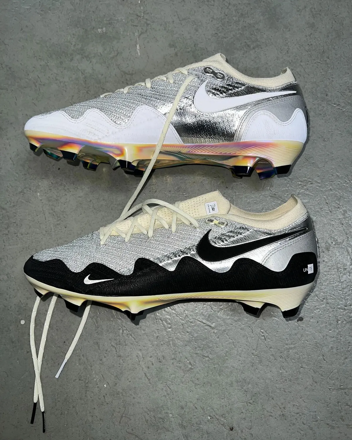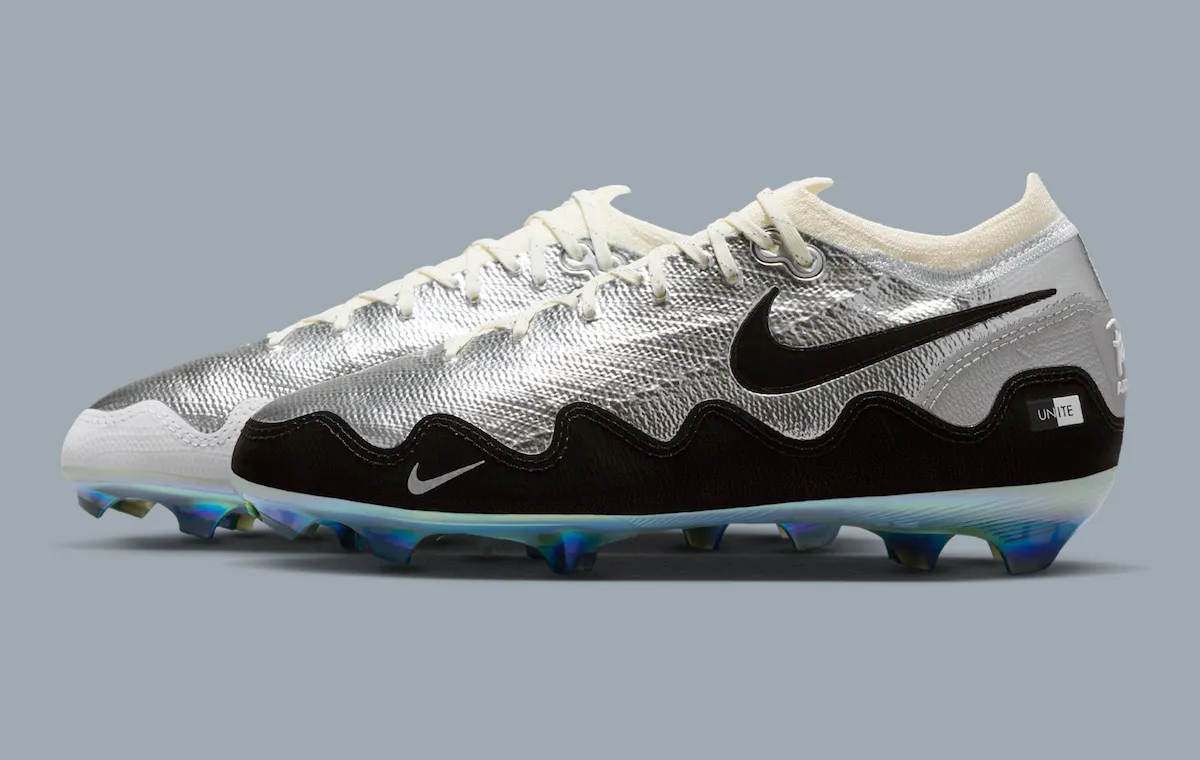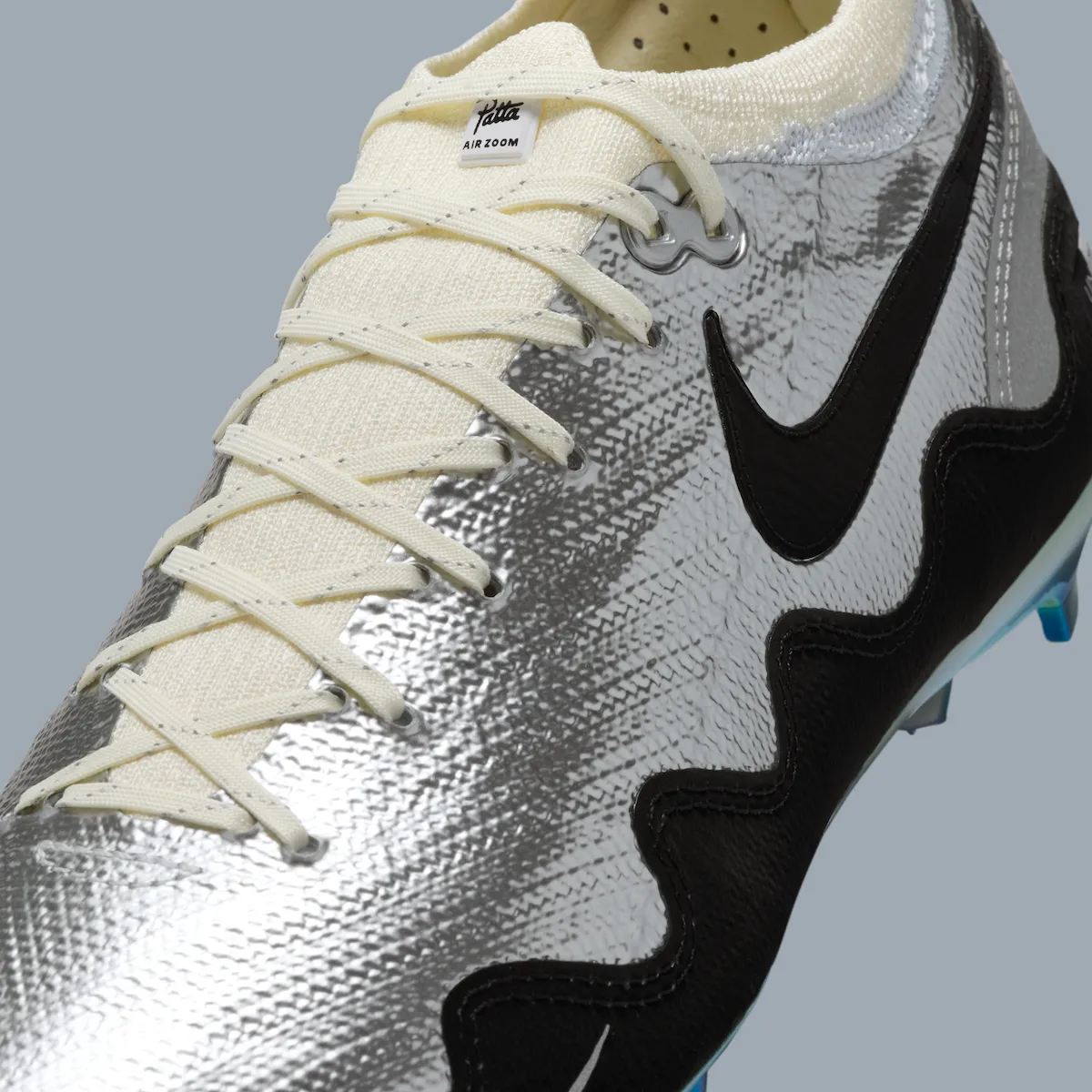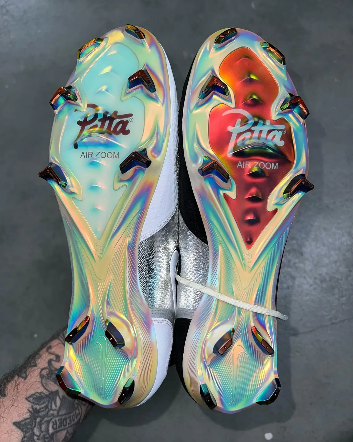 A shimmering chrome upper covers the shell, while black and white wave overlays split the design from left to right. That blocking directly pulls from Patta’s Nike Air Max 1 Waves collabs, combining the “White” and “Black” pairs into one football boot. Cream laces soften the metallic finish, and the iridescent soleplate adds another standout detail that pushes the entire design further on pitch.