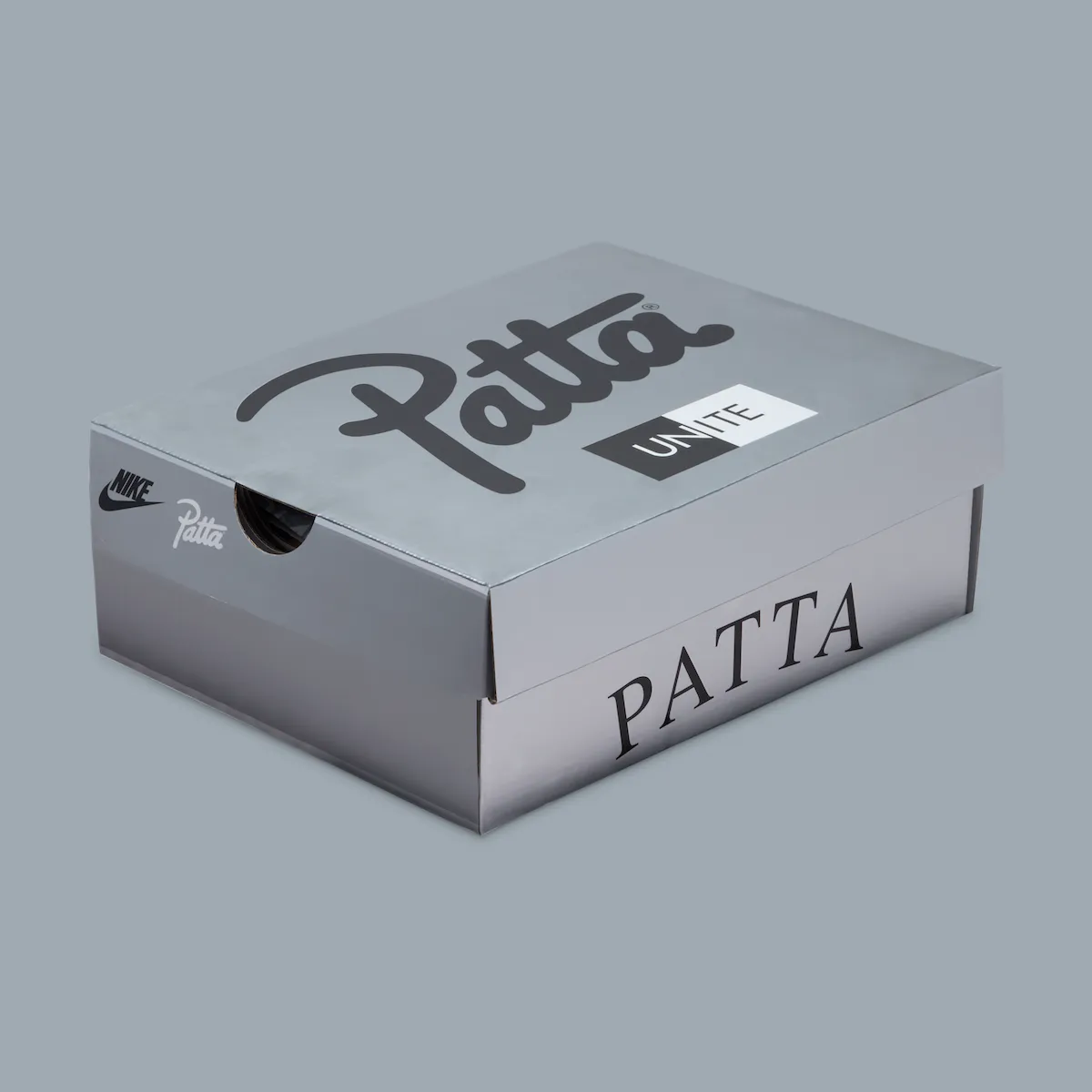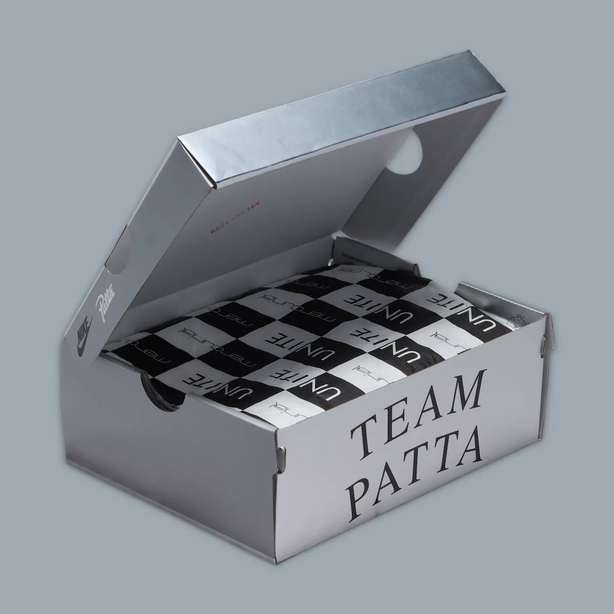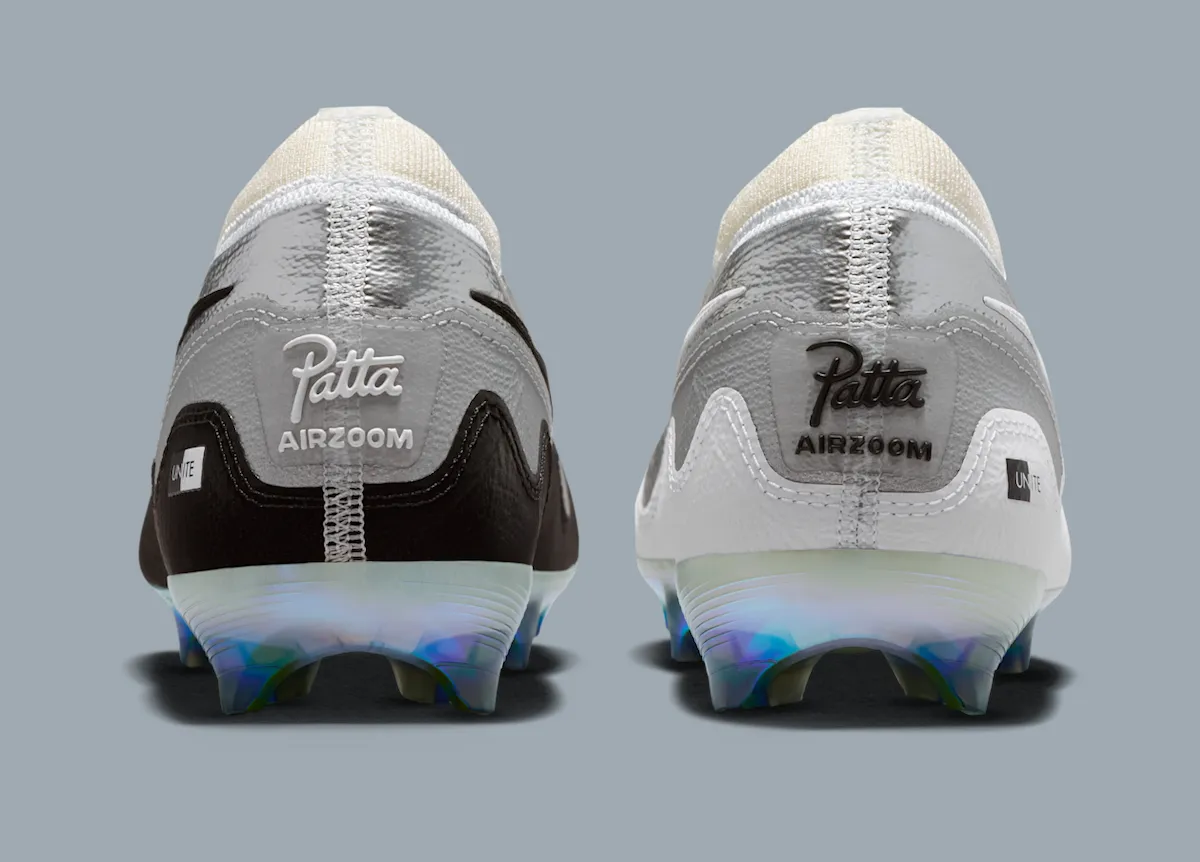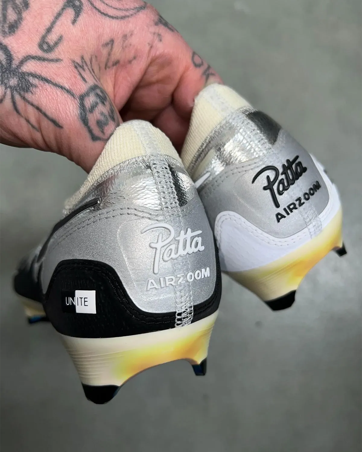 Mini Swooshes near the forefoot, “UNITE” badging on the lateral heel, and Patta Air Zoom branding on the back keep the collaboration details visible without overcrowding the boot. Close-up looks also show special packaging marked “Team Patta,” giving the release an elevated feel beyond the boots themselves. The mismatch theme works especially well here because it ties Patta’s signature visual identity into a performance model that already carries plenty of speed-driven energy.