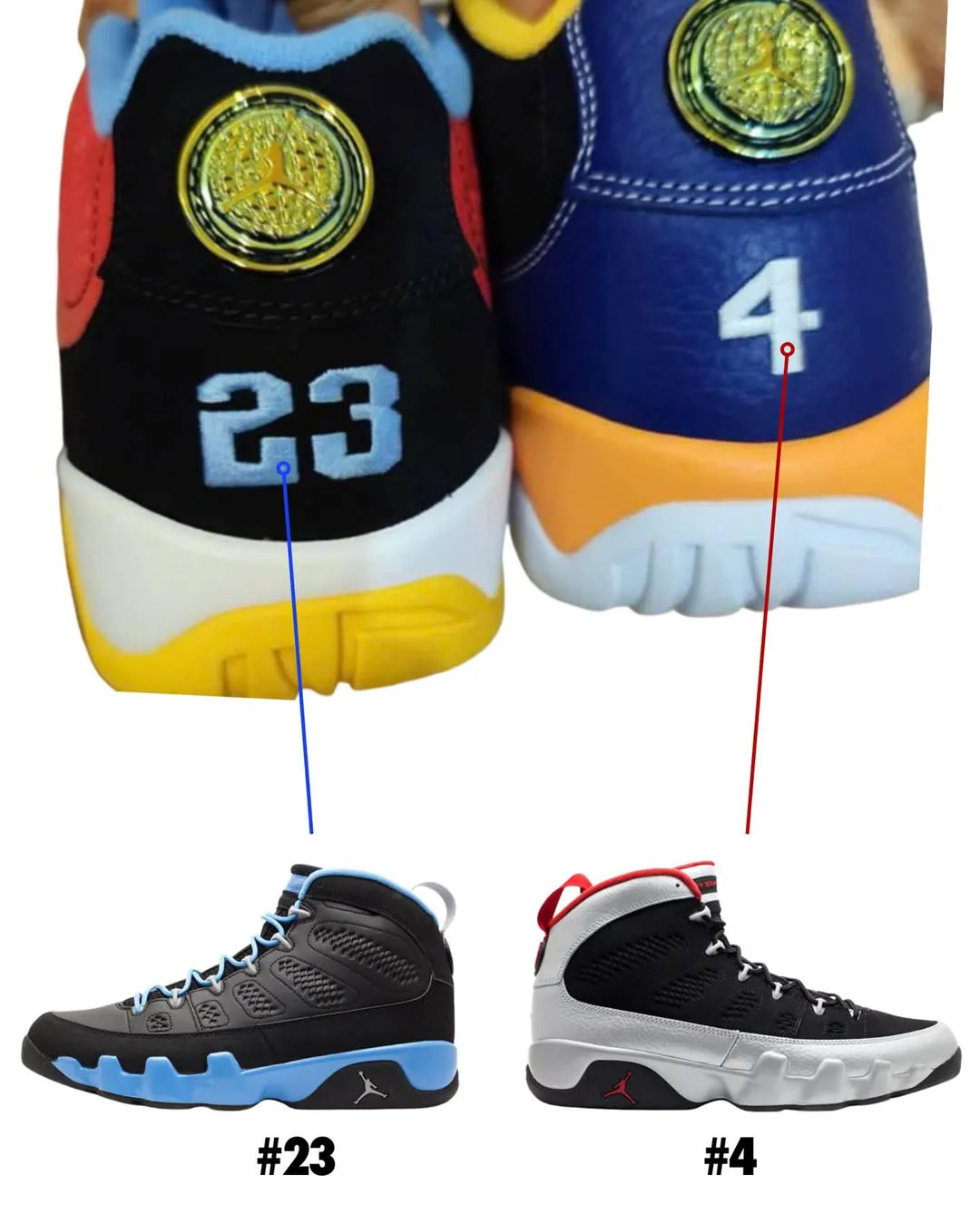 The original Air Jordan 9 “Kilroy Pack” was tied to a campaign built around Michael Jordan’s fictional identities during his retirement from basketball in the mid-1990s. Pairs like Johnny Kilroy, Slim Jenkins, Calvin Bailey, Motorboat Jones, Fontay Montana, and Bentley Ellis each represented a different character from that rollout. This new low-top appears to borrow from those chapters throughout the build, including heel embroidery that references #23 and #4 as another nod to the pack’s backstory.