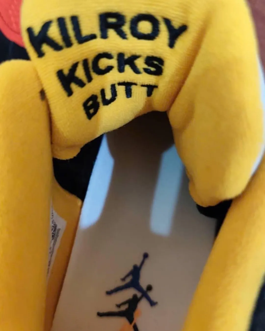 Early images show the pair pulling details from multiple Kilroy Pack colorways at once. One shoe mixes a black upper with blue mudguards, yellow lining, and white laces, while the other shifts to a red leather build with black overlays, light blue lining, and black laces. The mismatched design leans fully into the “What The” concept, but the storytelling is what gives this release more depth than a standard mash-up.