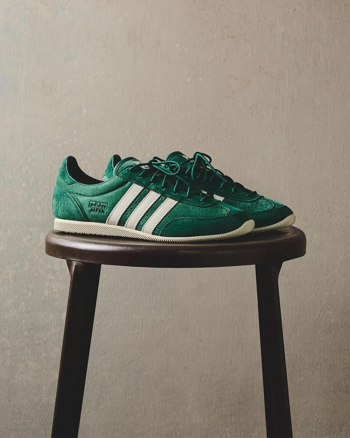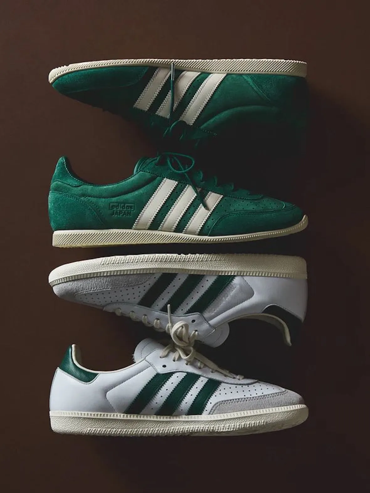The Samba and Japan also return as part of the Spring 2026 lineup in evergreen color schemes built around Collegiate Green, White, and Black. Kith updates the Samba with a leather upper, suede T-toe, perforated toebox, side branding, and alternating heel debossing. The Japan takes a slightly different route with an all-nubuck build, matching perforated detailing, and similar co-branded touches, while standing out as the only pair in the collection to use round laces.