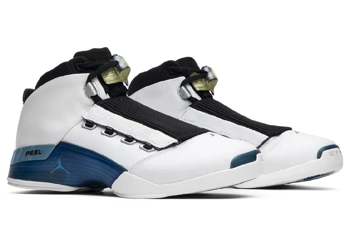 White leather covers the upper, while the signature black removable shroud returns with the model’s music-inspired detailing. College Blue wraps part of the midsole, lace lock, and outsole accents, keeping the colorway true to the original 2002 release. Chrome heel details and the performance-focused cushioning setup also help preserve the look that made the Air Jordan 17 stand apart when it first launched.