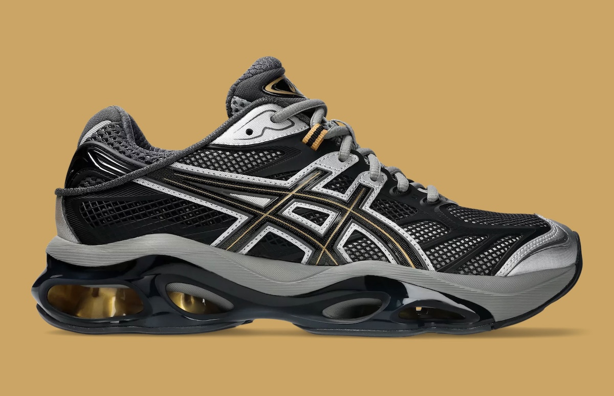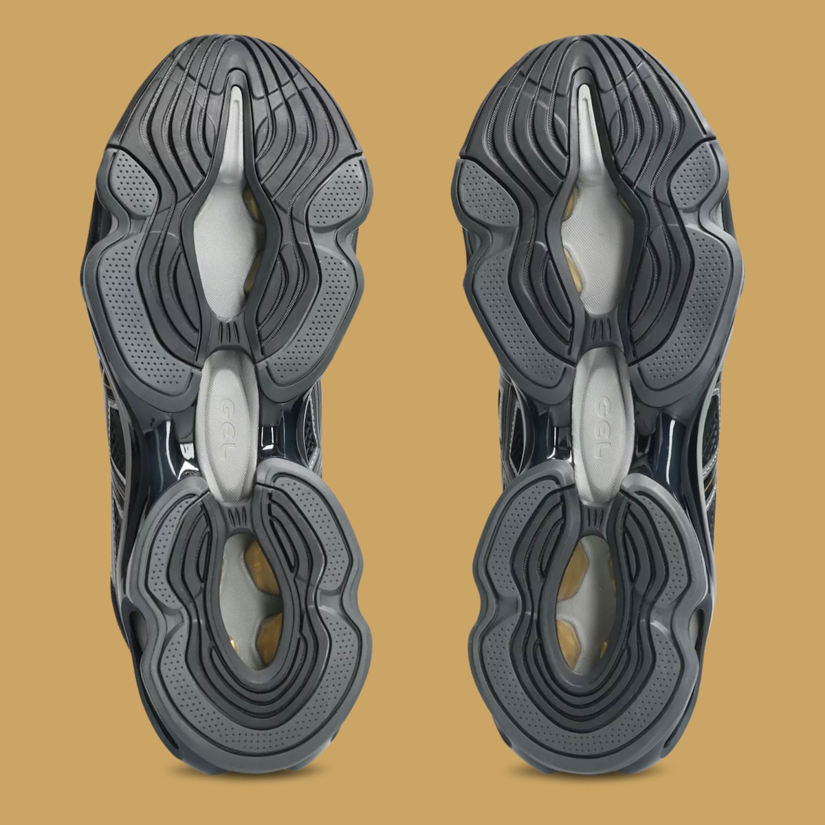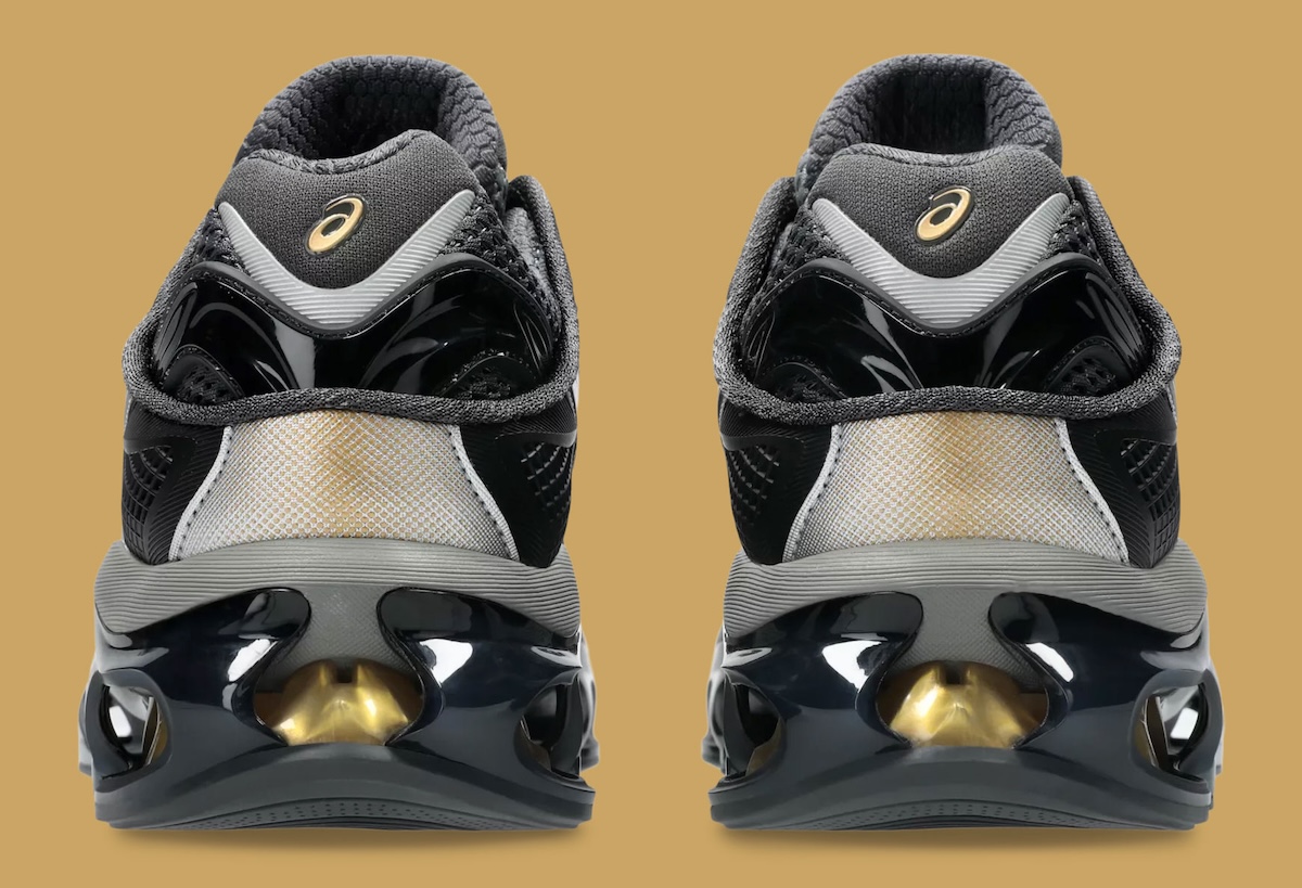 Metallic gold details quietly elevate the color scheme without taking over the shoe. The gold shows up on the tongue branding, lace dubrae detail, outlined ASICS logos, and inside the visible GEL pods, adding just enough pop to break up the black and grey build. That small touch gives the pair a more premium finish and helps it stand apart from standard neutral runners.