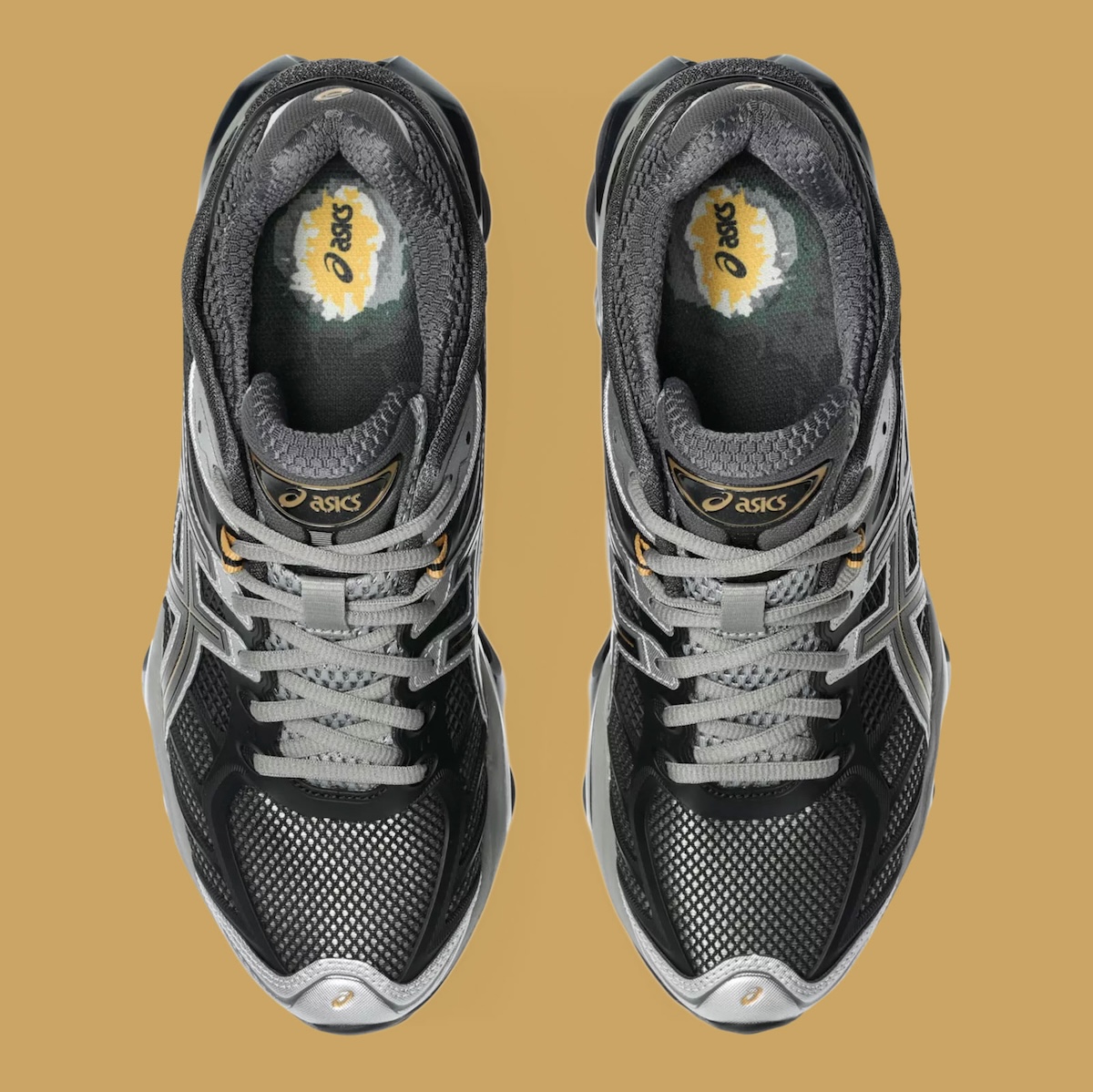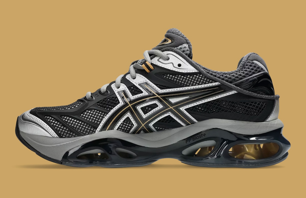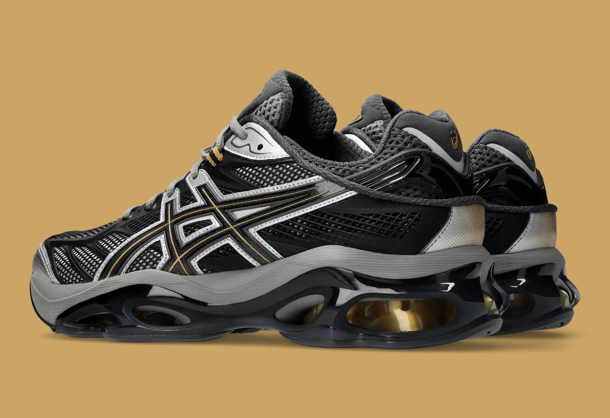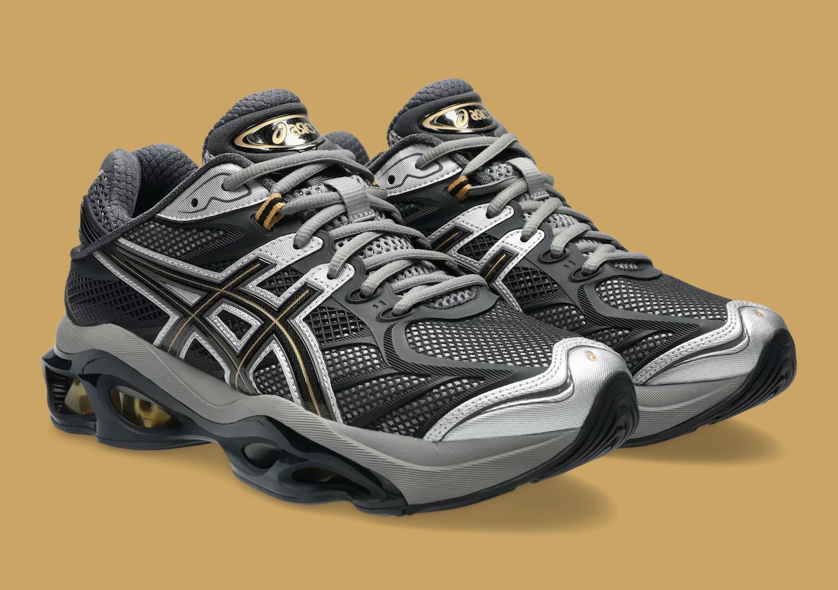 Metallic gold details quietly elevate the color scheme without taking over the shoe. The gold shows up on the tongue branding, lace dubrae detail, outlined ASICS logos, and inside the visible GEL pods, adding just enough pop to break up the black and grey build. That small touch gives the pair a more premium finish and helps it stand apart from standard neutral runners.