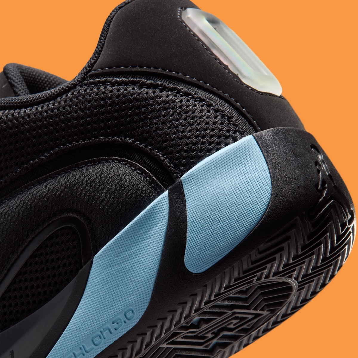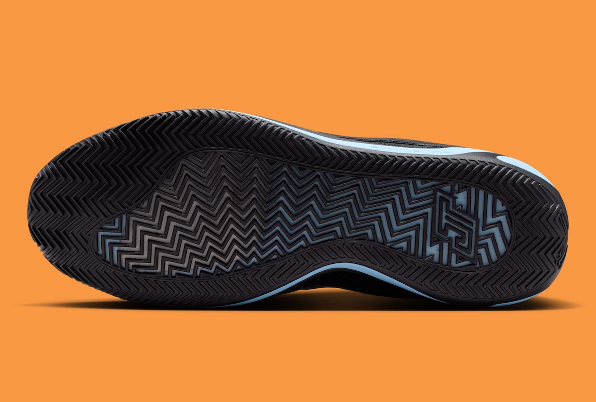 Predominantly black on the upper, we’re seeing what appears to be smooth suede or nubuck-style material on panels while breathable mesh is used on the tongue, collar, and sides of the shoe. The darker tone allows the shoe to remain sleek while bright Ice Blue accents on the midsole pop just enough to stand out. Textured grooves along the sidewalls of the shoe emphasize performance capabilities even further with an aggressive and speedy design.