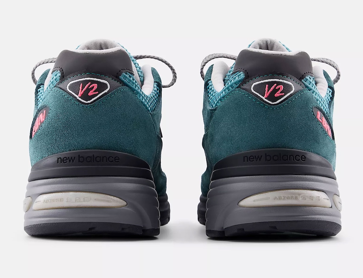 The New Balance 991v2 “London Marathon” sports a bold combination of teal green, aqua blue, and neon pink. Suede overlays are used to ground the pair in the high-end aesthetic the 991v2 is known for, but instead of the standard mesh underlays, NB went another direction. Thicker synthetic material was used on the toe box and side panels of the shoe, utilizing a crosshatch pattern that helps it feel more technical than your average inline offering.