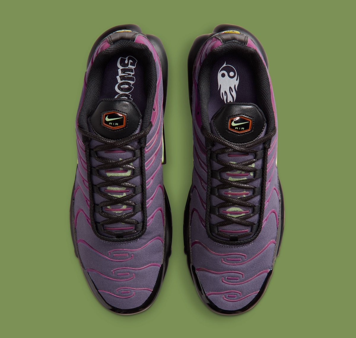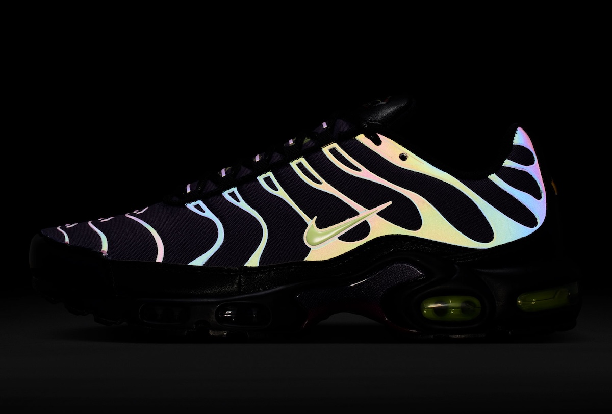 Reflective elements give this Air Max Plus another strong detail. When hit with flash, the cage lights up and completely changes the mood of the shoe. The insoles also add some personality, with one featuring Swoosh branding and the other showing a ghost-like graphic. That mix gives the pair a slightly playful twist against its otherwise dark finish.