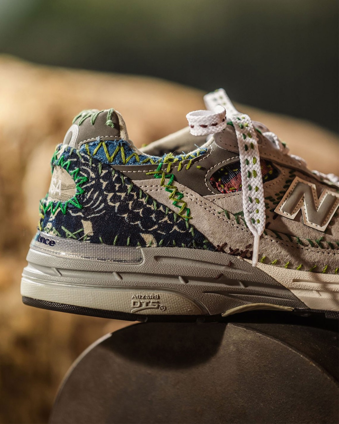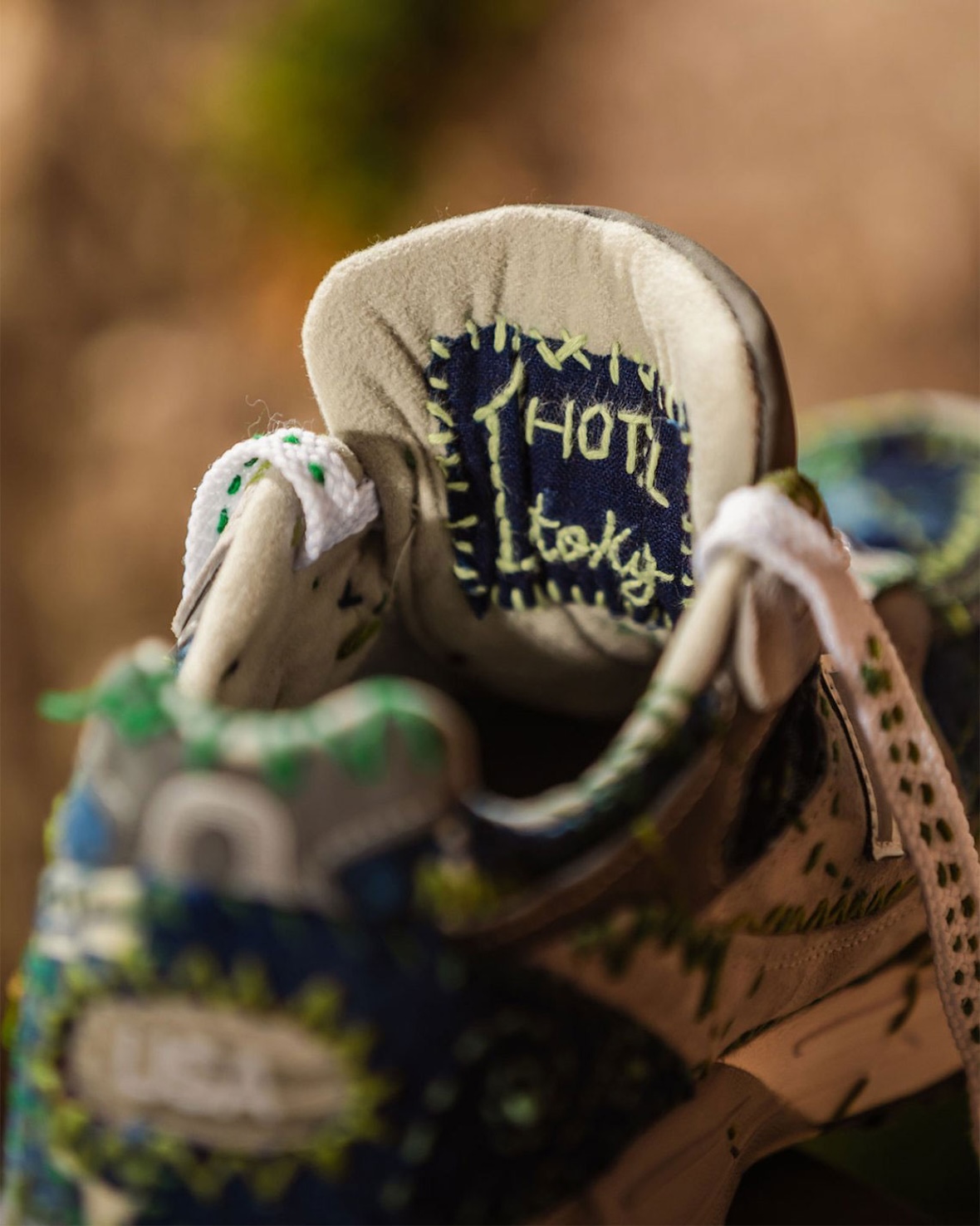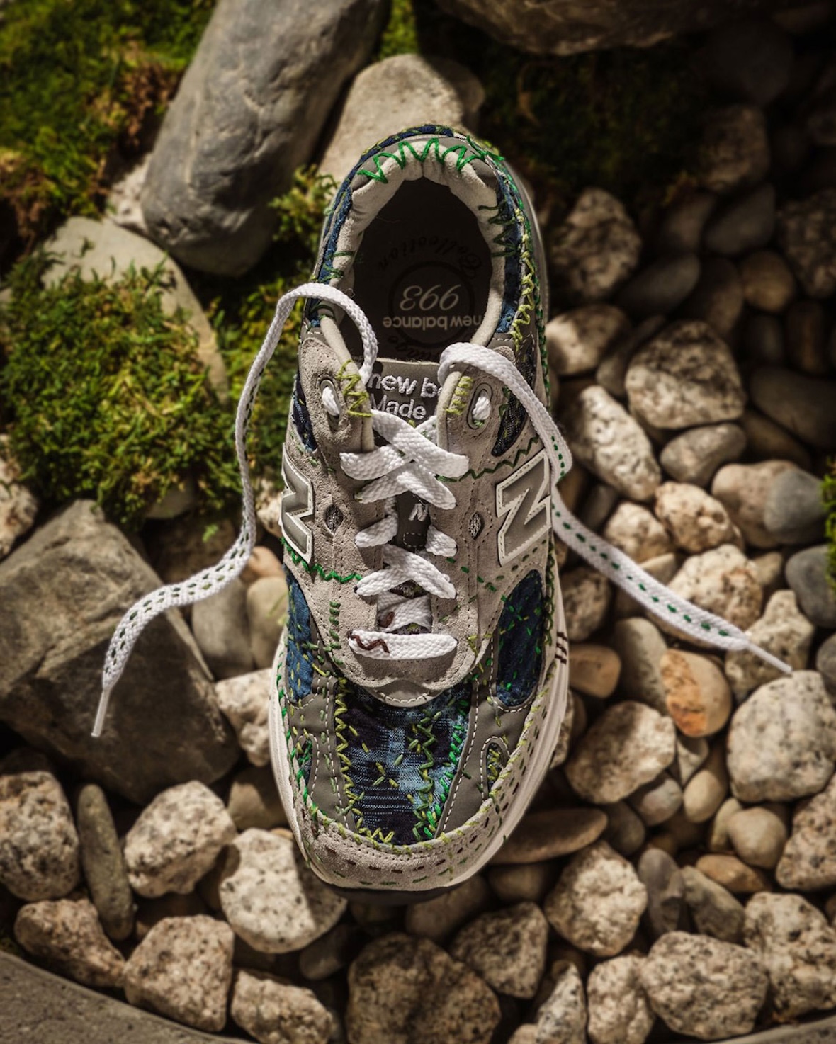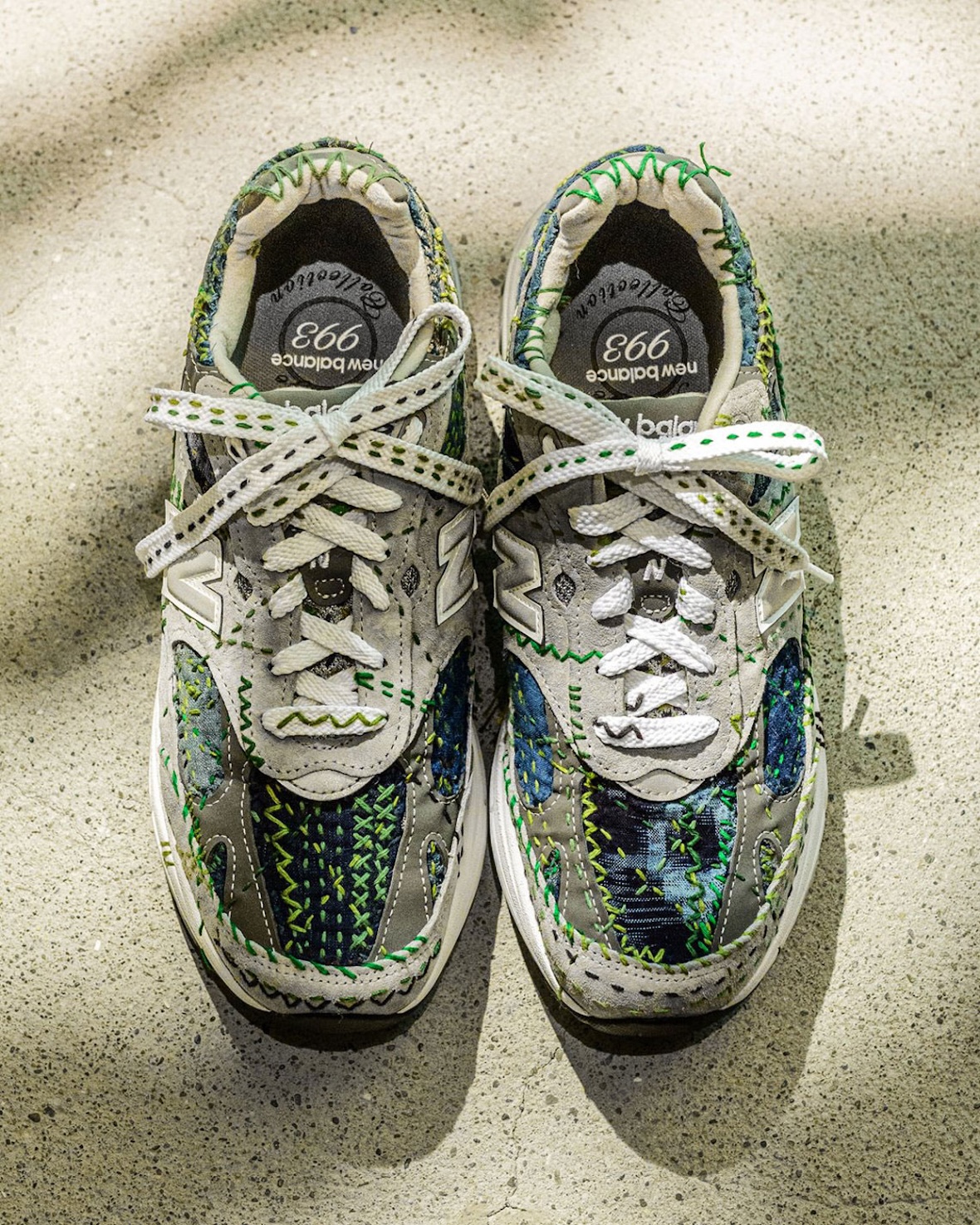 Each pair stands out through visible hand-stitching, layered textile panels, and patchwork details that bring Sashiko Gals’ signature approach to the New Balance 993. The mix of traditional repair-inspired techniques and premium New Balance construction gives the shoe a one-off feel, while the earthy setting at 1 Hotel Tokyo adds even more depth to the presentation. From the exposed stitching to the fabric swaps, the design leans heavily into craft, reuse, and Japanese textile influence.