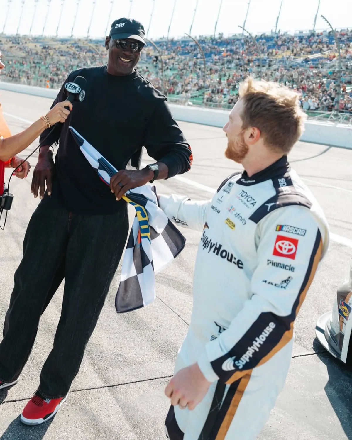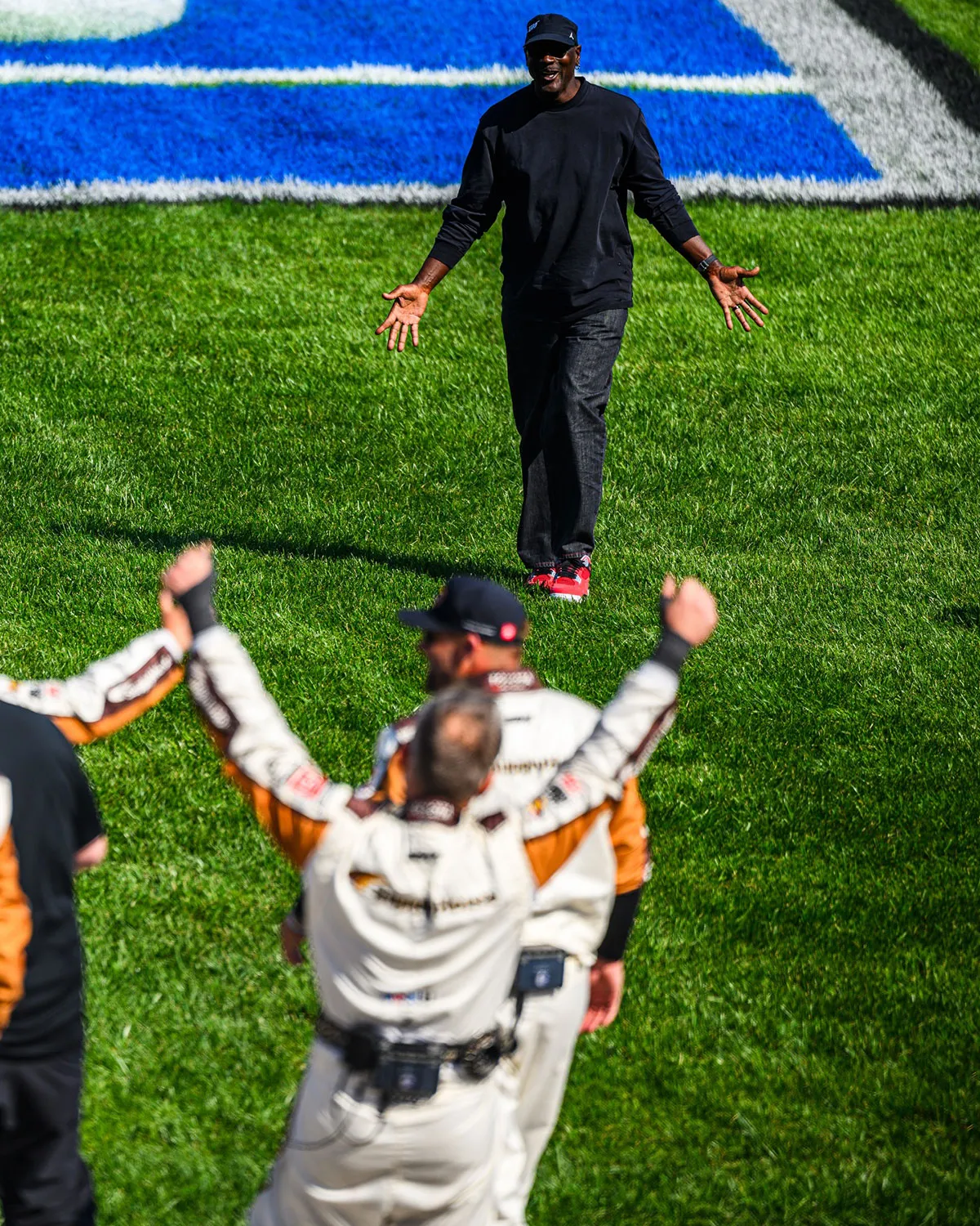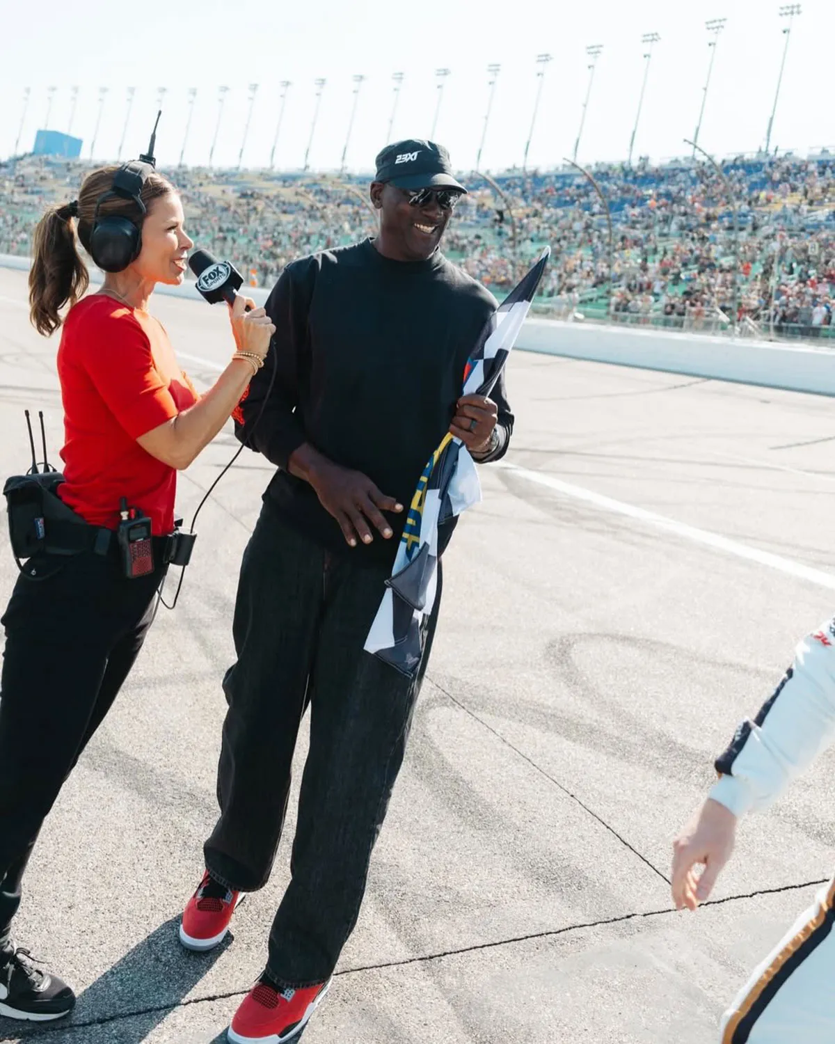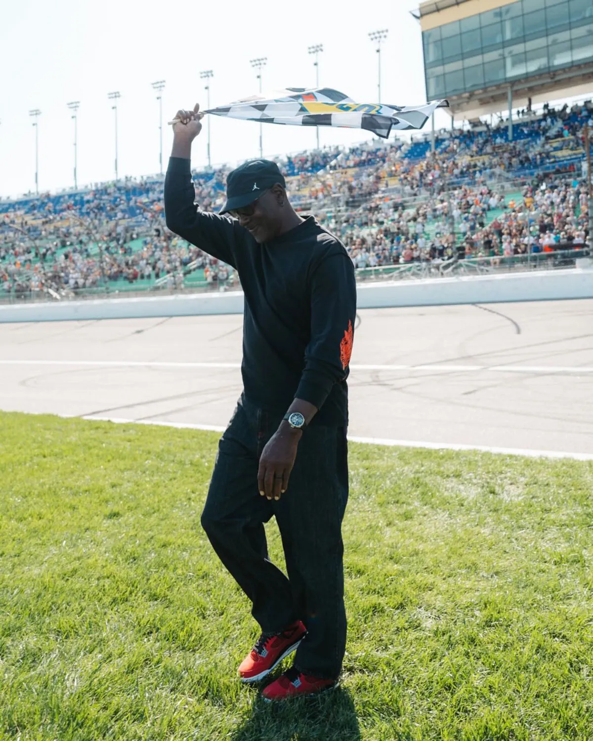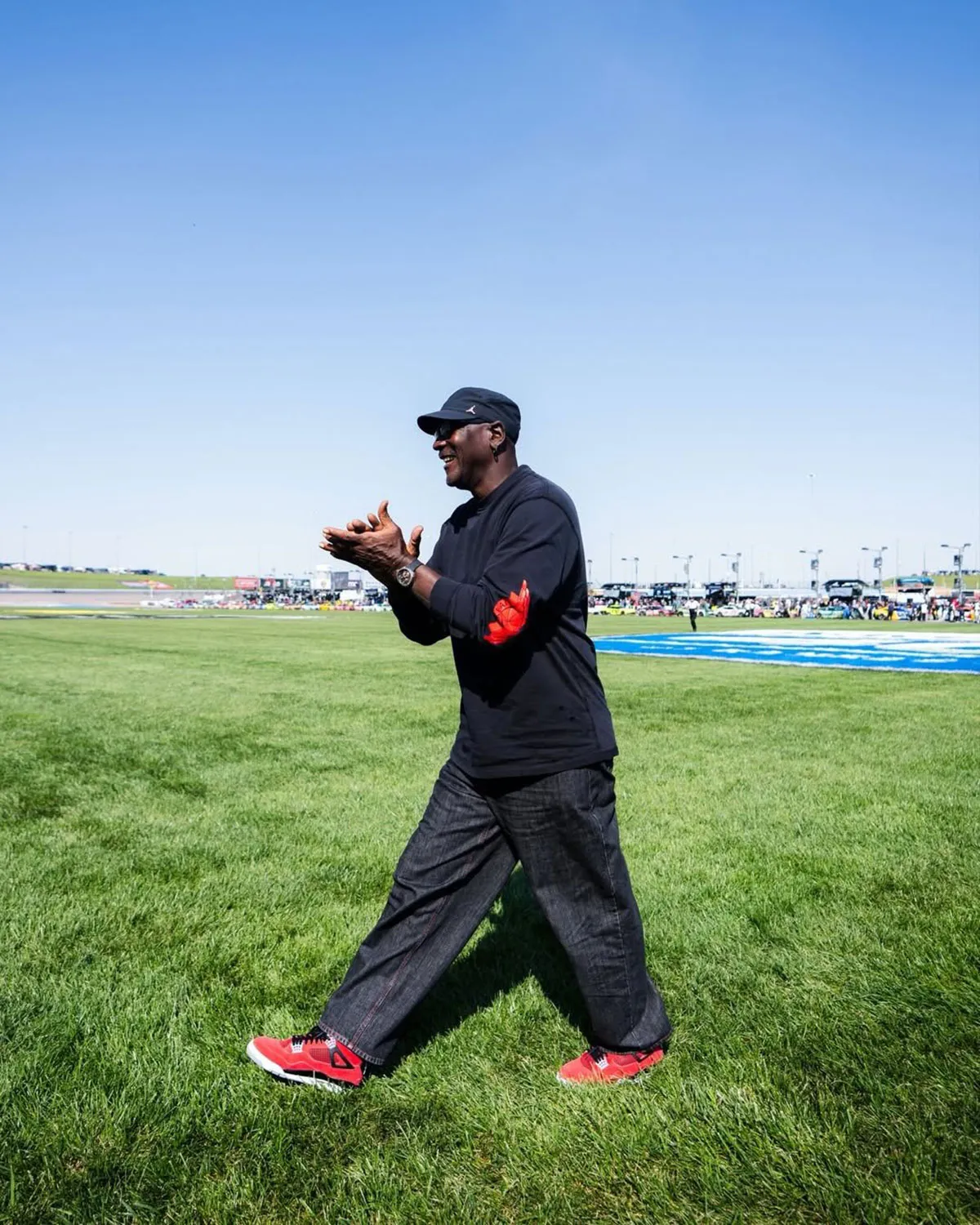 Michael Jordan pulled up to the AdventHealth 400 in a familiar retro, wearing the Air Jordan 4 “Toro Bravo” while taking in another strong weekend for 23XI Racing. His appearance also came with the kind of relaxed, oversized denim look that has become part of his off-court signature over the years.