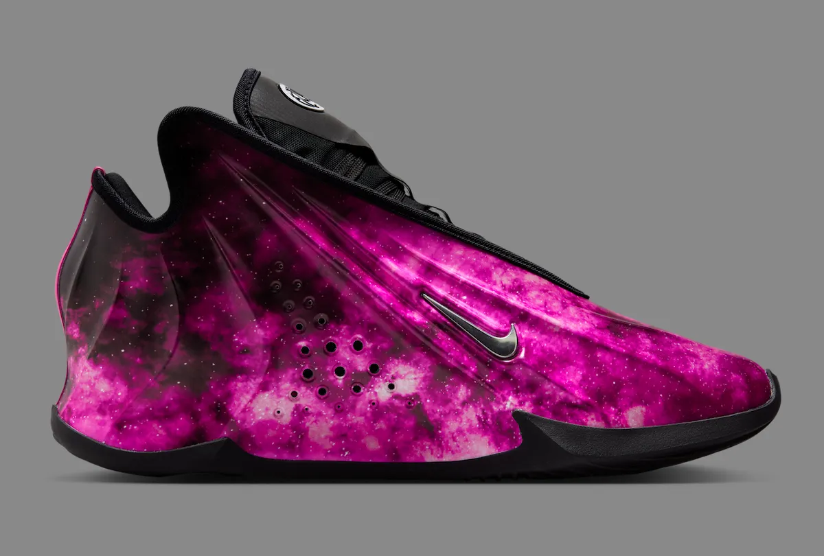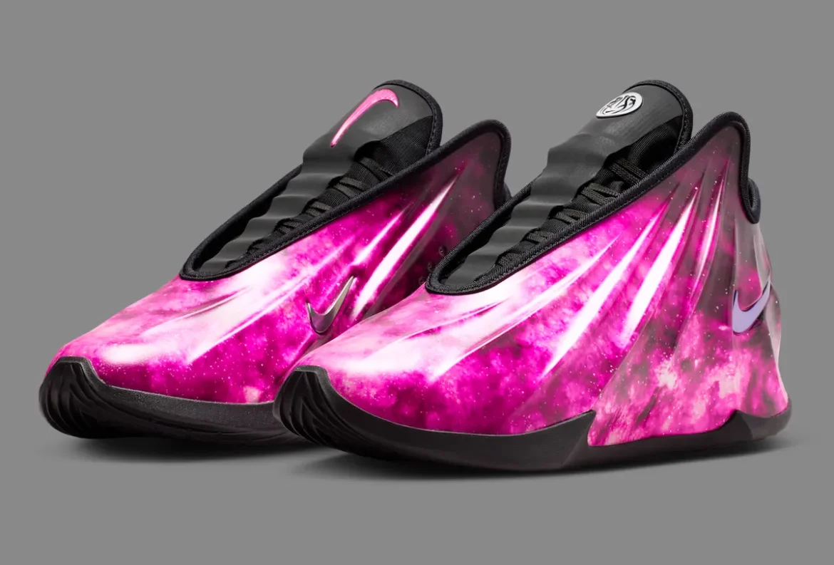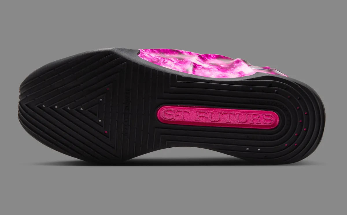 The Nike GT Future CHBL PE brings one of the model’s most striking looks yet with a bright pink galaxy finish across its molded upper. Designed for the Chinese High School Basketball League, the pair continues to push the futuristic shape of the GT Future with a print that covers the shell in cloudy pink tones and scattered star-like speckles.